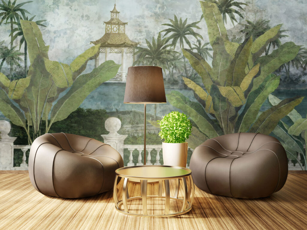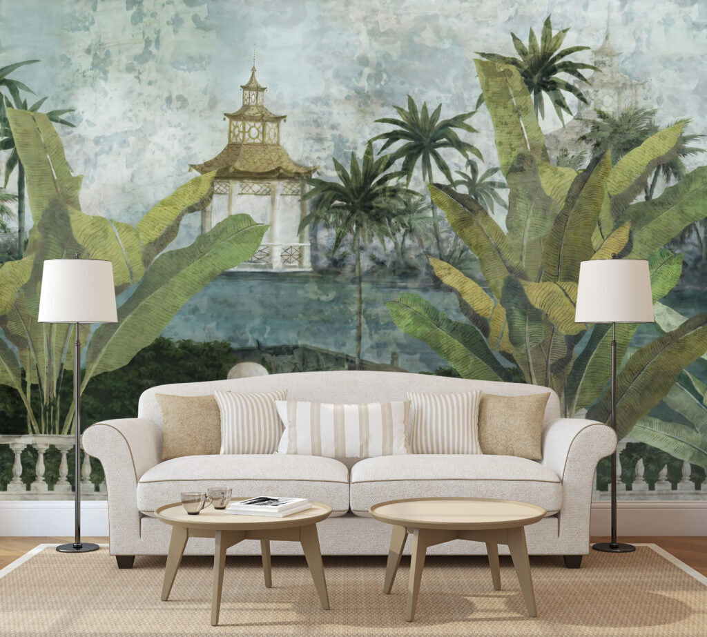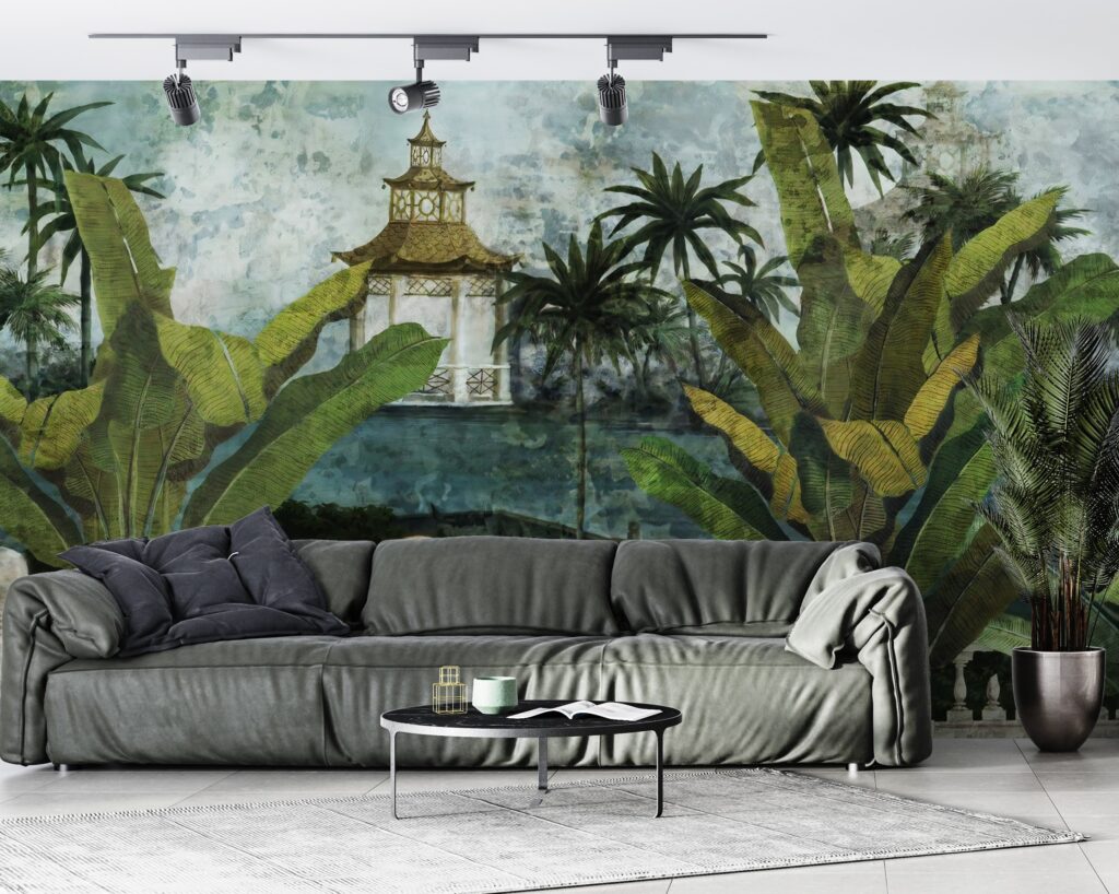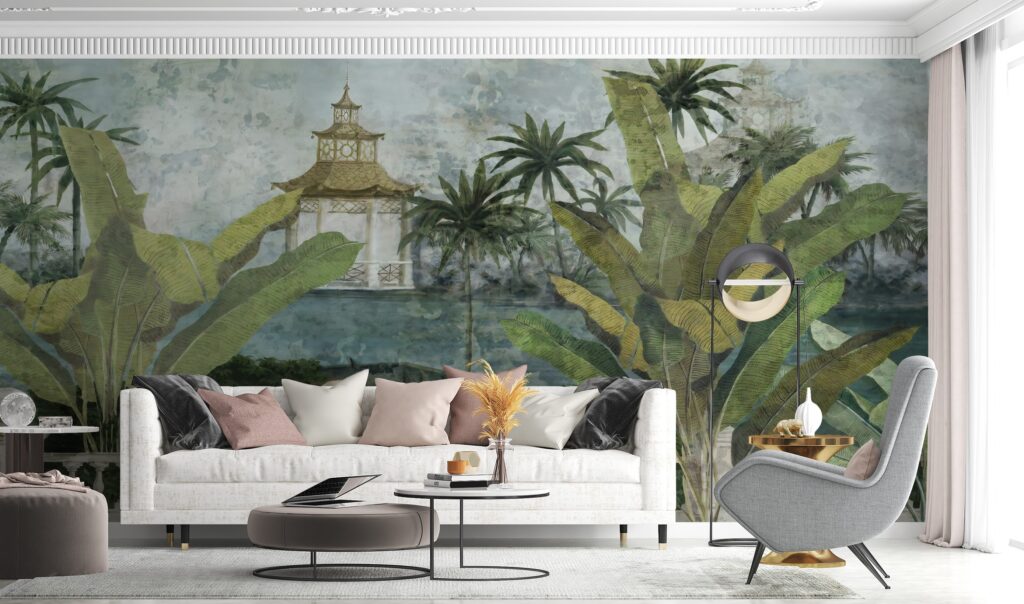 3D Ev ve Ağaç Desenli Tropikal Duvar Kağıdı