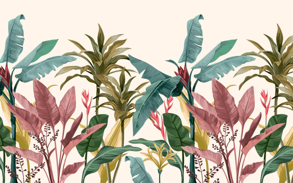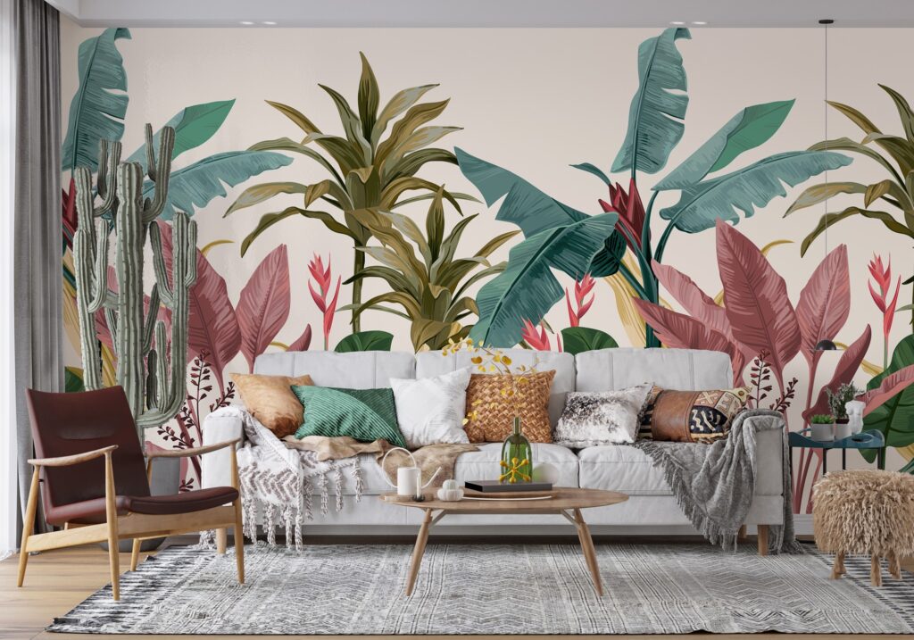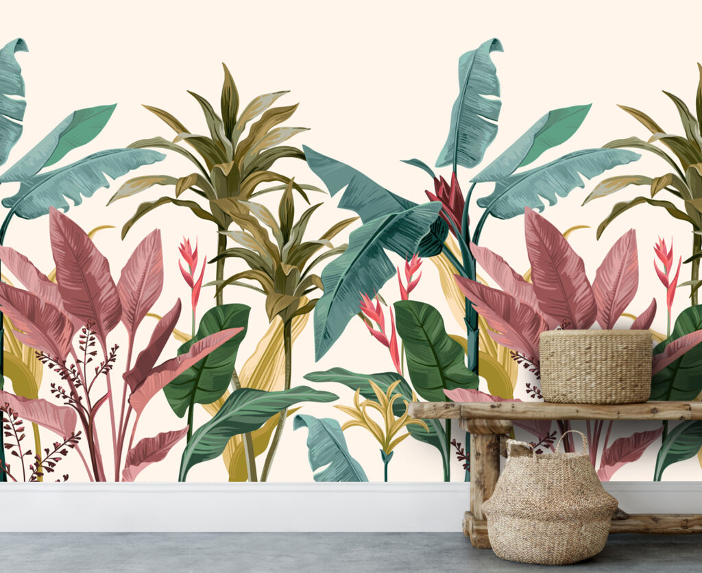3D Farklı Renkte Bitki ve Ağaç Desenli Tropikal Duvar Kağıdı