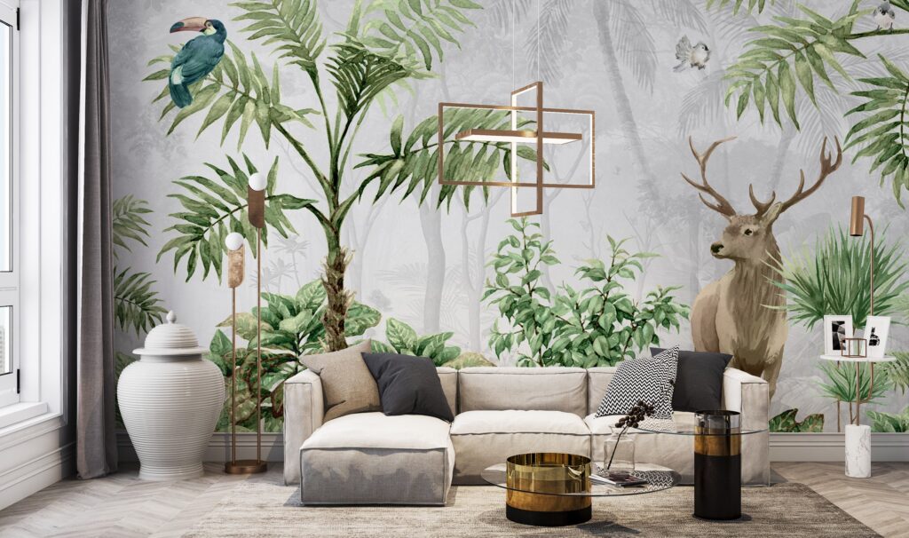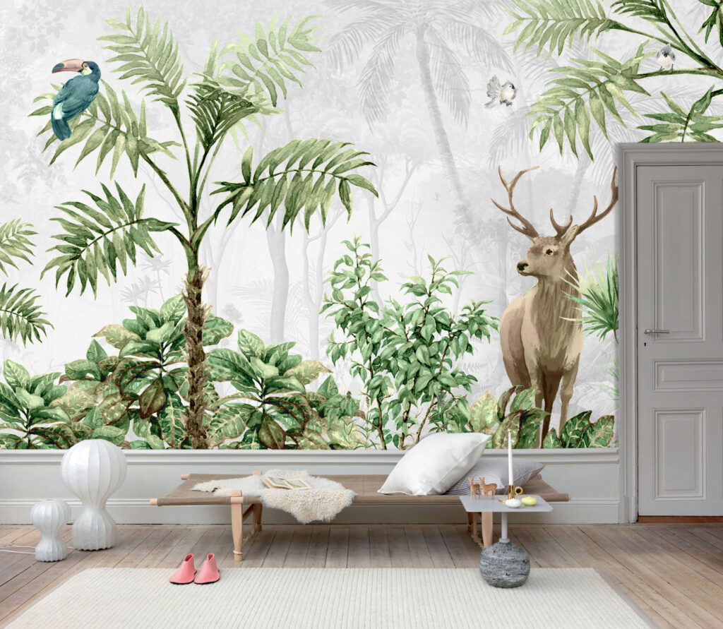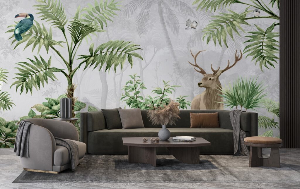 3D Geyik ve Ağaç Desenli Tropikal Duvar Kağıdı