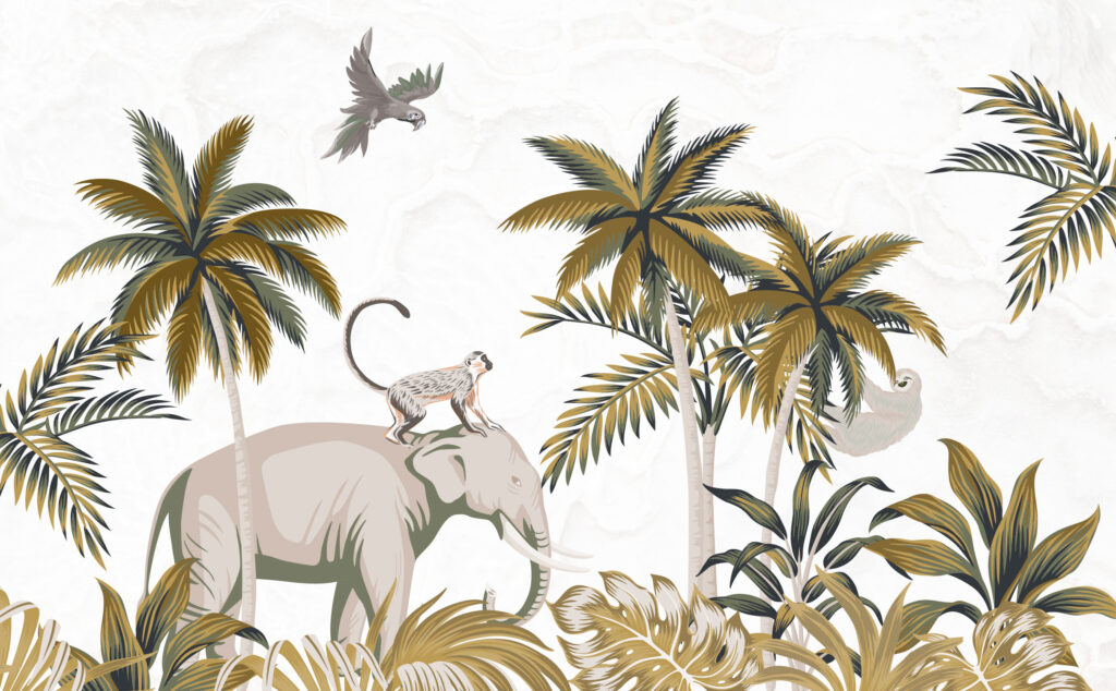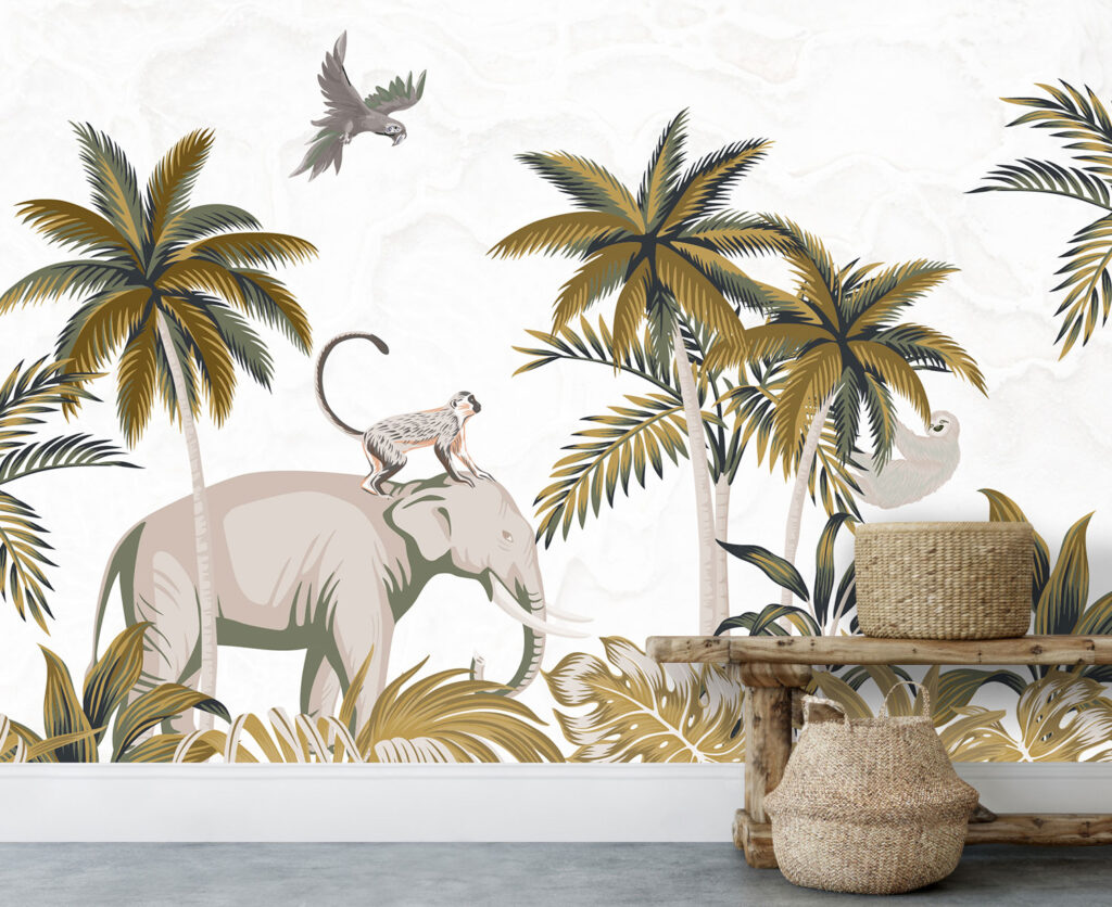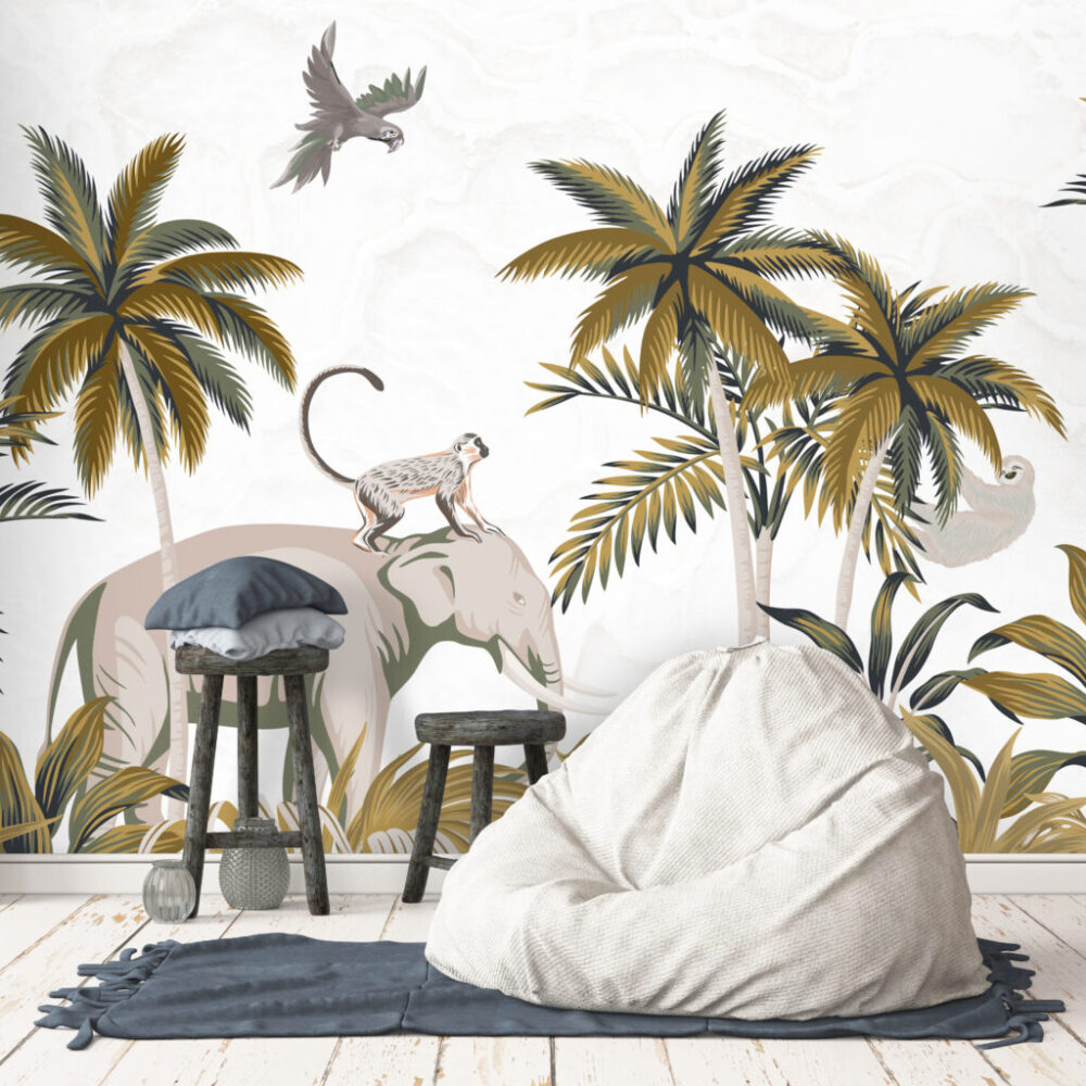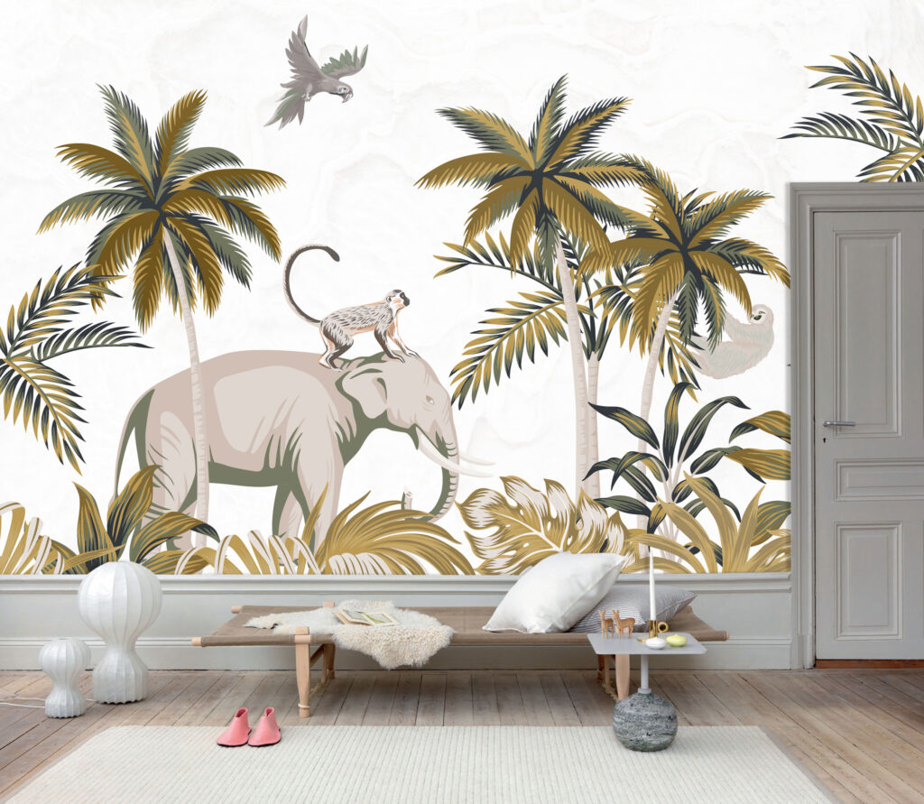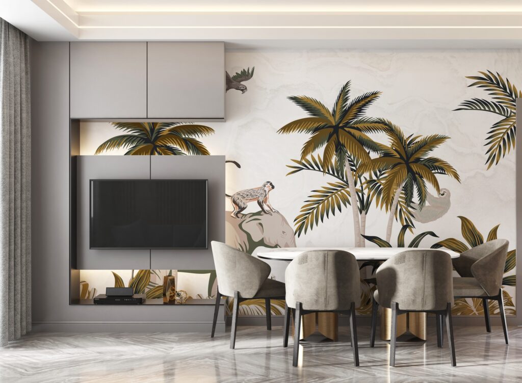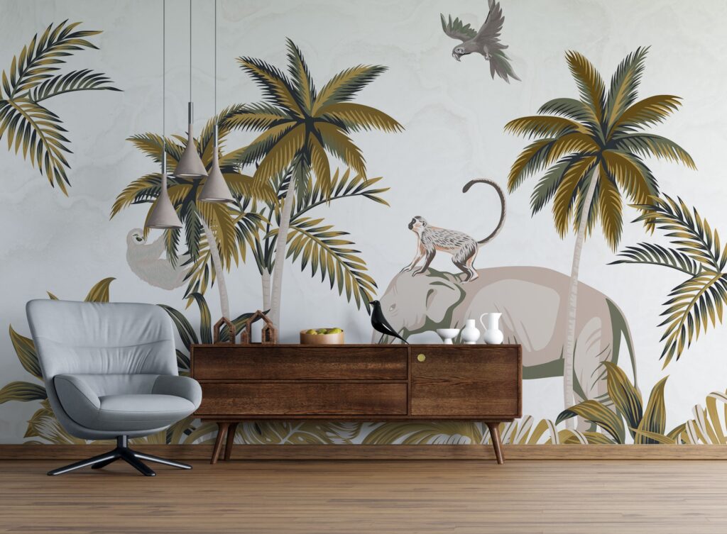 3D Hayvan ve Palmiye Ağaç Desenli Tropikal Duvar Kağıdı