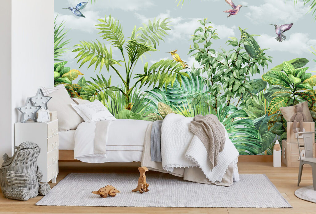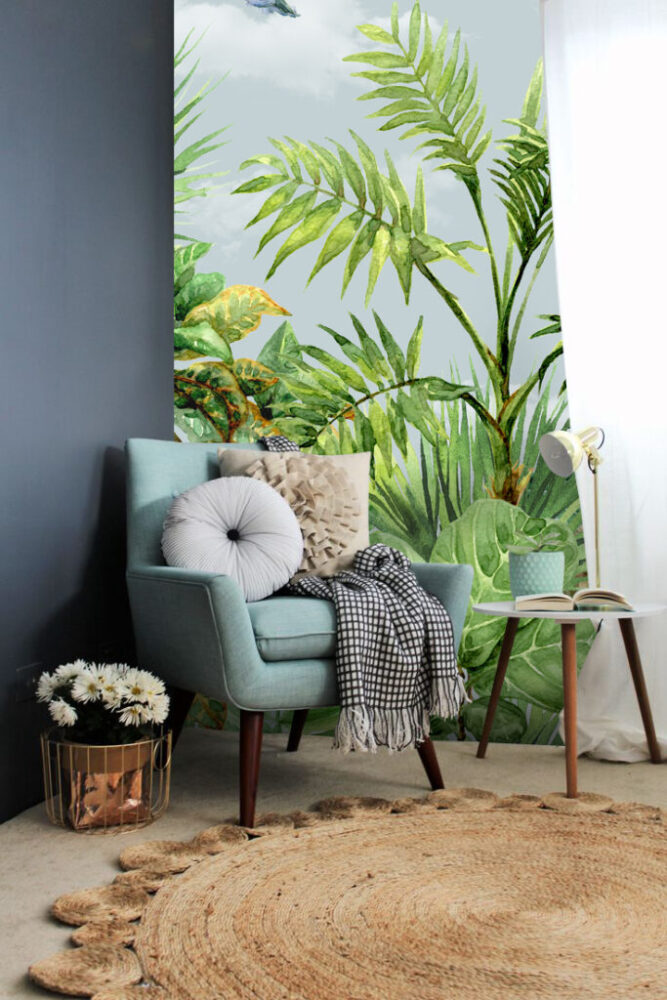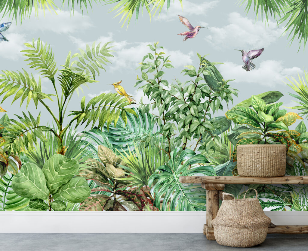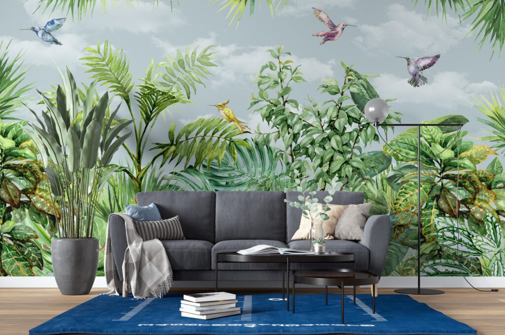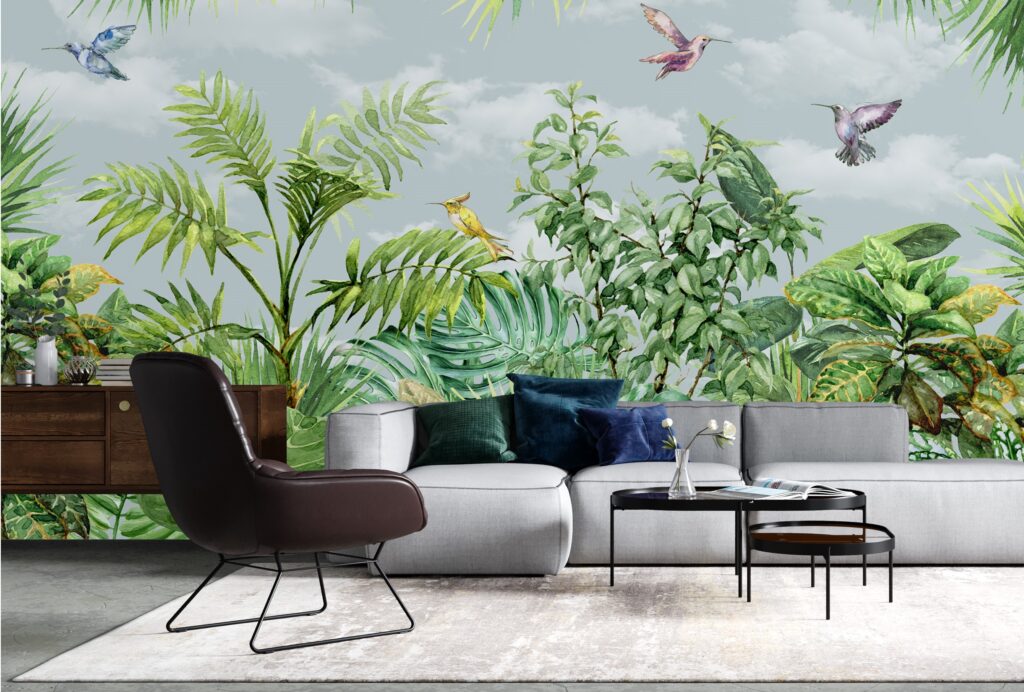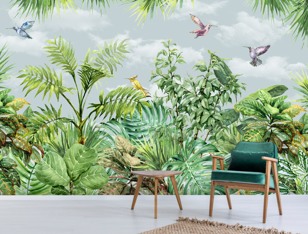 3D Kuş ve Yeşil Yapraklı Bitki Desenli Tropikal Duvar Kağıdı üretimi, uygulanmasını isteyeceğiniz boyut ve konumuna uygun olarak talepleriniz doğrultusunda size özel imal edilir.