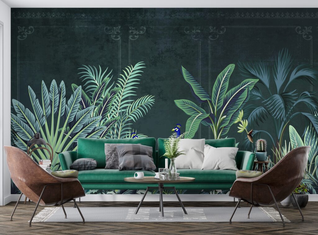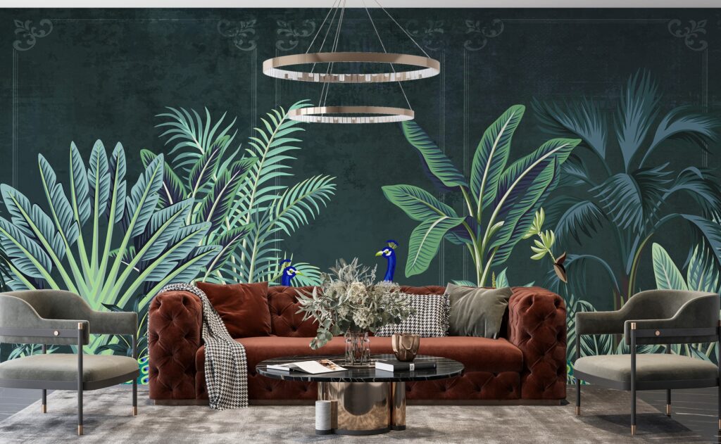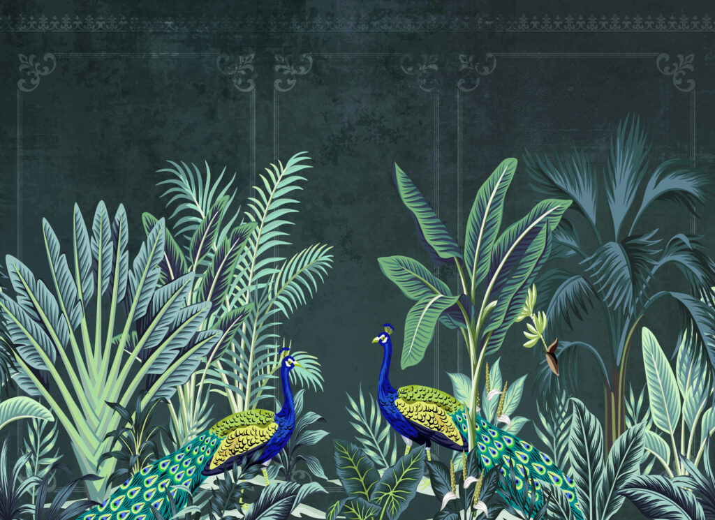 3D Tavus Kuşu ve Bitki Desenli Tropikal Duvar Kağıdı