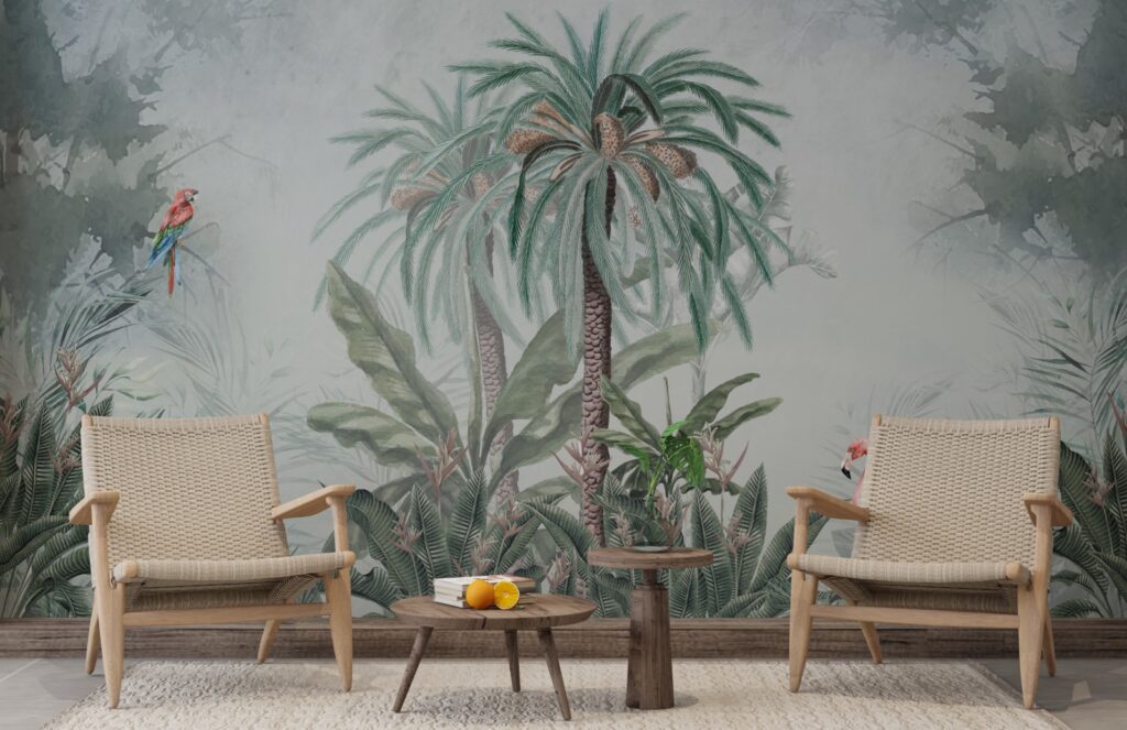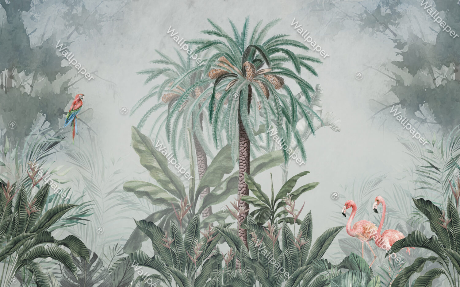 3D Tropikal Flamingolu ve Papağanlı Duvar Kağıdı