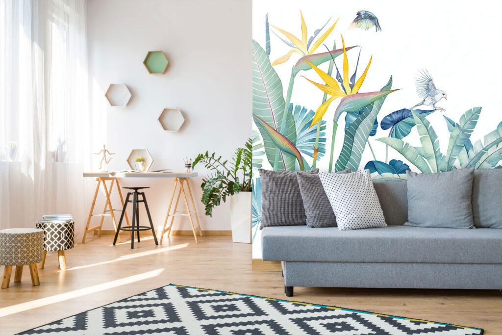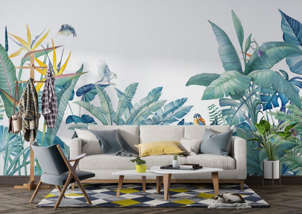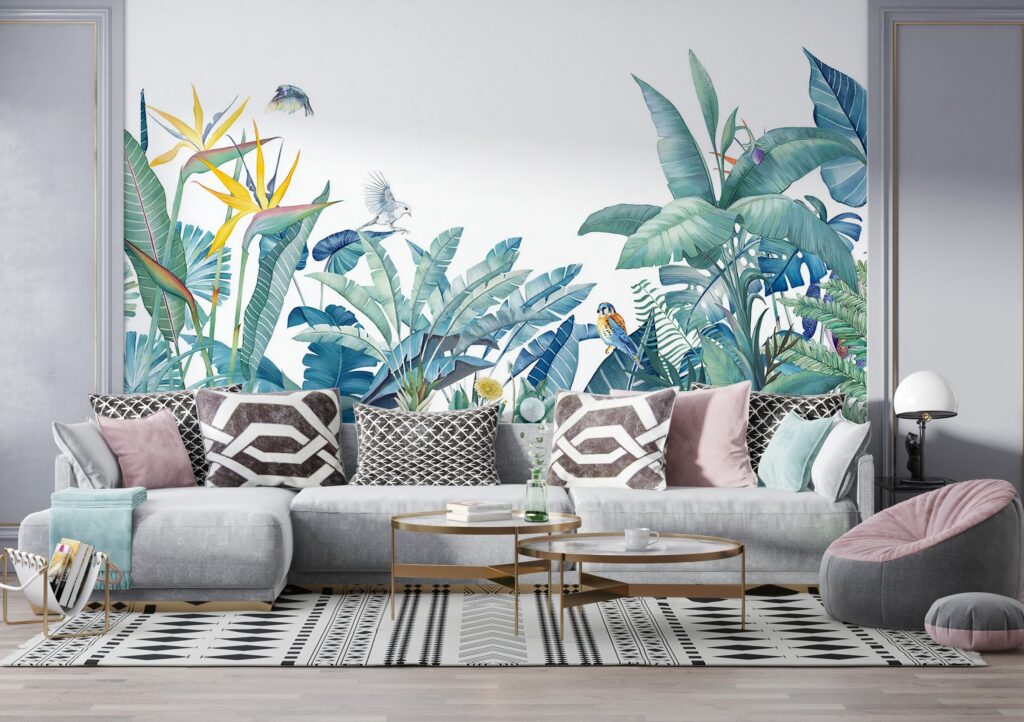 Ağaç Üzerindeki Kuşlar ve Çiçek Desenli Tropikal Duvar Kağıdı üretimi, uygulanmasını isteyeceğiniz boyut ve konumuna uygun olarak talepleriniz doğrultusunda size özel imal edilir.