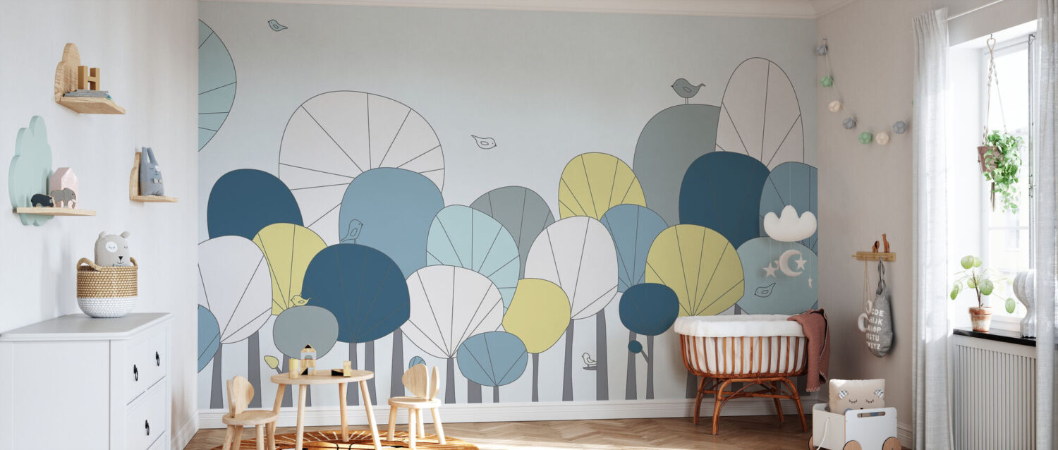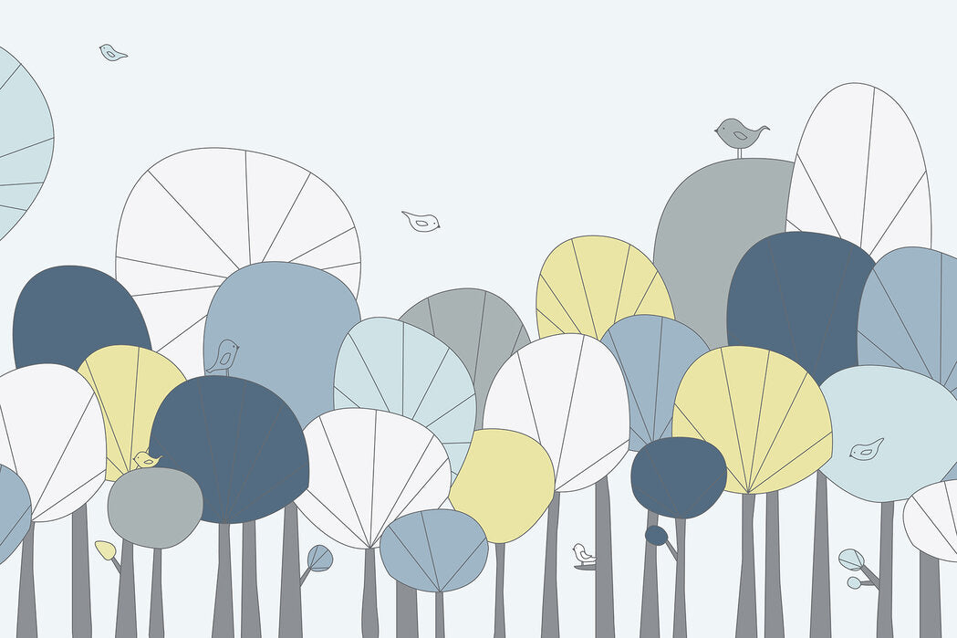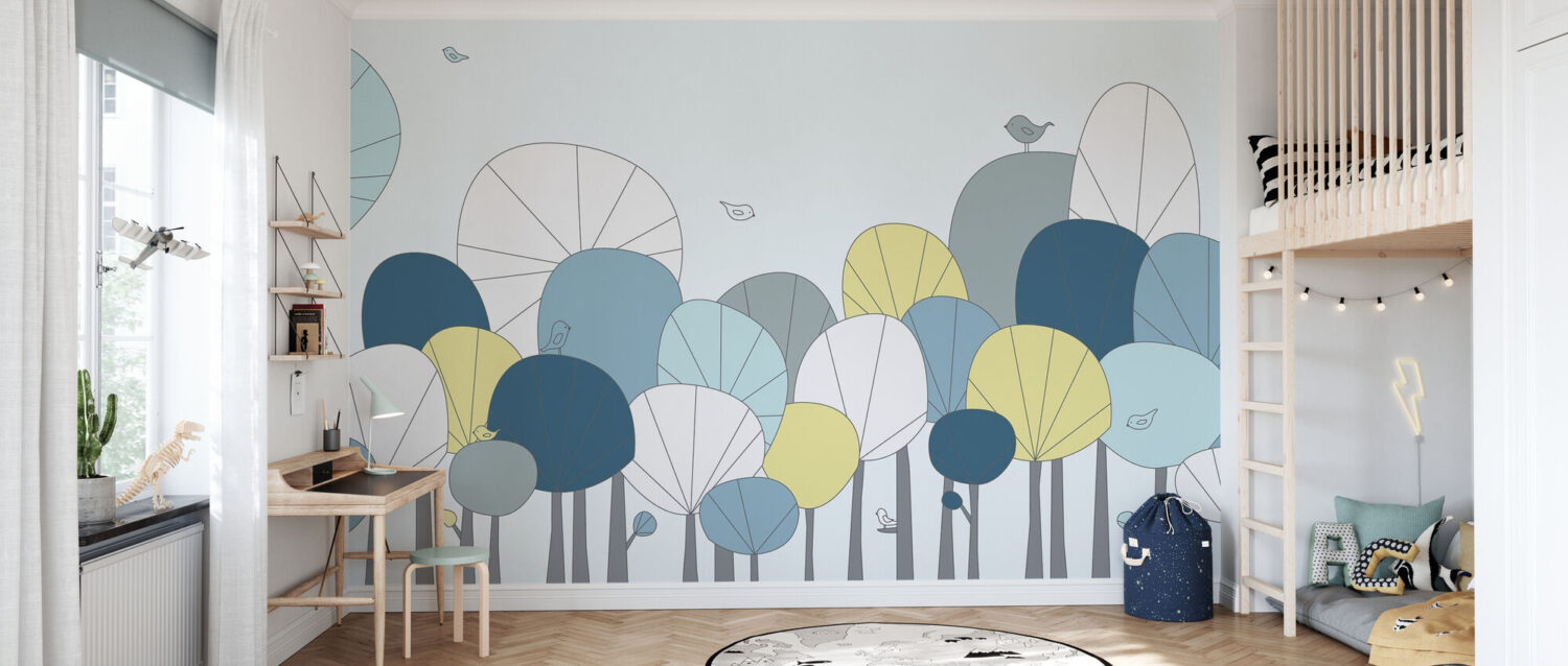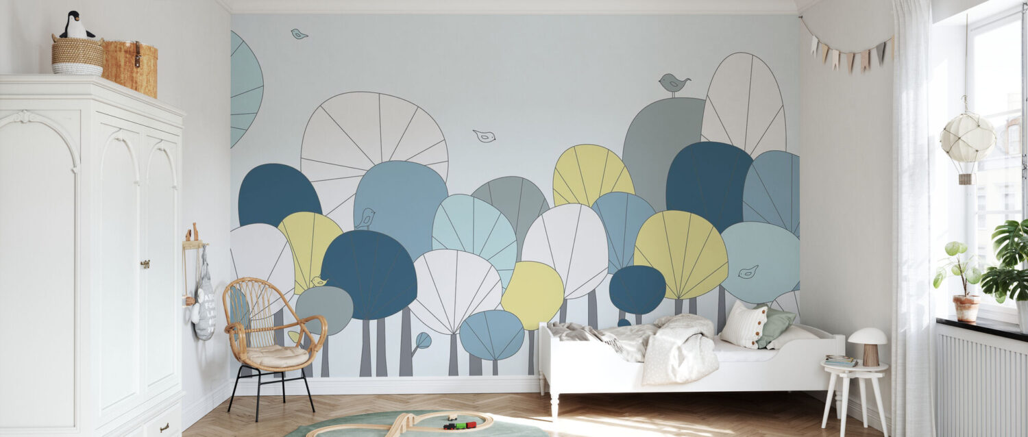 Ağaçlar ve Kuşlar Mavi Tonlarda Duvar Kağıdı