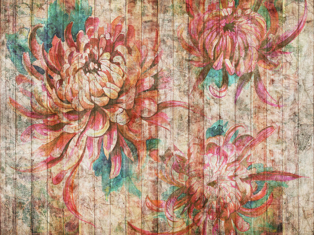 Ahşap Zeminli Pembe Renkli Çiçekler 3D Duvar Kağıdı