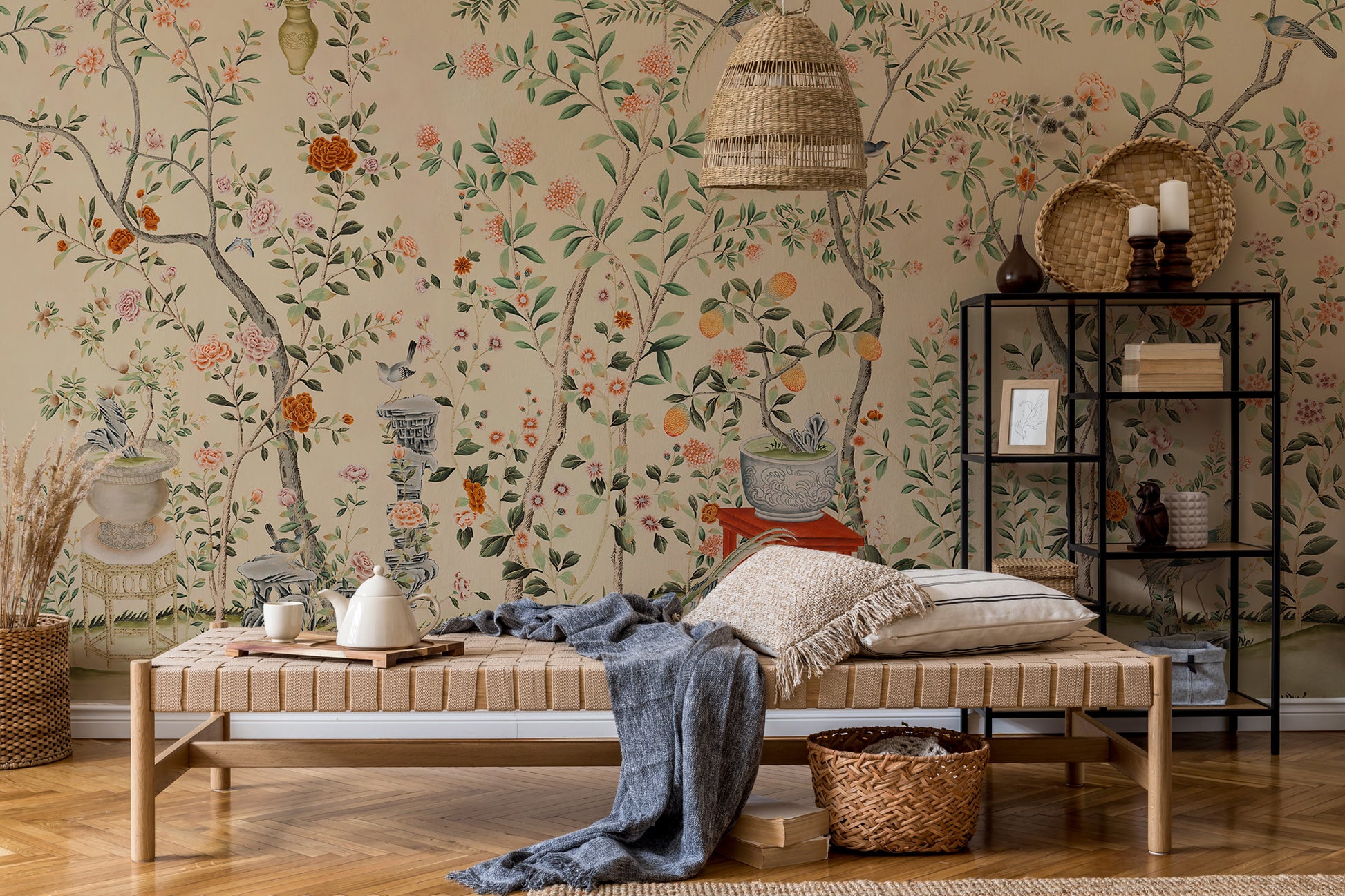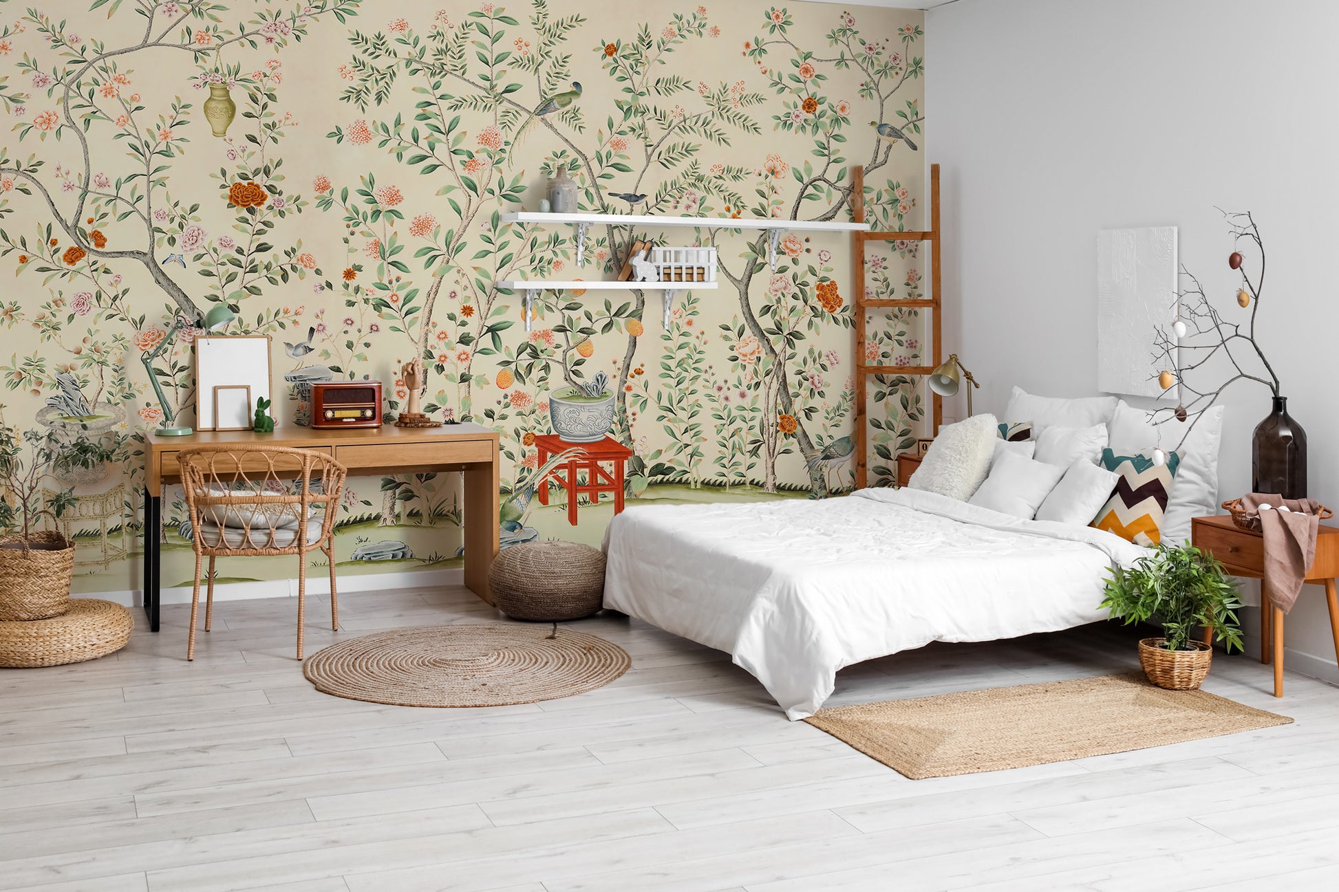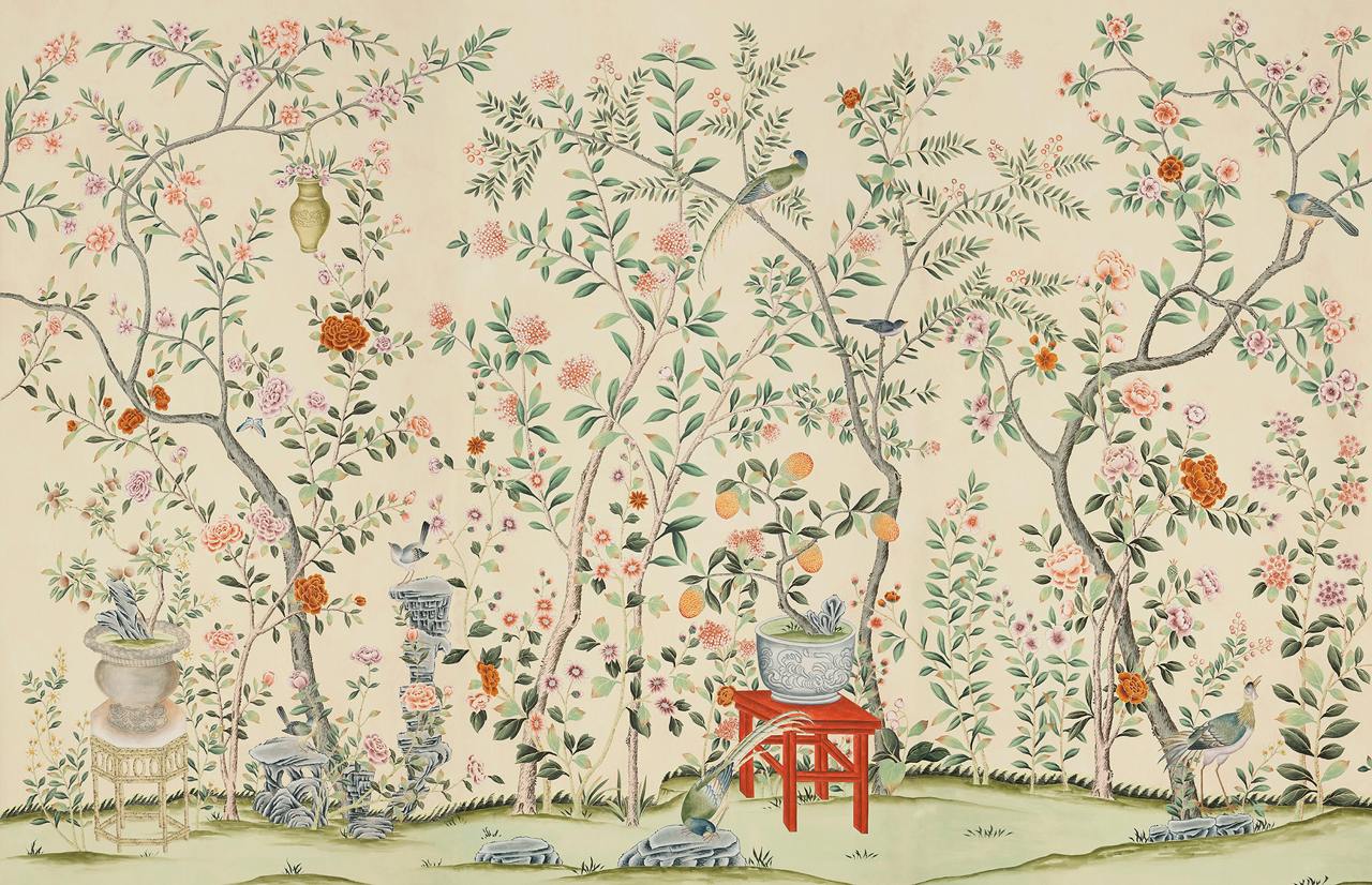 Bej Fon Üzerinde Gül Ağacı ve Kuşlar Duvar Kağıdı Duvar Kağıdı Ürün Bilgisi