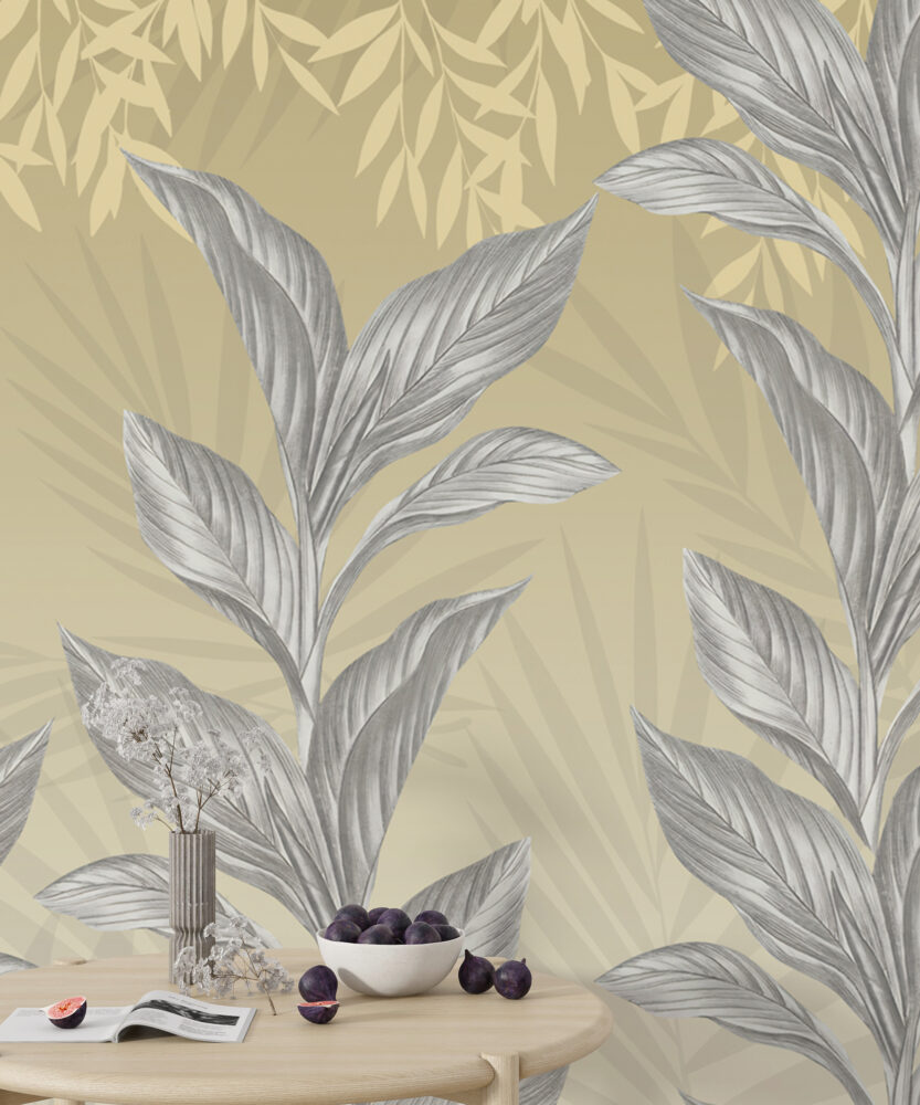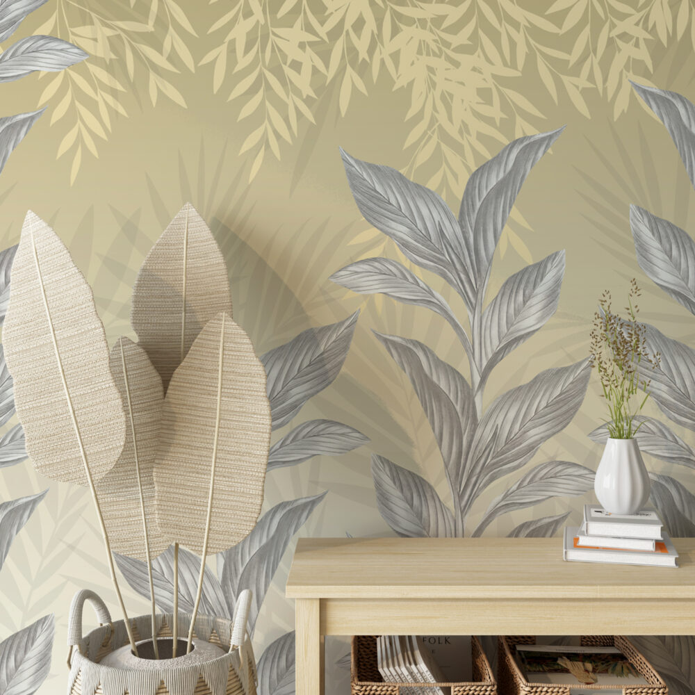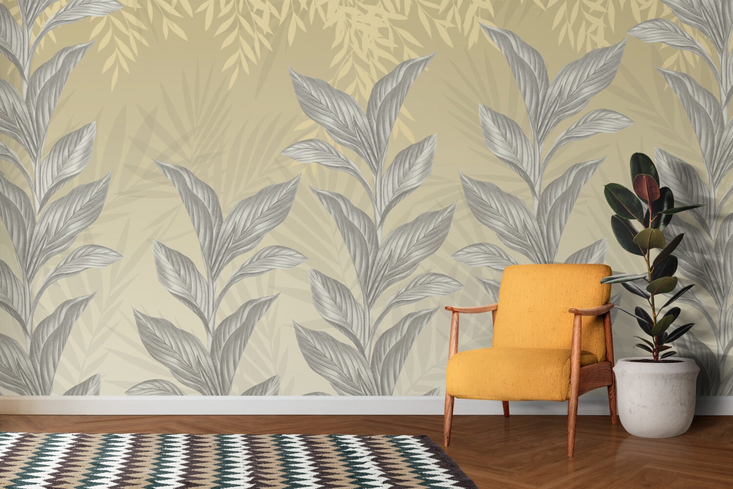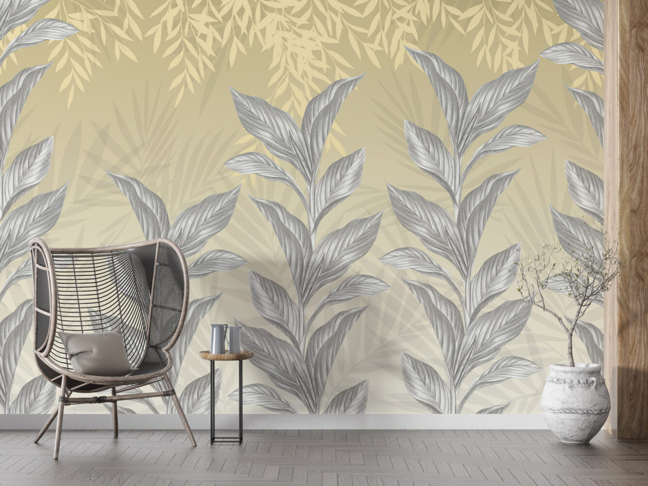 Bej Zeminli Gri Tonlu Yapraklar Duvar Kağıdı üretimi, uygulanmasını isteyeceğiniz boyut ve konumuna uygun olarak talepleriniz doğrultusunda size özel imal edilir.