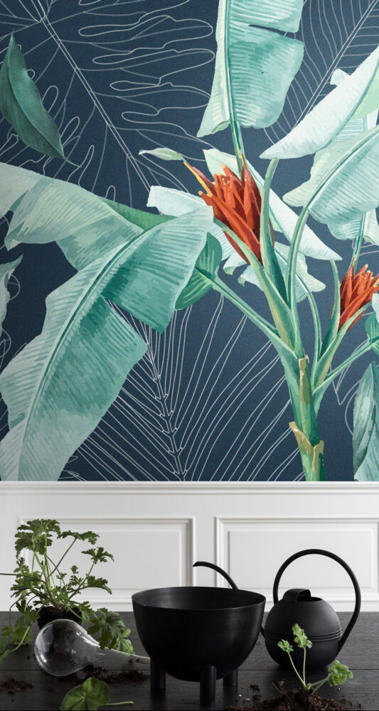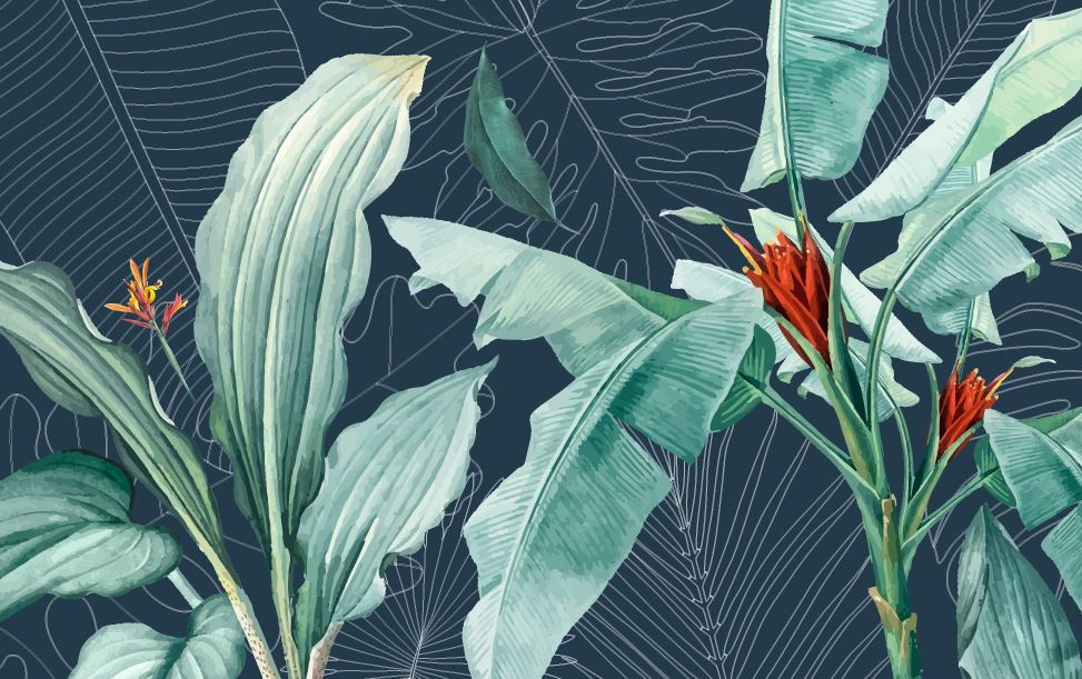 Büyük Tropikal Yapraklar ve Kırmızı Çiçekler Duvar Kağıdı üretimi, uygulanmasını isteyeceğiniz boyut ve konumuna uygun olarak talepleriniz doğrultusunda size özel imal edilir.