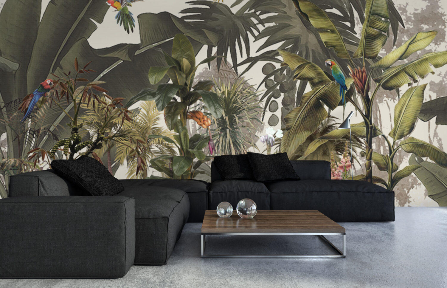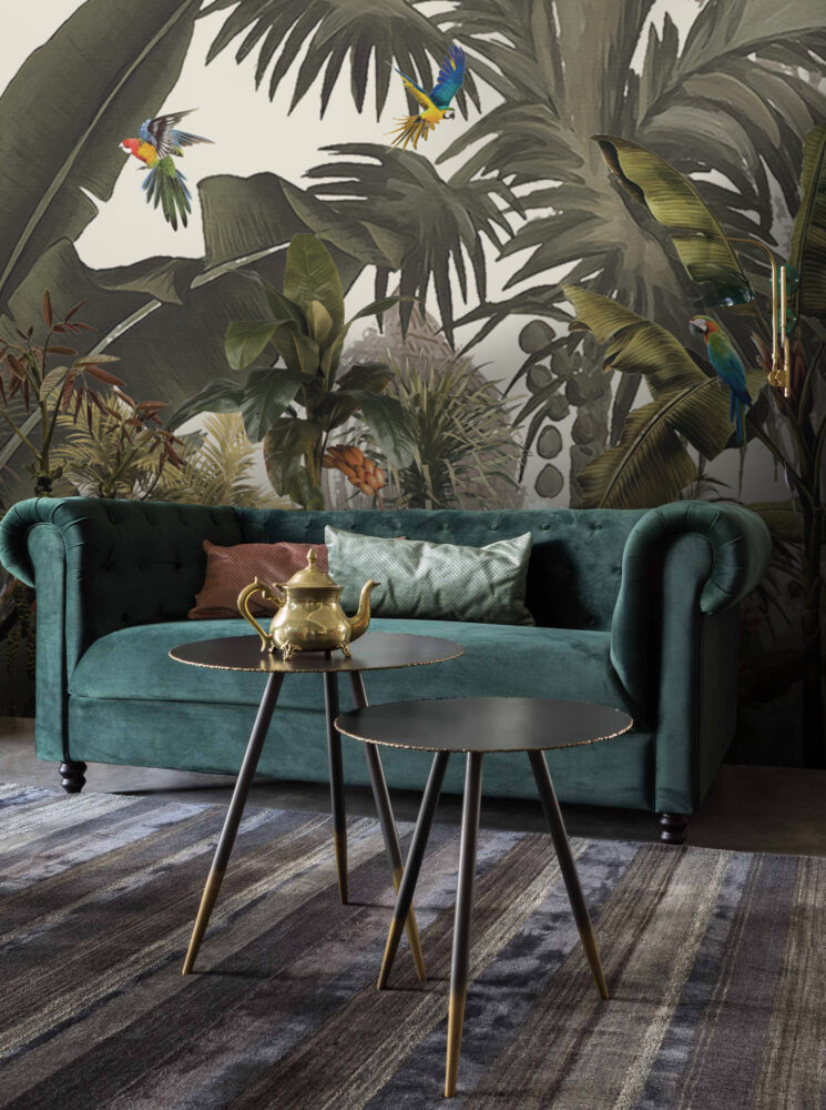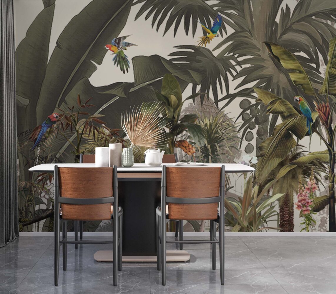 Büyük Tropikal Yapraklar ve Renkli Papağanlar Duvar Kağıdı üretimi, uygulanmasını isteyeceğiniz boyut ve konumuna uygun olarak talepleriniz doğrultusunda size özel imal edilir.