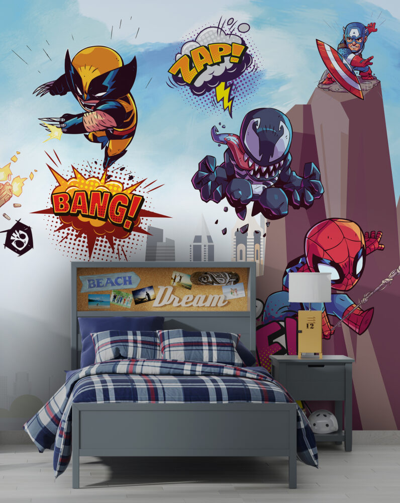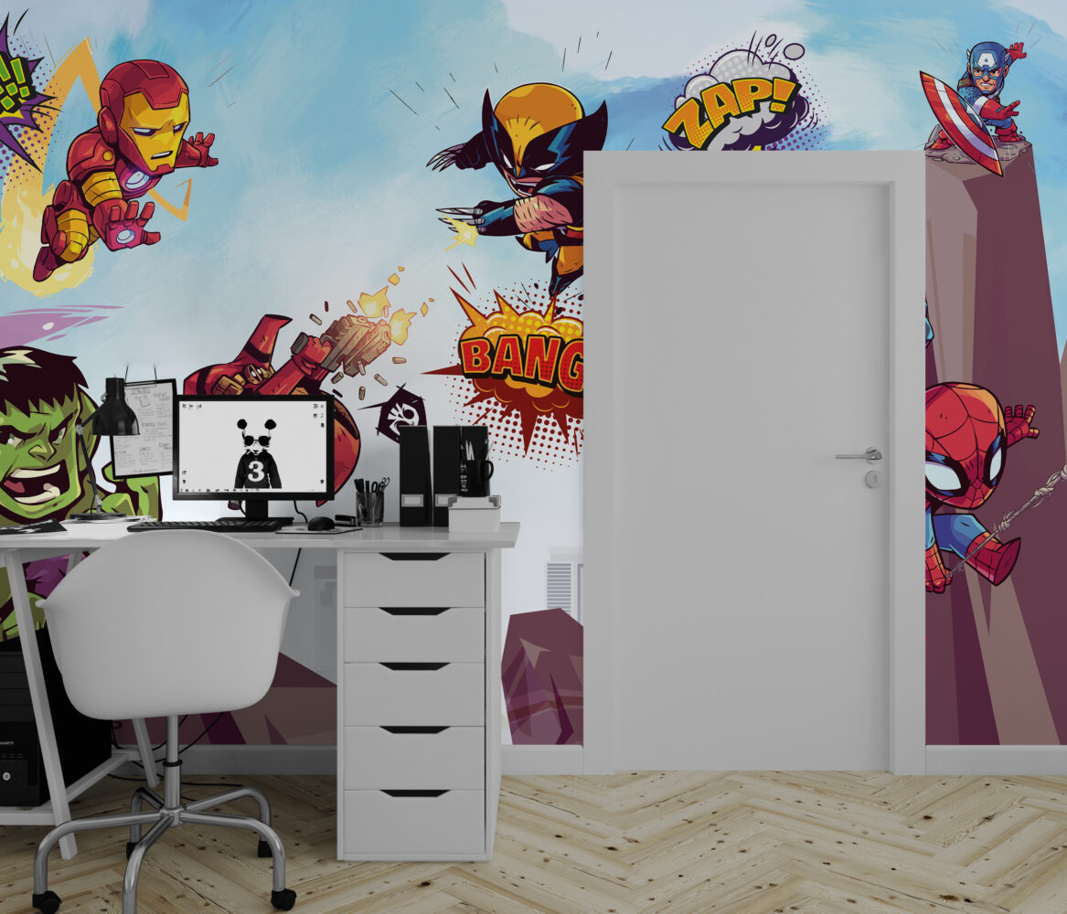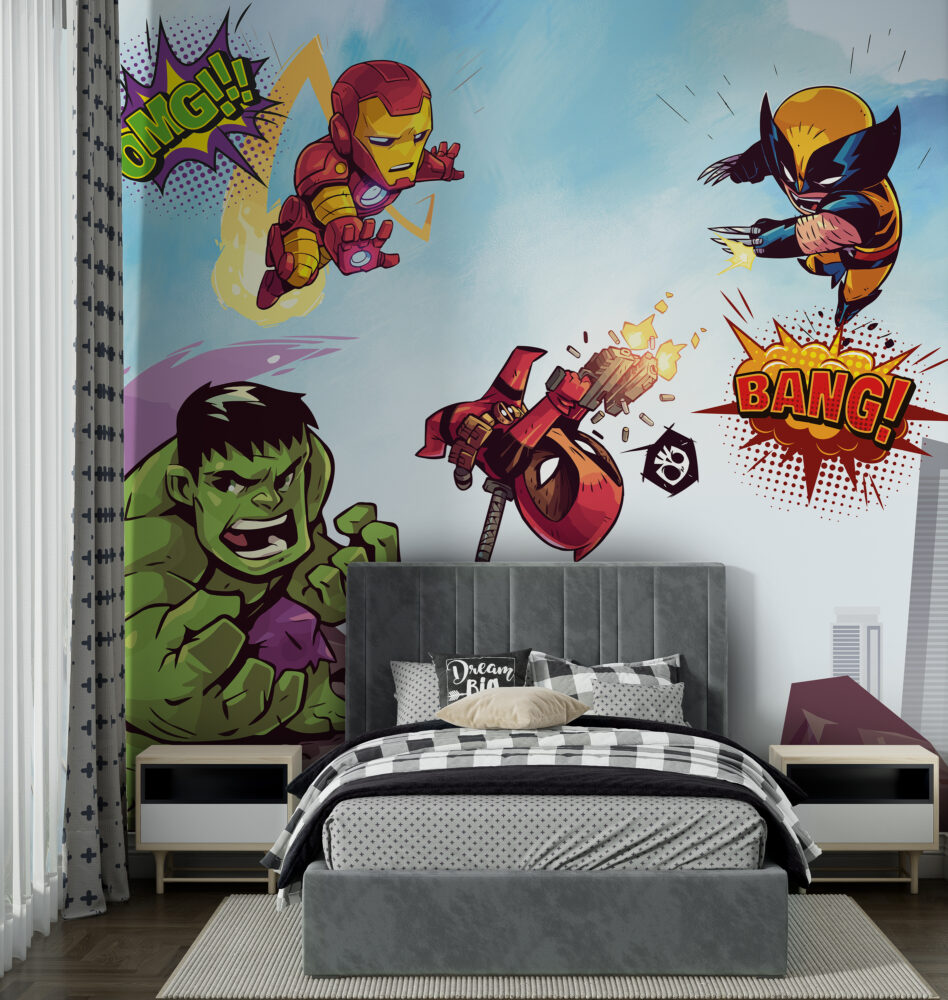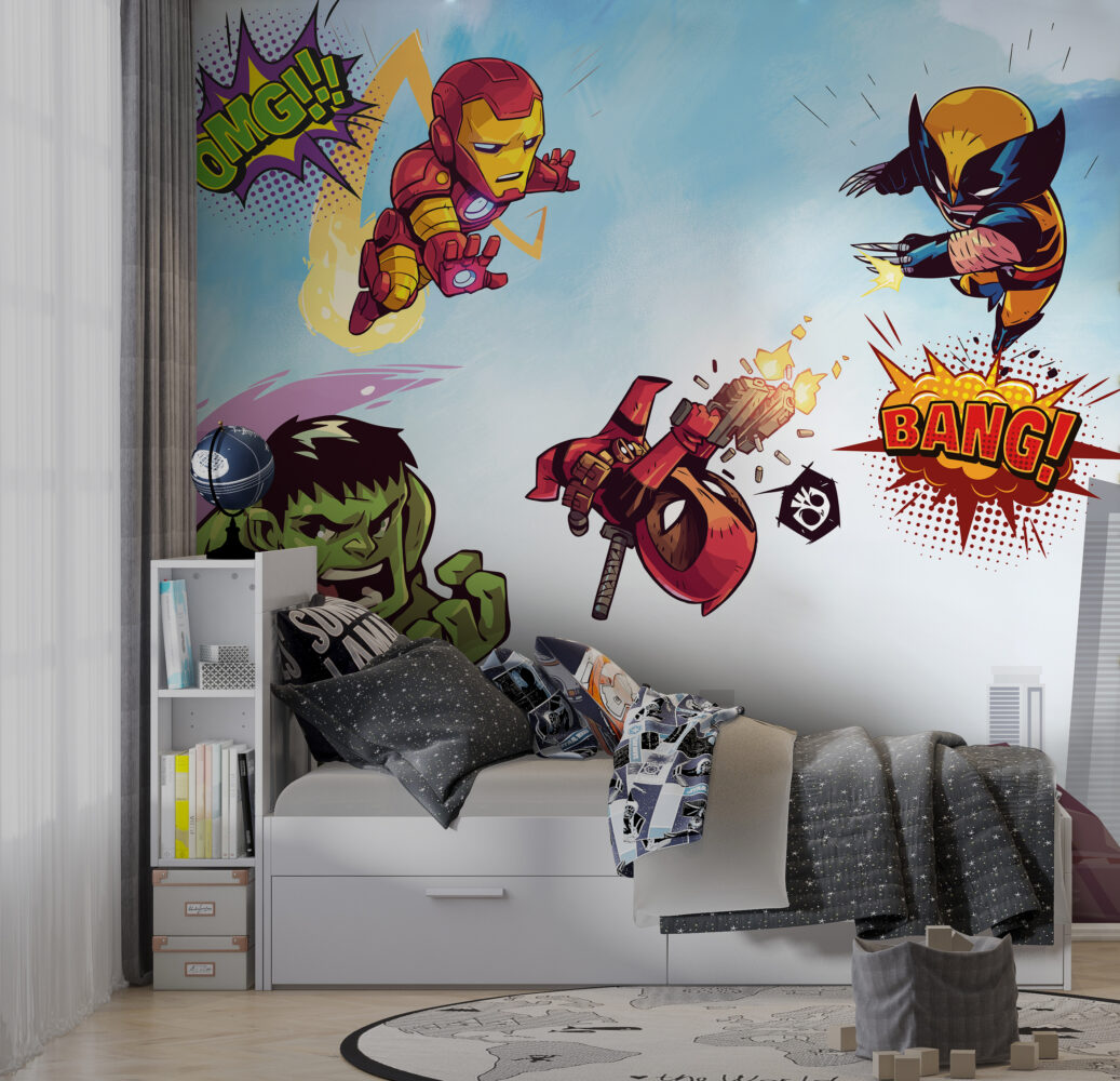 Çizgi Roman Tarzında Süper Kahramanlar Duvar Kağıdı üretimi, uygulanmasını isteyeceğiniz boyut ve konumuna uygun olarak talepleriniz doğrultusunda size özel imal edilir.