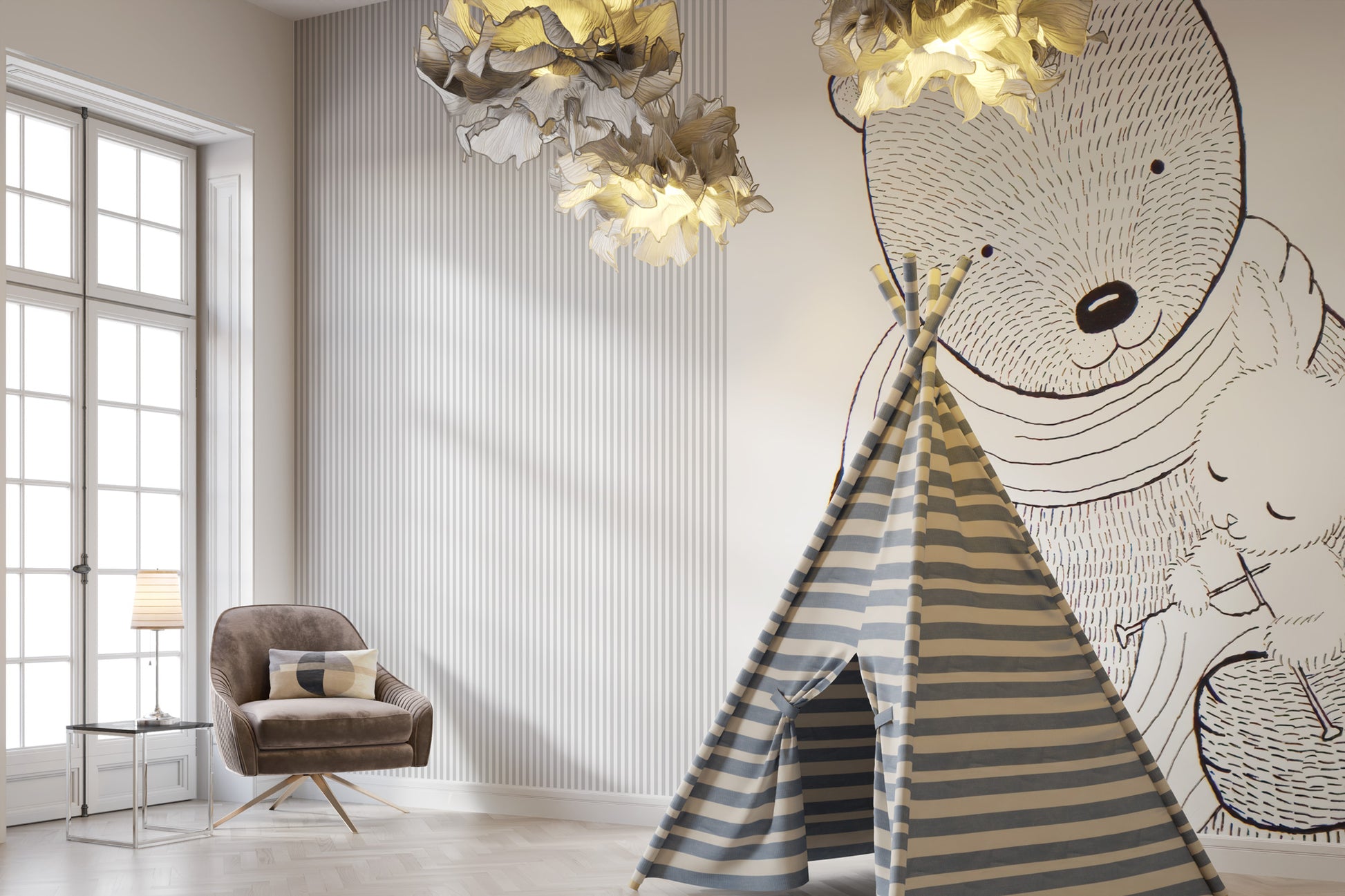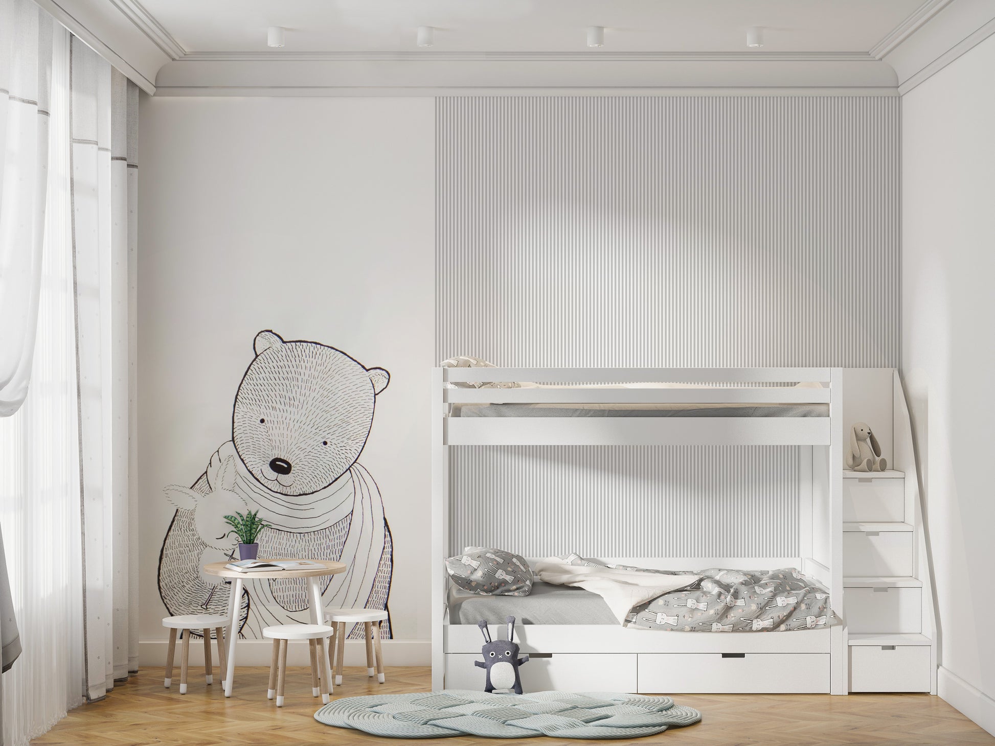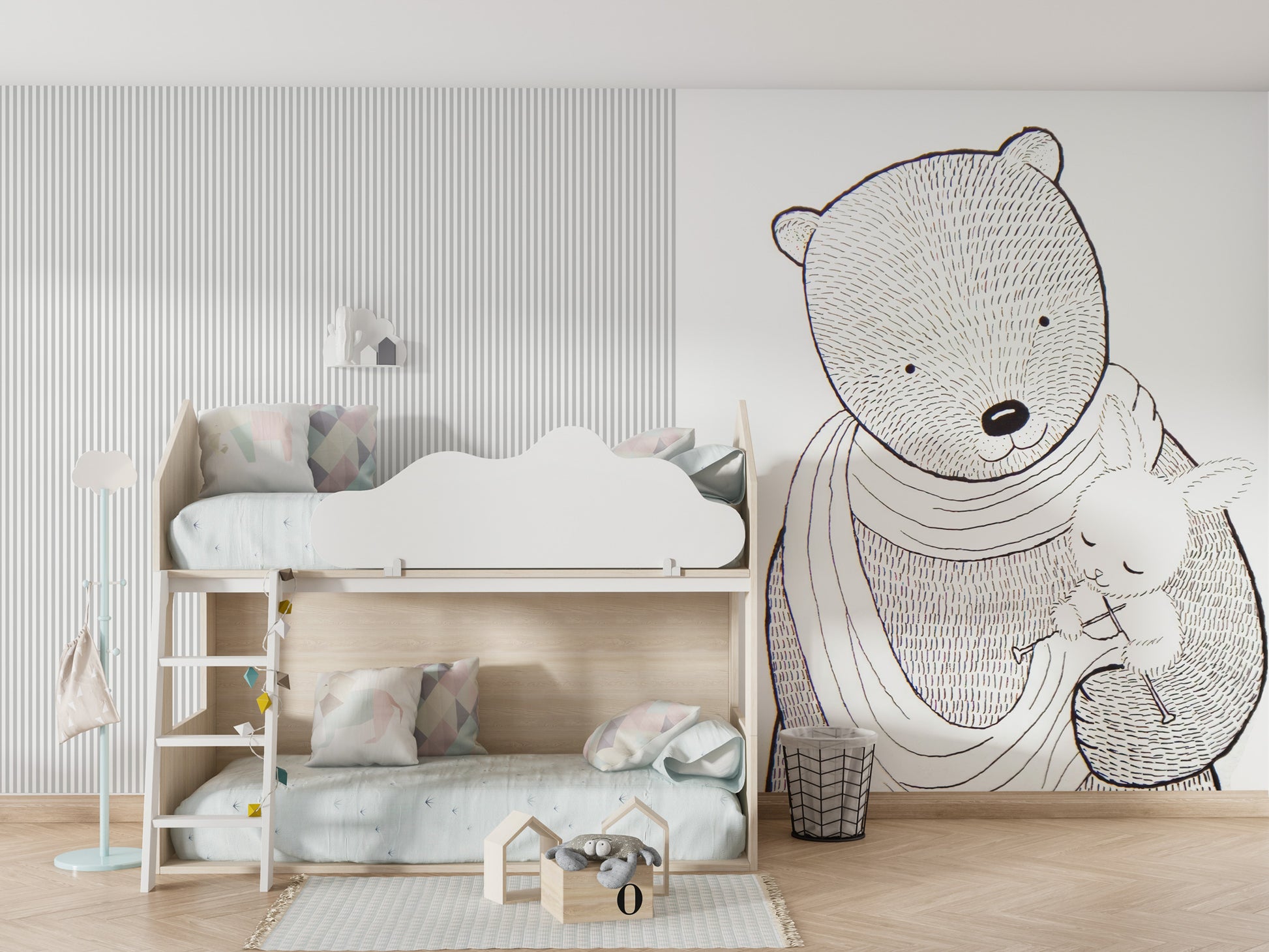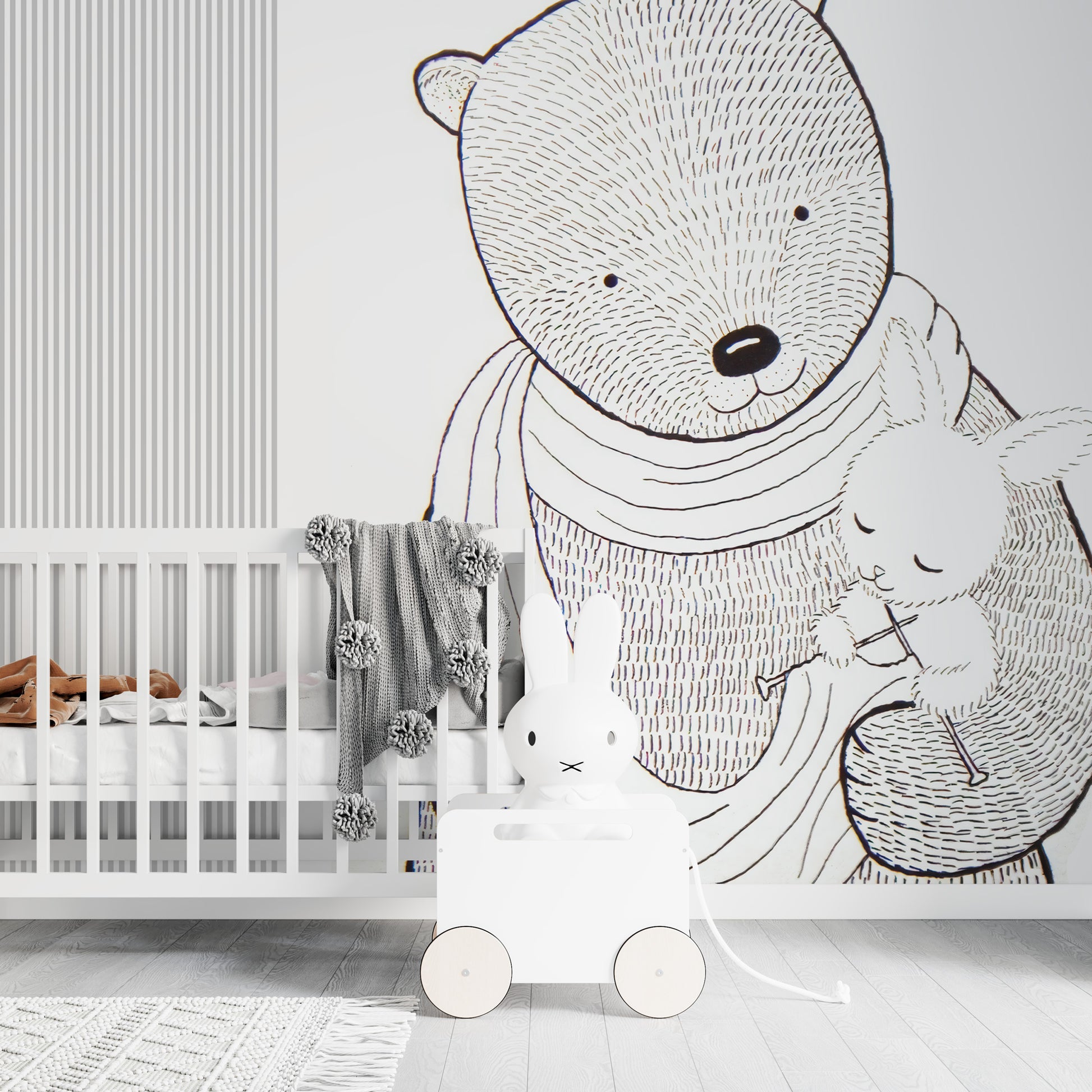 Çizgisel Ayı Anne Çıta Görünüm Siyah Beyaz Duvar Kağıdı üretimi, uygulanmasını isteyeceğiniz boyut ve konumuna uygun olarak talepleriniz doğrultusunda size özel imal edilir.