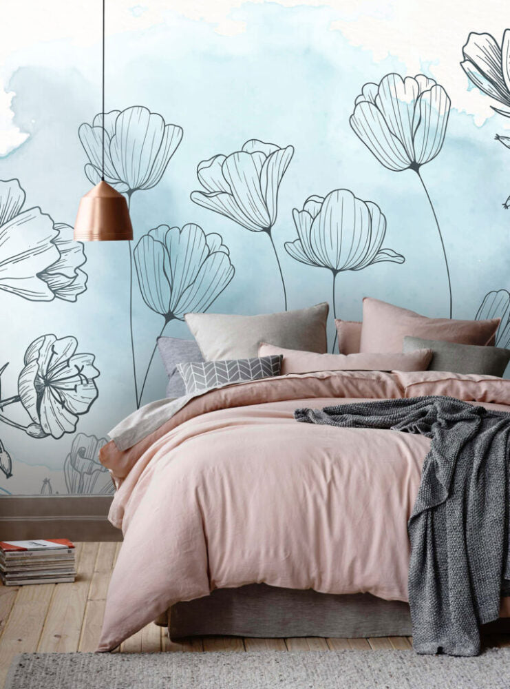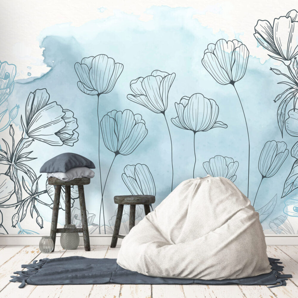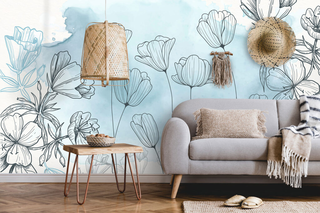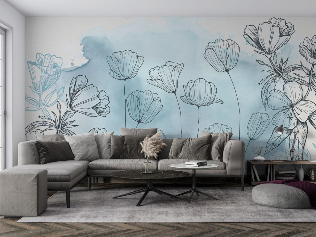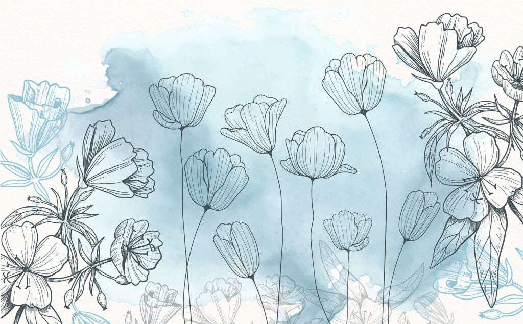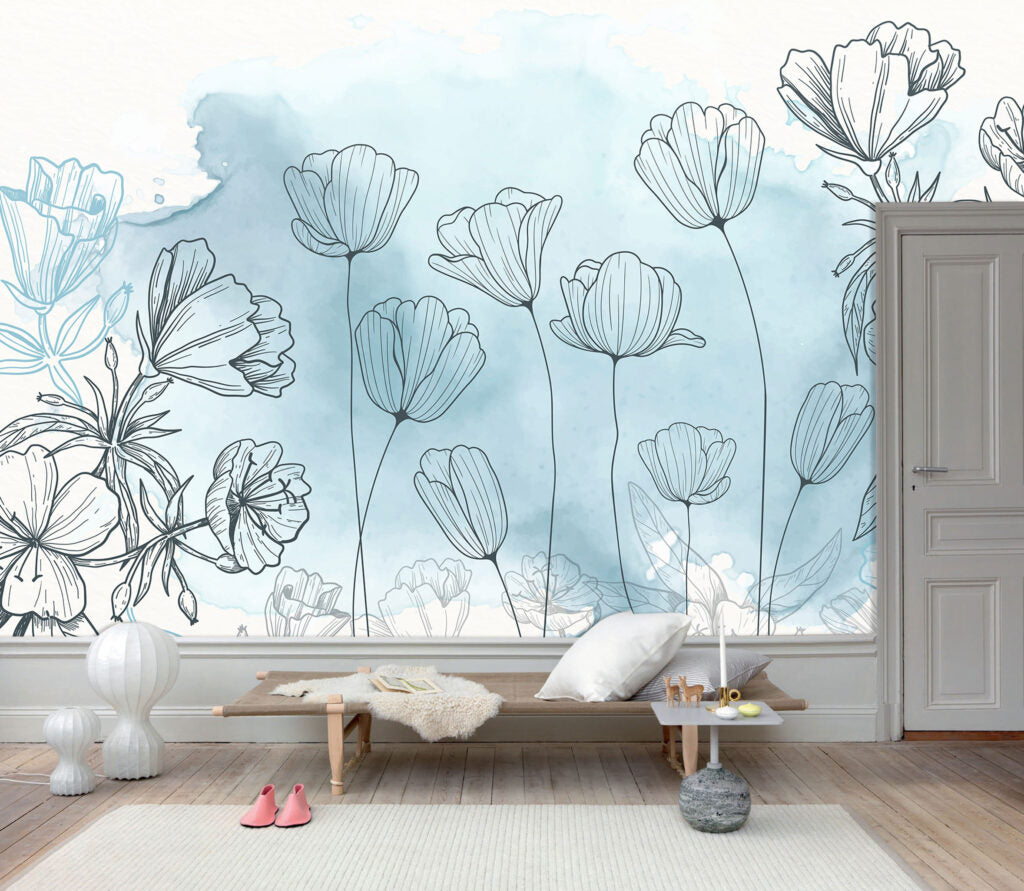 Çizim Şeklinde Çiçek Desenli 3D Duvar Kağıdı
