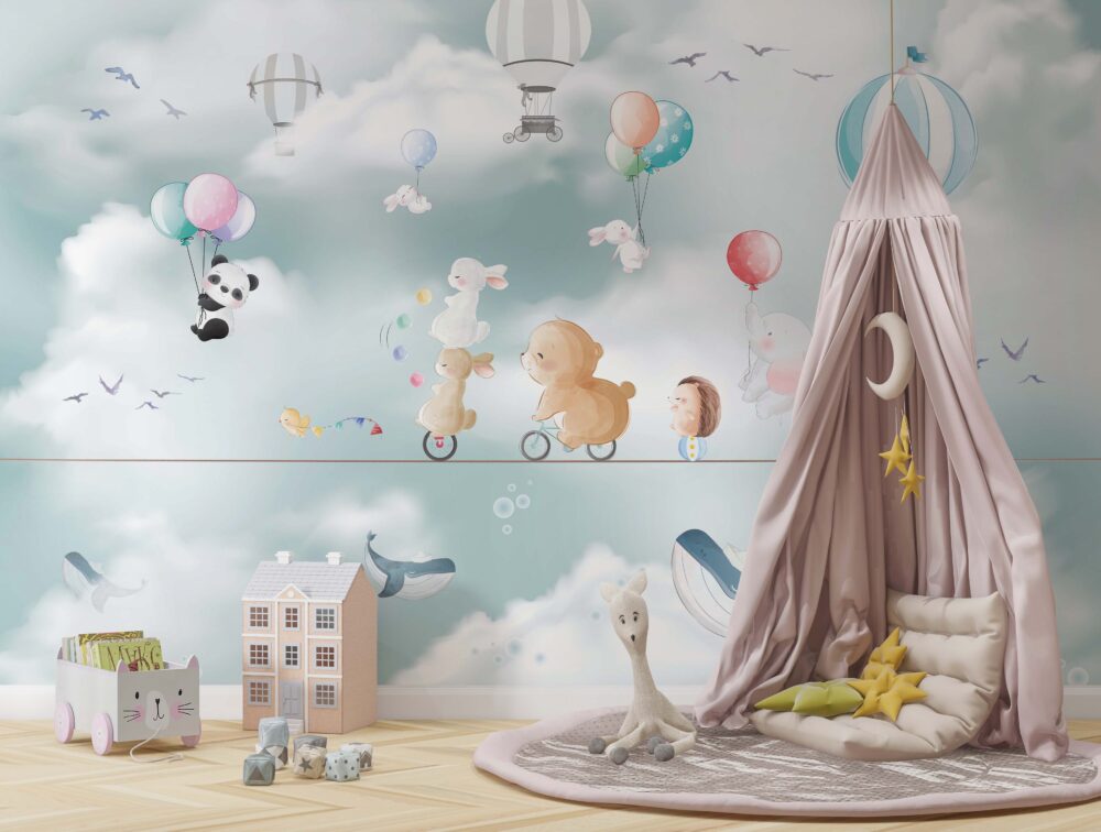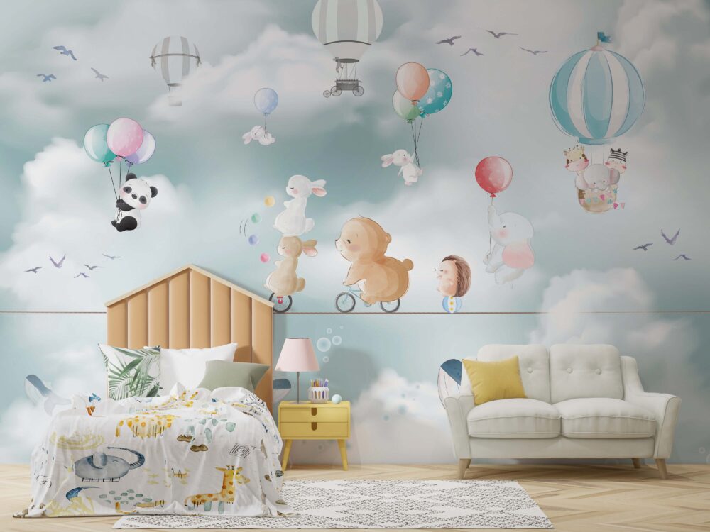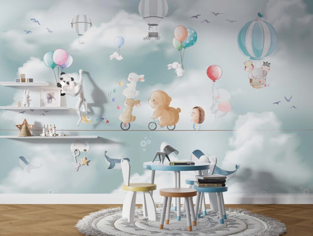 Çocuk Odası İpin Üzerindeki Hayvanlar ve Balonlu 3D Duvar Kağıdı | Duvar Kağıdı Marketi üretimi, uygulanmasını isteyeceğiniz boyut ve konumuna uygun olarak talepleriniz doğrultusunda size özel imal edilir.