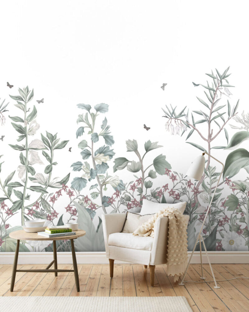 Çok Çeşit Yeşil Bitki ve Çiçek Desenli 3D Duvar Kağıdı