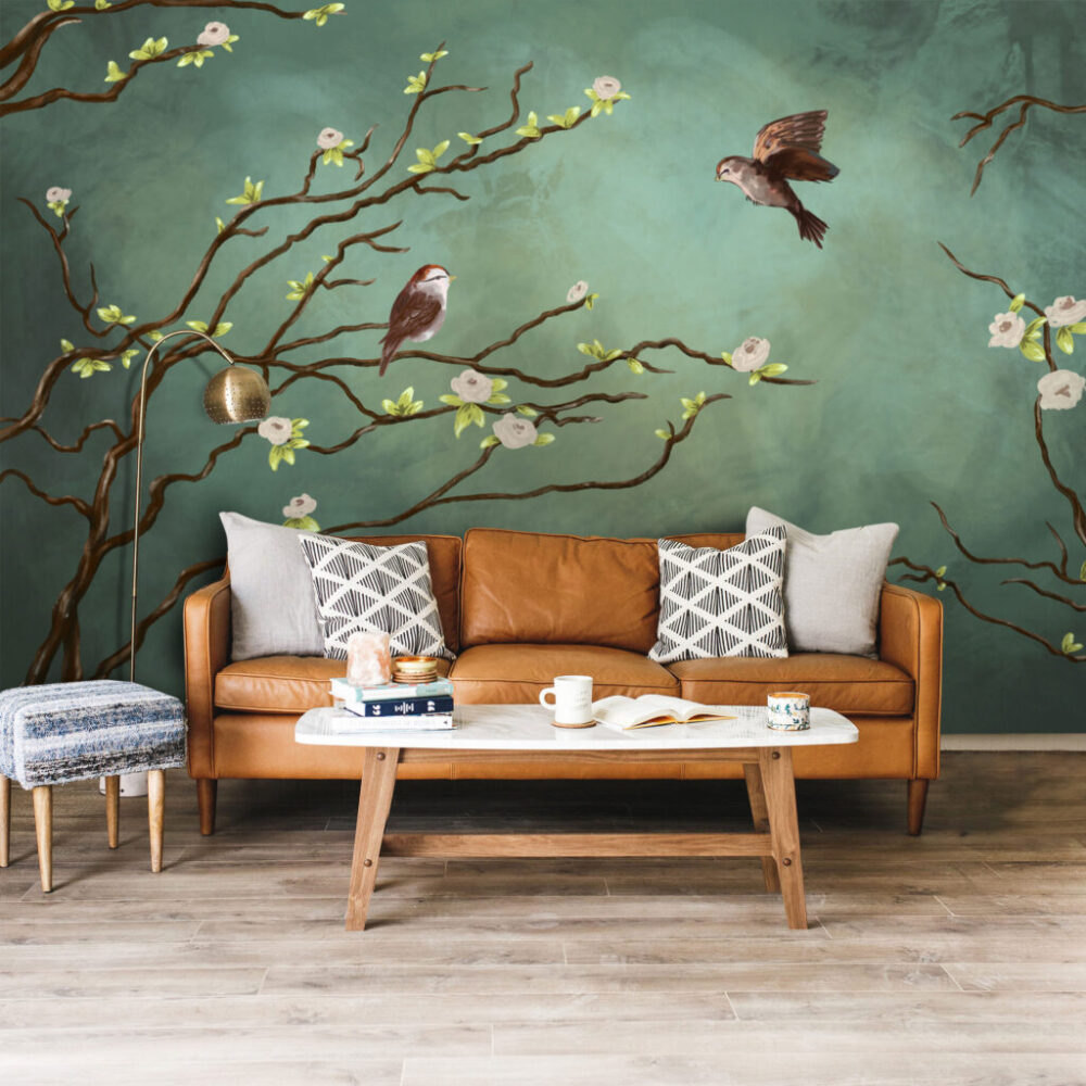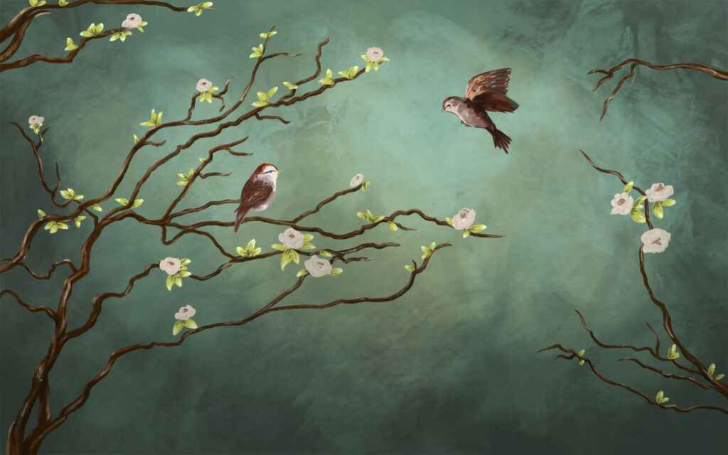Dal ve Kuş Desenli 3D Duvar Kağıdı