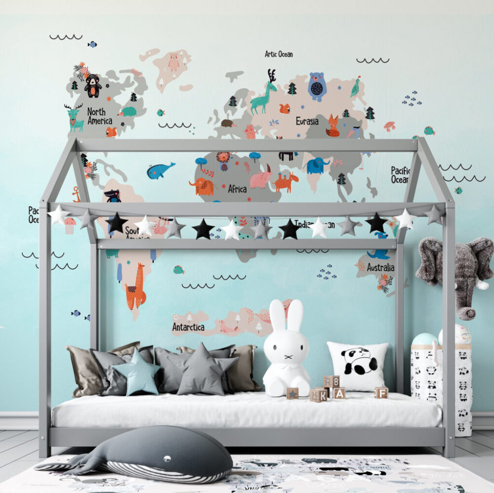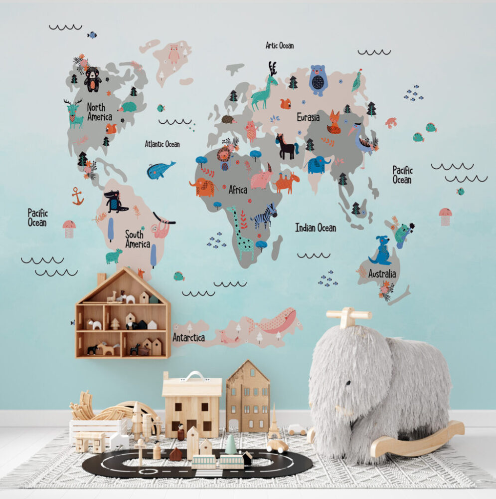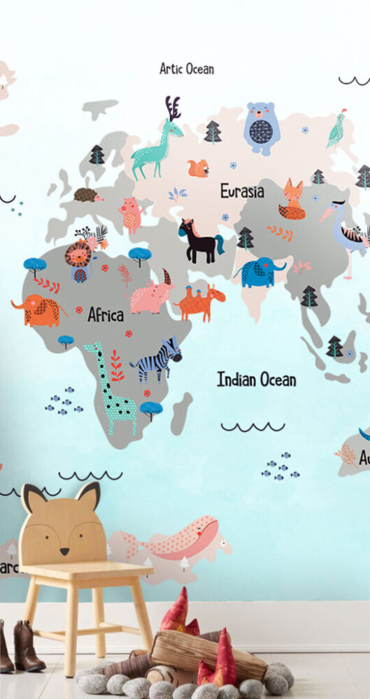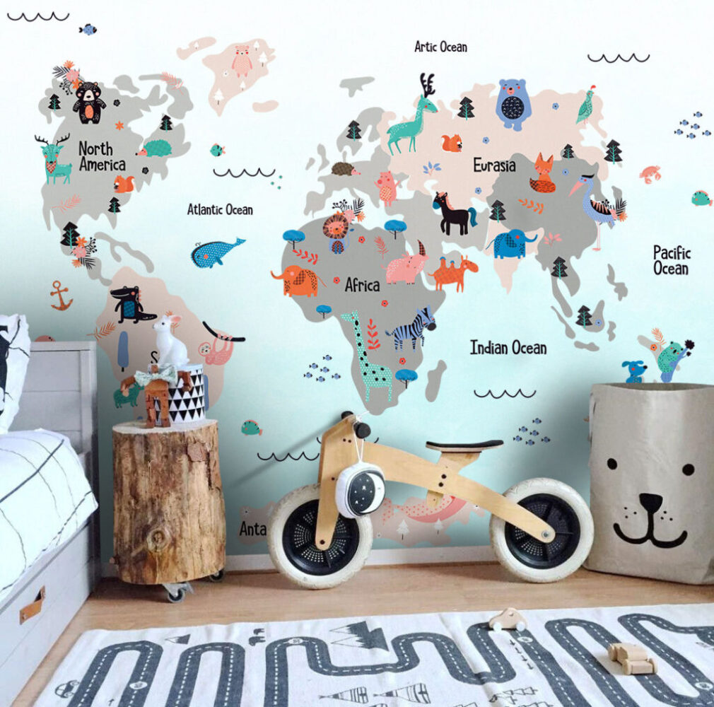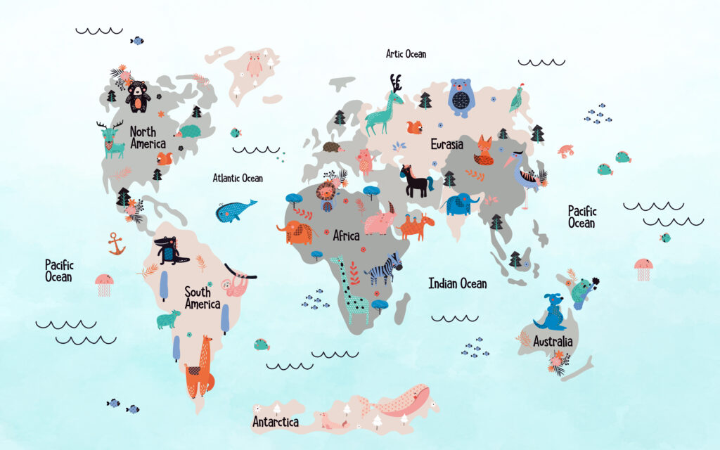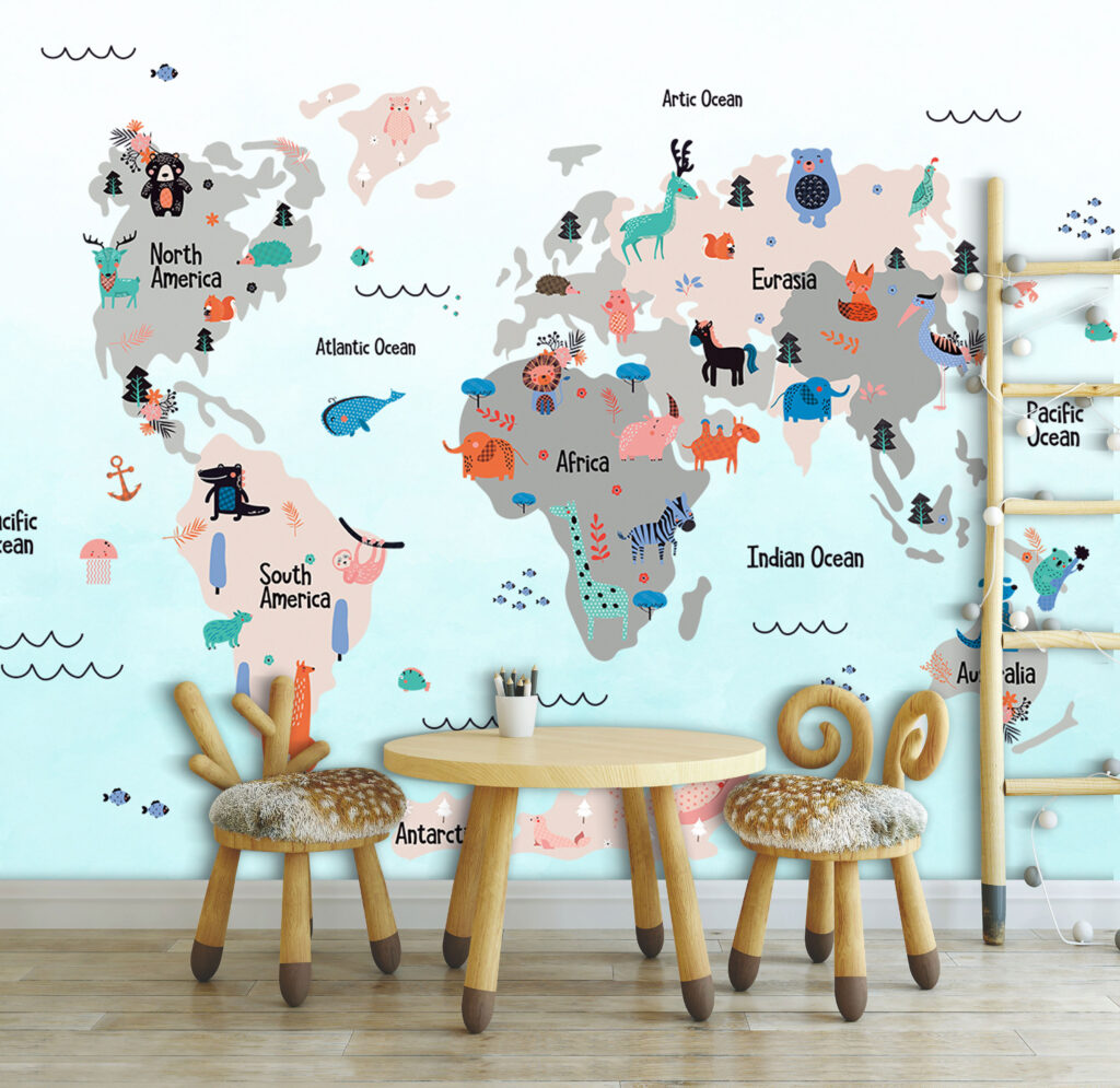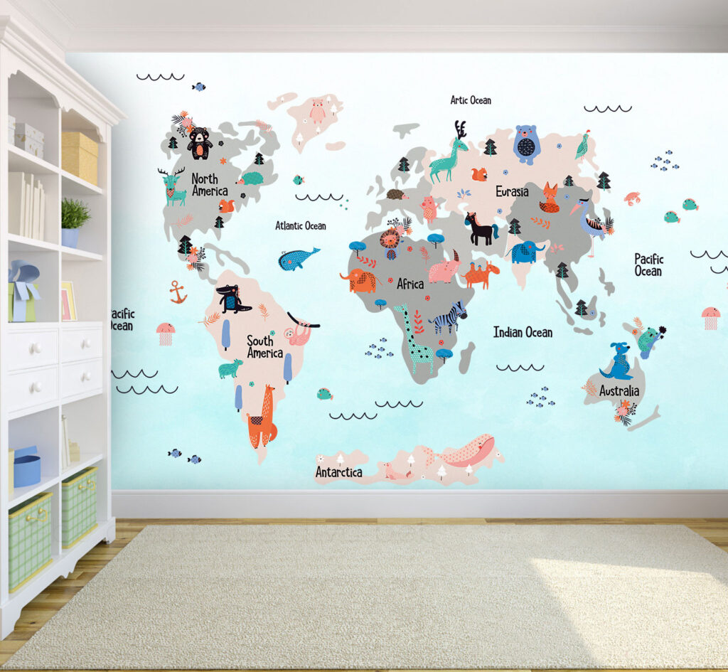 Değişik Motif ve Hayvan Desenli Çocuk Haritası 3D Duvar Kağıdı | Duvar Kağıdı Marketi üretimi, uygulanmasını isteyeceğiniz boyut ve konumuna uygun olarak talepleriniz doğrultusunda size özel imal edilir.