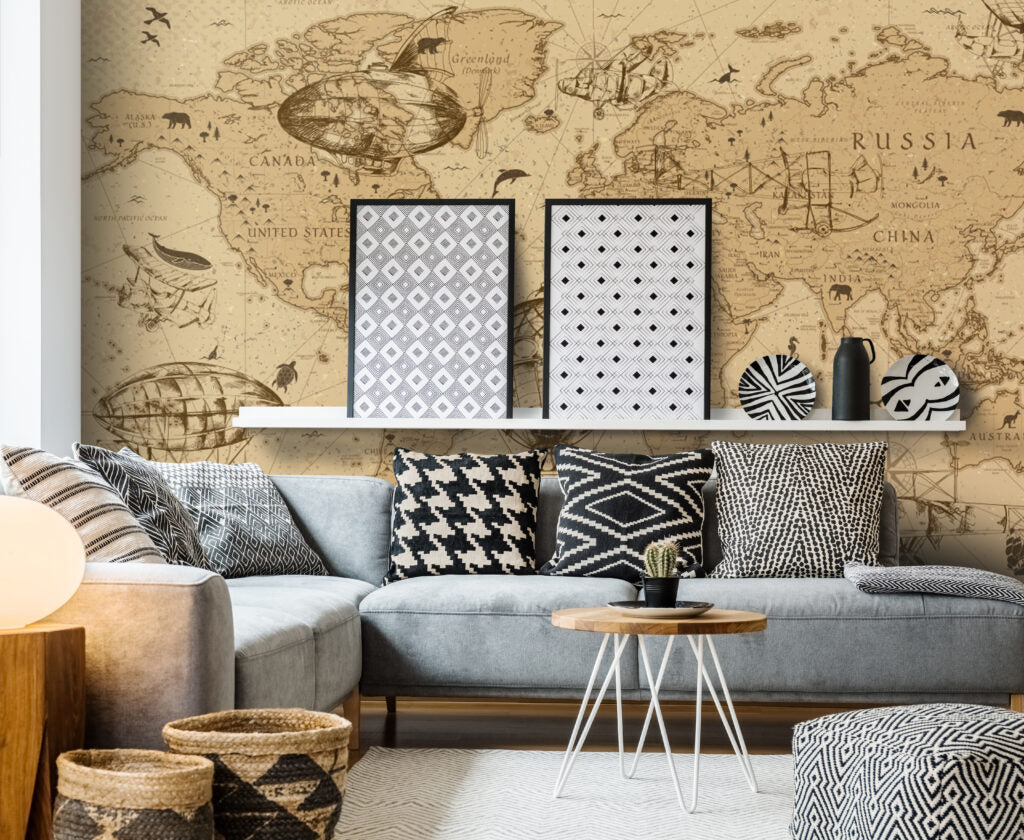 Eski Dünya Haritası ve Farklı Şekil Desenli 3D Duvar Kağıdı | Duvar Kağıdı Marketi üretimi, uygulanmasını isteyeceğiniz boyut ve konumuna uygun olarak talepleriniz doğrultusunda size özel imal edilir.