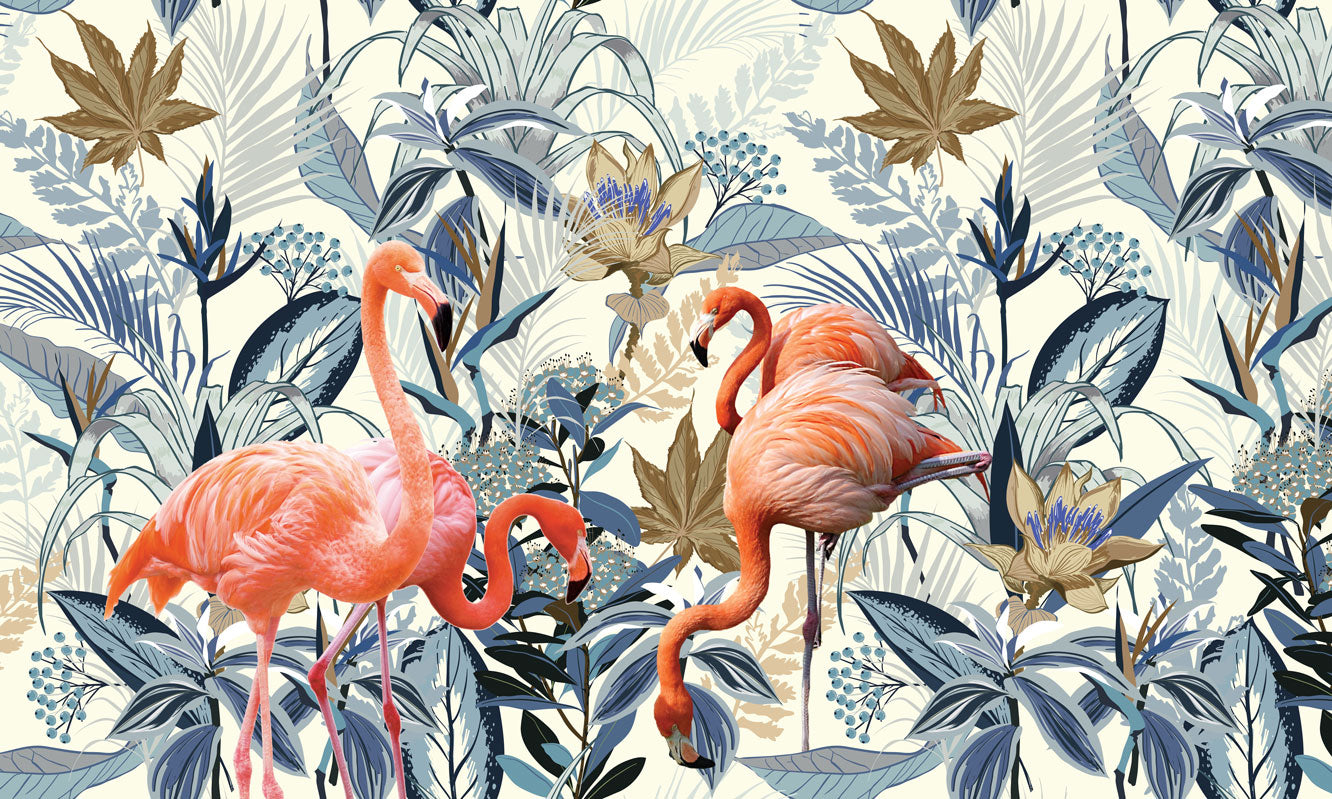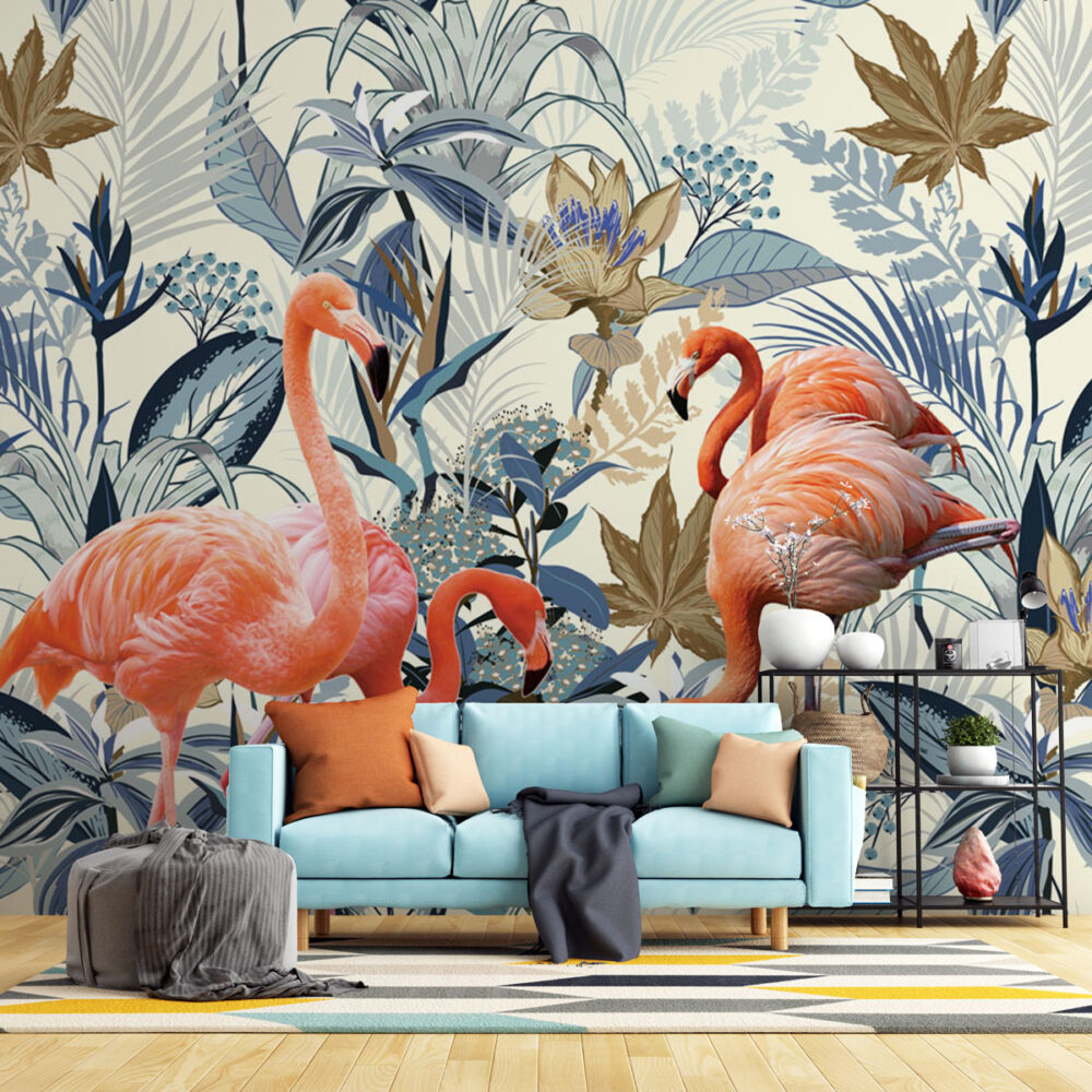 Flamingolar ve Mavi Çiçekler Duvar Kağıdı üretimi, uygulanmasını isteyeceğiniz boyut ve konumuna uygun olarak talepleriniz doğrultusunda size özel imal edilir.