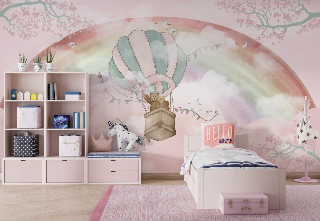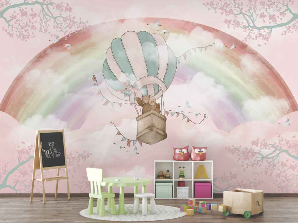 Gökkuşağı Manzaralı Balonla Uçan Ayı Desenli Duvar Kağıdı üretimi, uygulanmasını isteyeceğiniz boyut ve konumuna uygun olarak talepleriniz doğrultusunda size özel imal edilir.