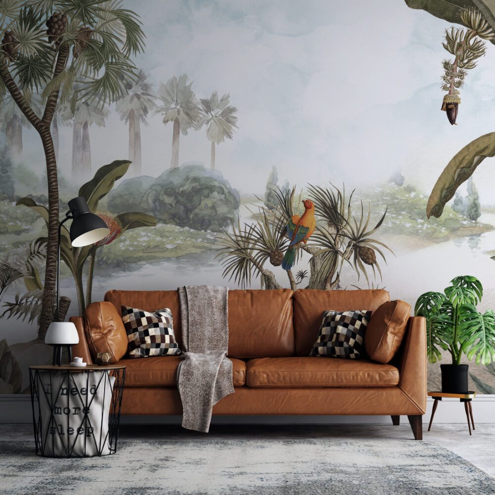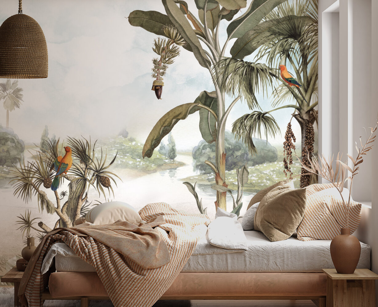 Göl Kenarında Hurma Muz Ağaçları ve Kuşlar Duvar Kağıdı üretimi, uygulanmasını isteyeceğiniz boyut ve konumuna uygun olarak talepleriniz doğrultusunda size özel imal edilir.