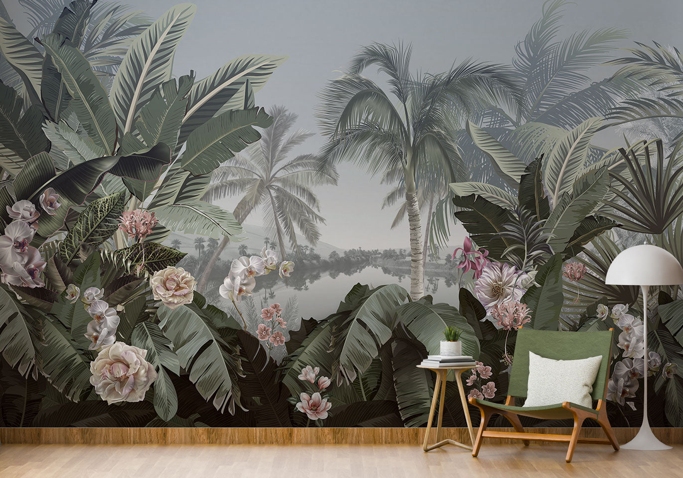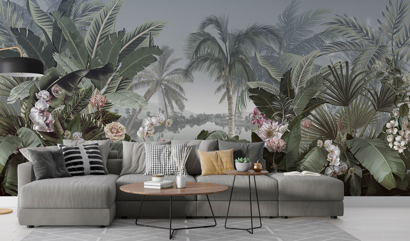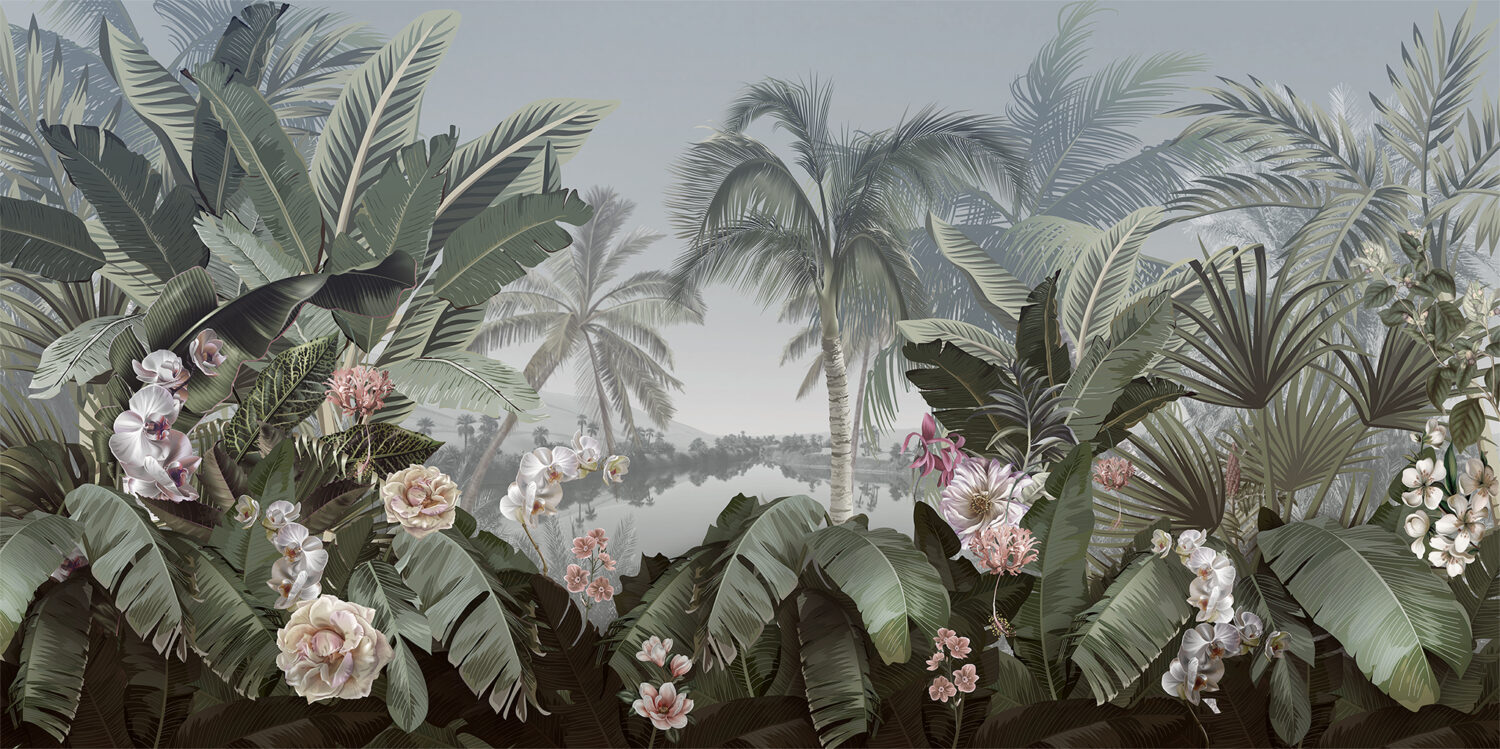 Göl Kenarındaki Tropikal Yapraklar ve Çiçekler Duvar Kağıdı üretimi, uygulanmasını isteyeceğiniz boyut ve konumuna uygun olarak talepleriniz doğrultusunda size özel imal edilir.