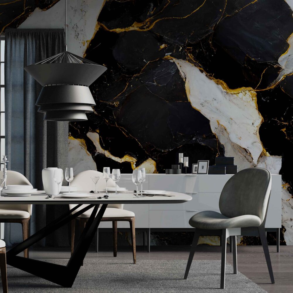 Gold Damarlı Siyah-Beyaz Mermer Desen Duvar Kağıdı üretimi, uygulanmasını isteyeceğiniz boyut ve konumuna uygun olarak talepleriniz doğrultusunda size özel imal edilir.