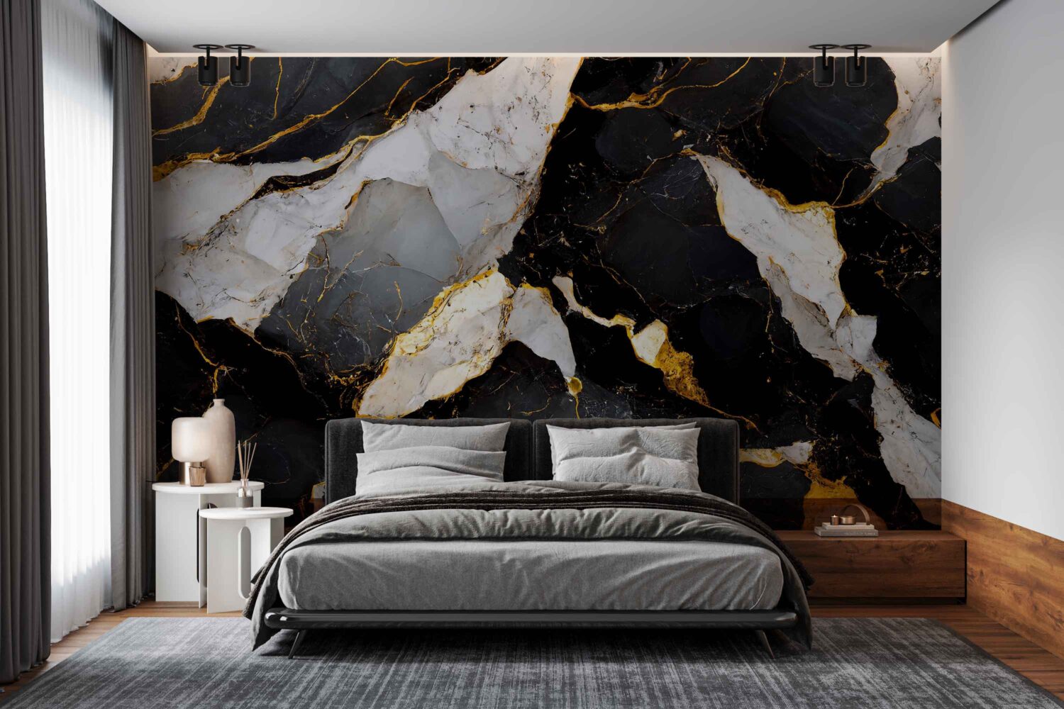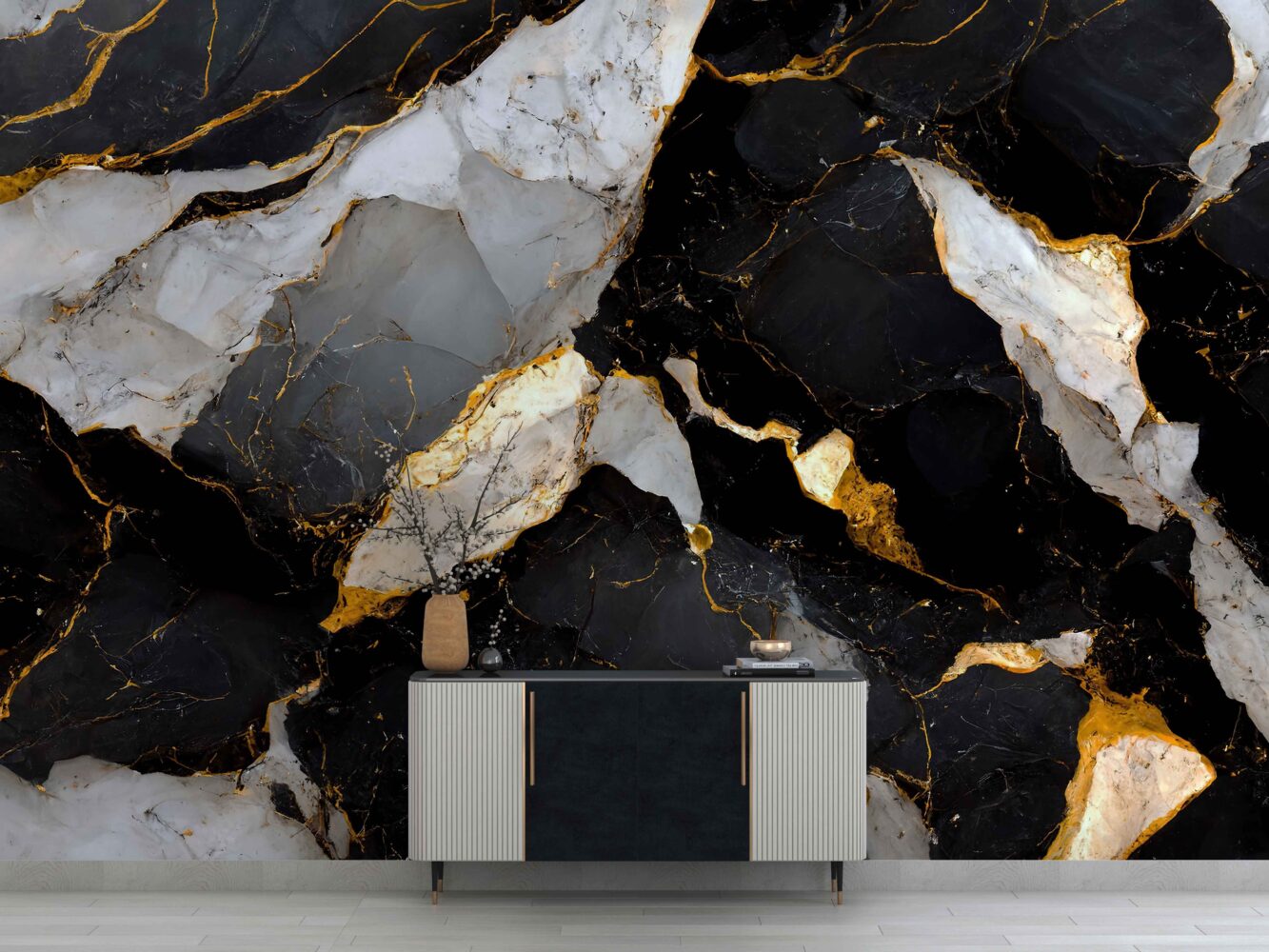 Gold Damarlı Siyah-Beyaz Mermer Desen Duvar Kağıdı