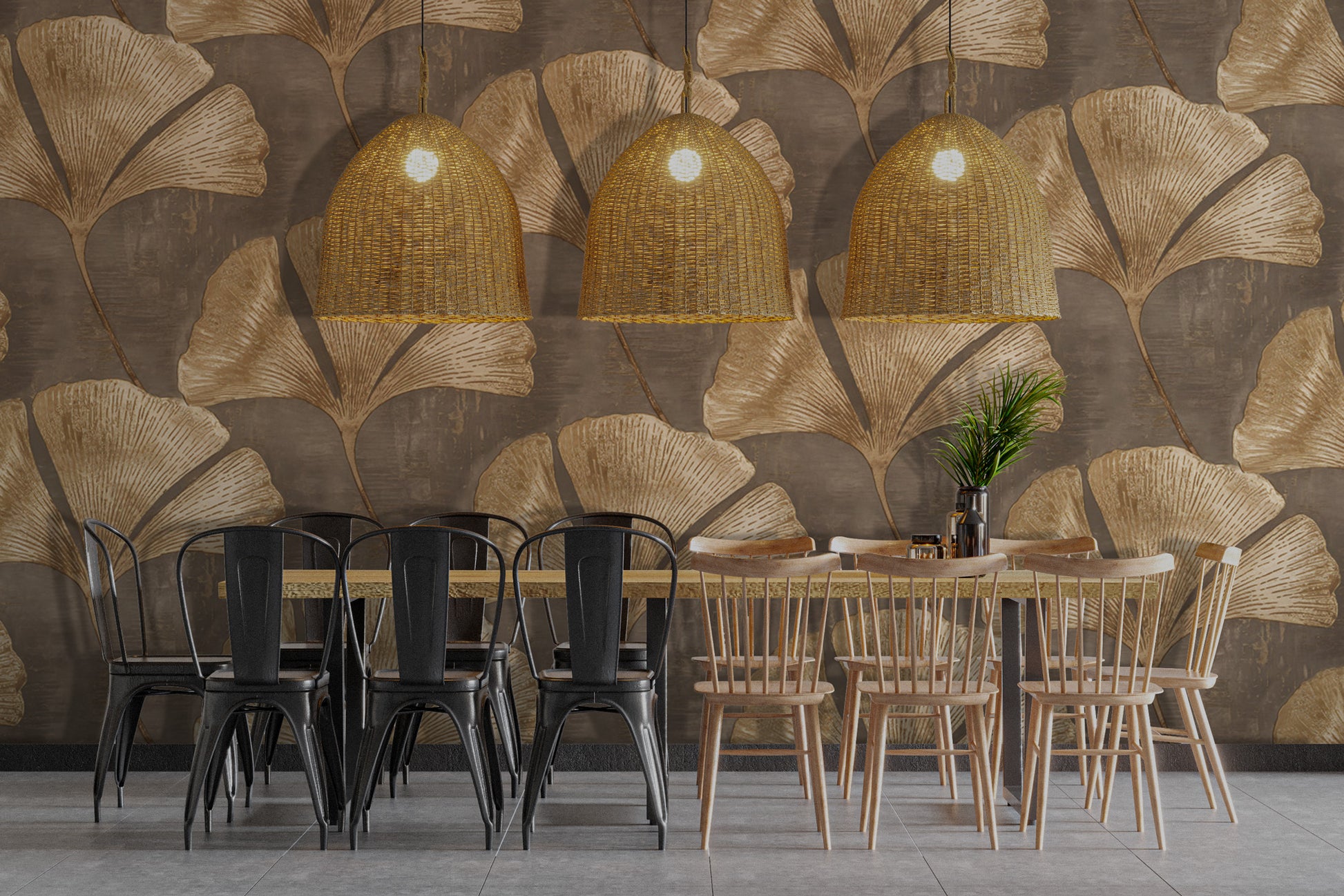 Gold Tonlarda Altın Yaprakları Desenli Duvar Kağıdı