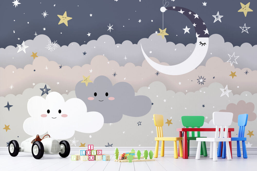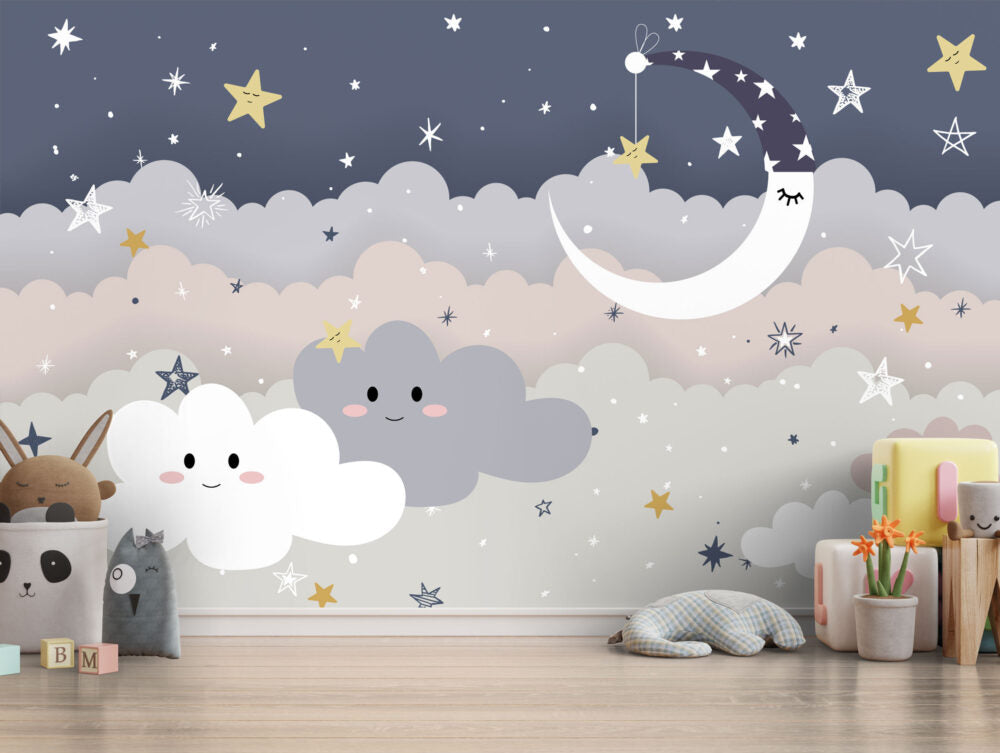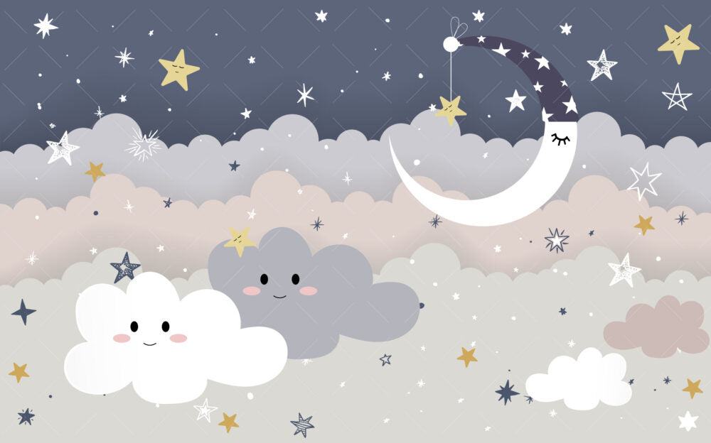 Gülen Yüzlü Ay ve Bulutlar Gökyüzü Duvar Kağıdı üretimi, uygulanmasını isteyeceğiniz boyut ve konumuna uygun olarak talepleriniz doğrultusunda size özel imal edilir.