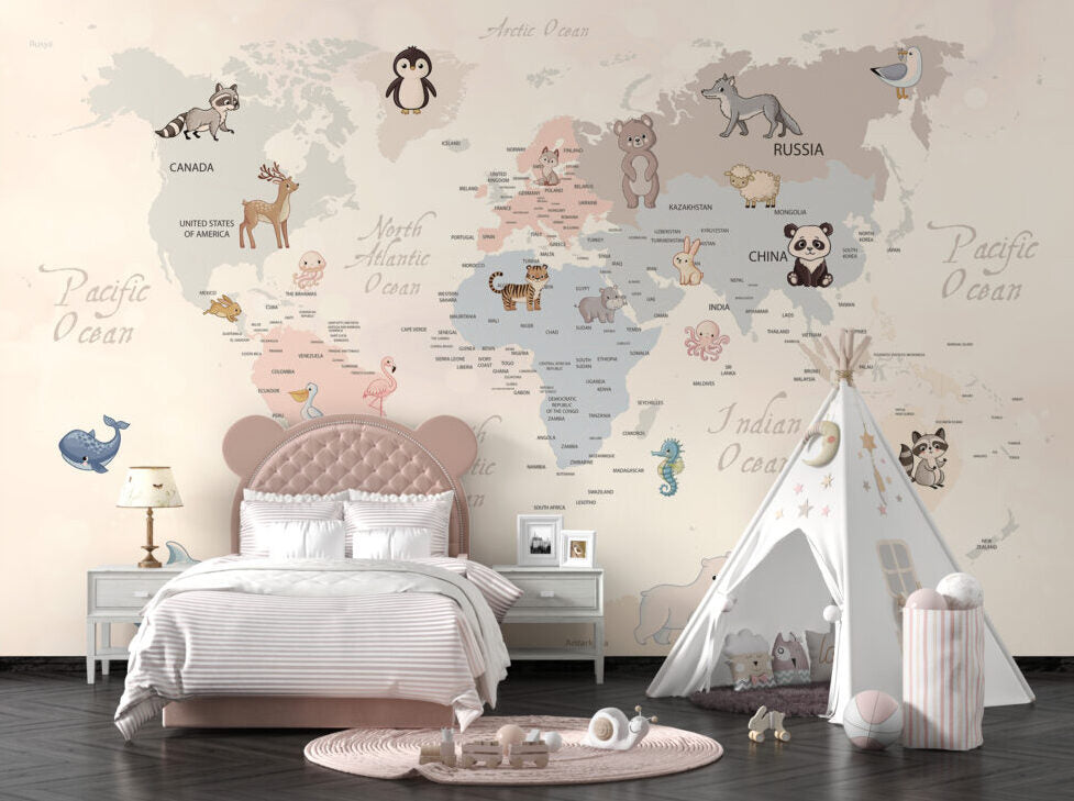 Güzel Yazılı ve Hayvan Desenli Çocuk Haritası 3D Duvar Kağıdı | Duvar Kağıdı Marketi üretimi, uygulanmasını isteyeceğiniz boyut ve konumuna uygun olarak talepleriniz doğrultusunda size özel imal edilir.