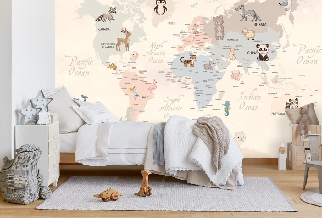 Güzel Yazılı ve Hayvan Desenli Çocuk Haritası 3D Duvar Kağıdı | Duvar Kağıdı Marketi Duvar Kağıdı Ürün Bilgisi