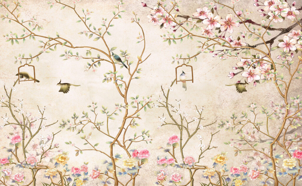 İlkbahar Mevsim Çiçekli Ağaç Desenli 3D Duvar Kağıdı