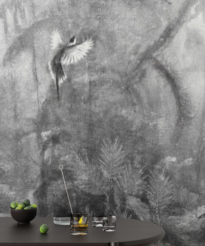Karakalem Puslu Tropikal Ormanda Kuş Duvar Kağıdı üretimi, uygulanmasını isteyeceğiniz boyut ve konumuna uygun olarak talepleriniz doğrultusunda size özel imal edilir.