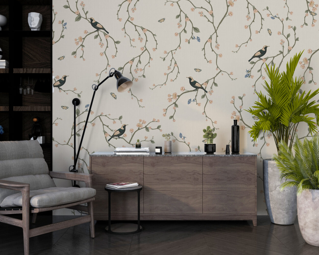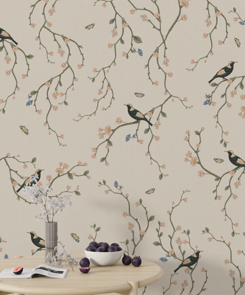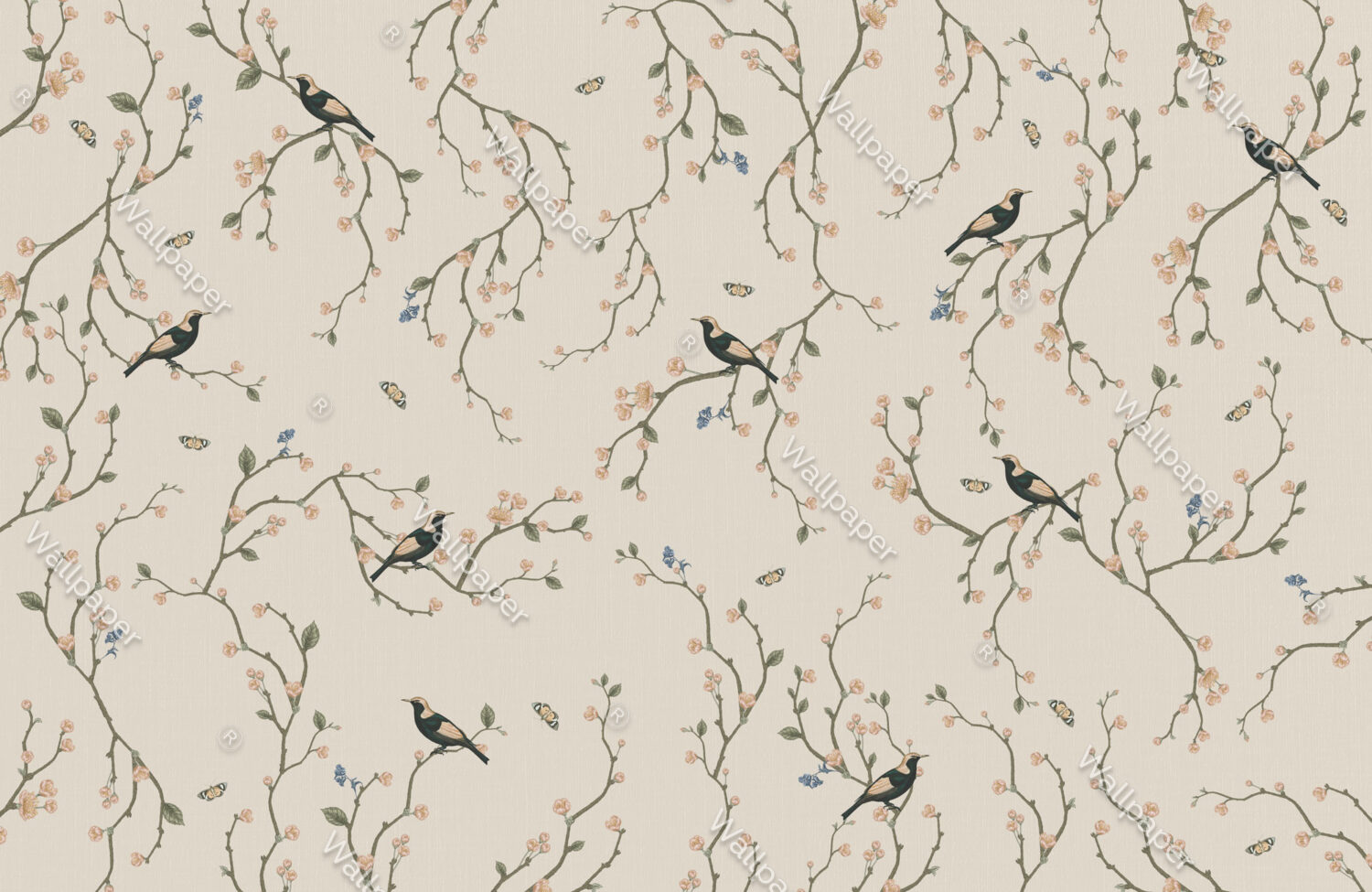Kiraz Çiçekleri ve Kuşlar Bej Duvar Kağıdı Duvar Kağıdı Ürün Bilgisi