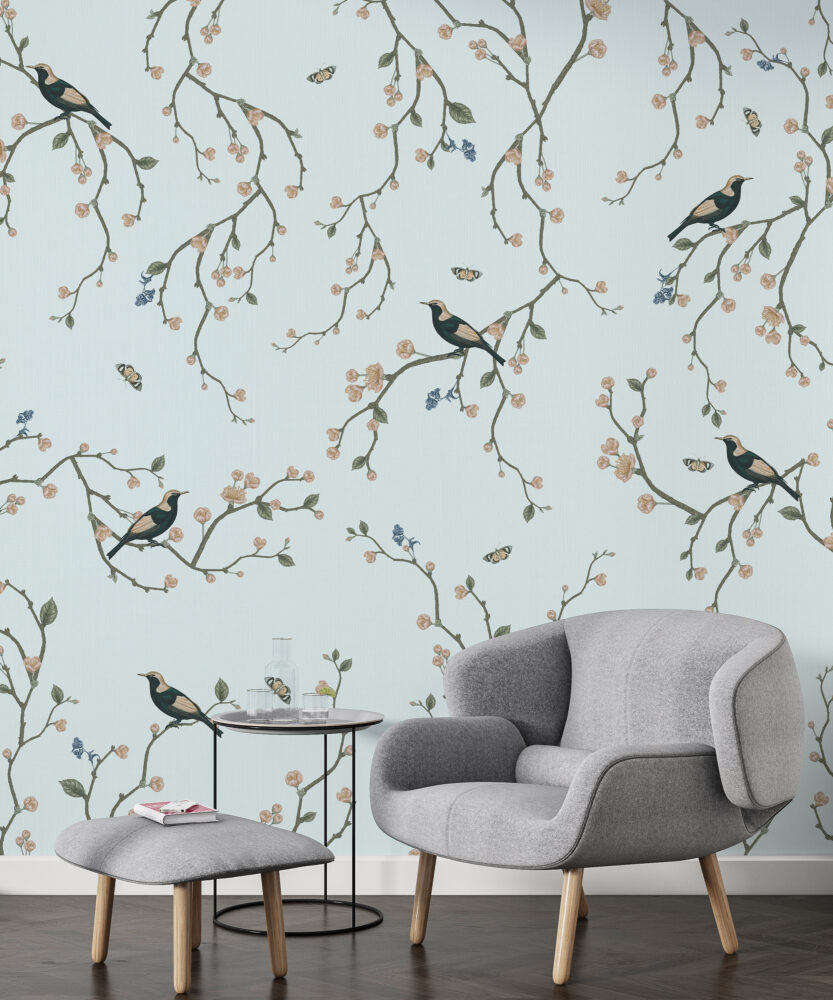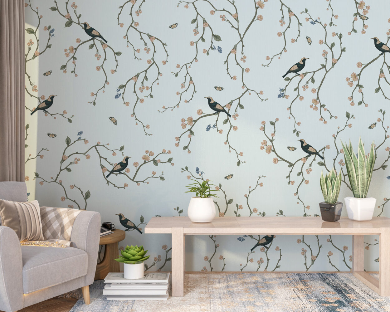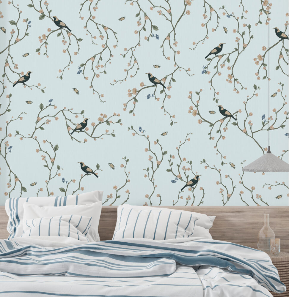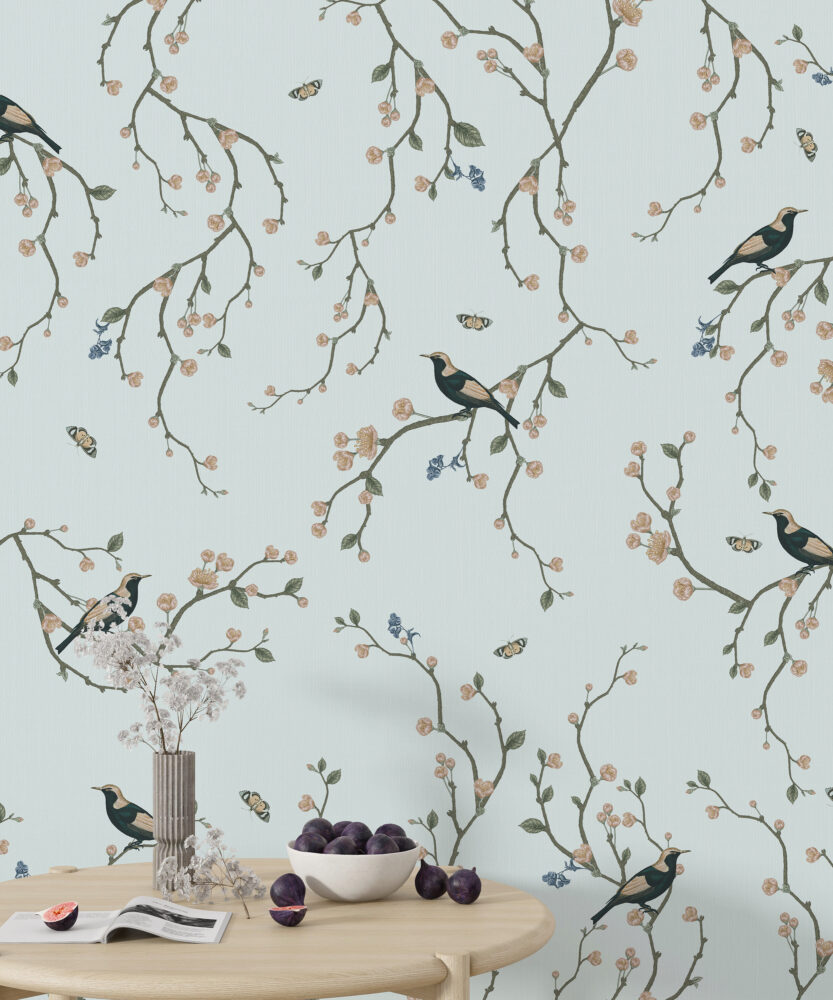 Kiraz Çiçekleri ve Kuşlar Mavi Duvar Kağıdı Duvar Kağıdı Ürün Bilgisi