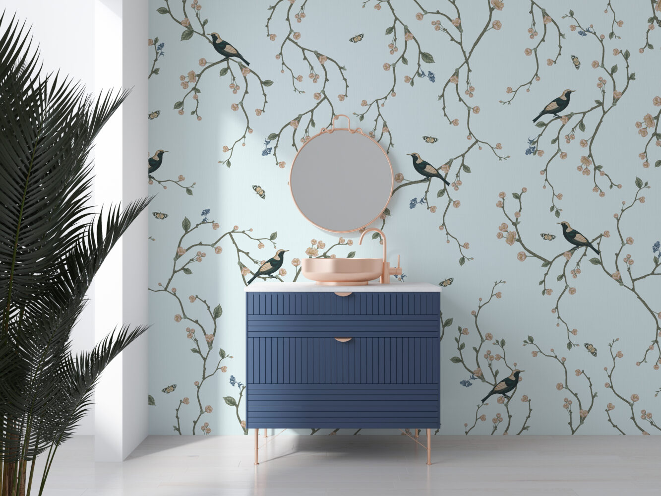 Kiraz Çiçekleri ve Kuşlar Mavi Duvar Kağıdı üretimi, uygulanmasını isteyeceğiniz boyut ve konumuna uygun olarak talepleriniz doğrultusunda size özel imal edilir.