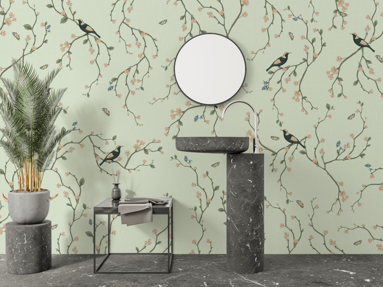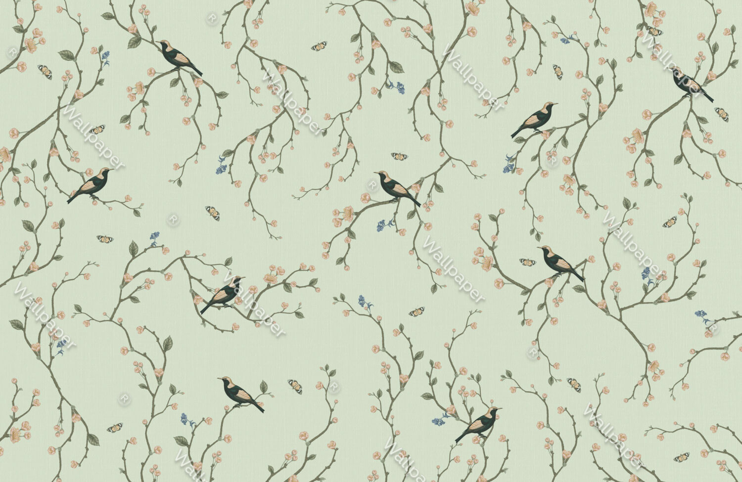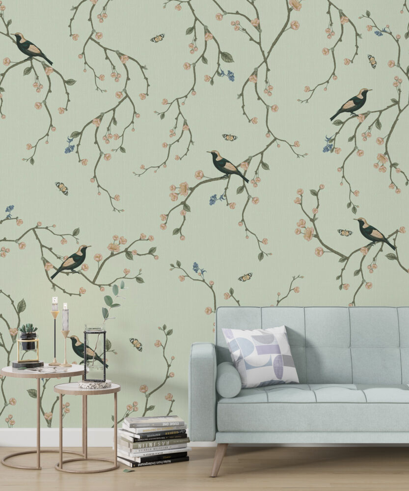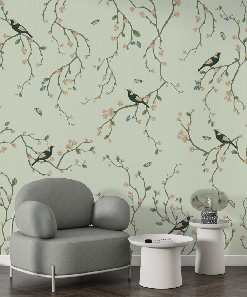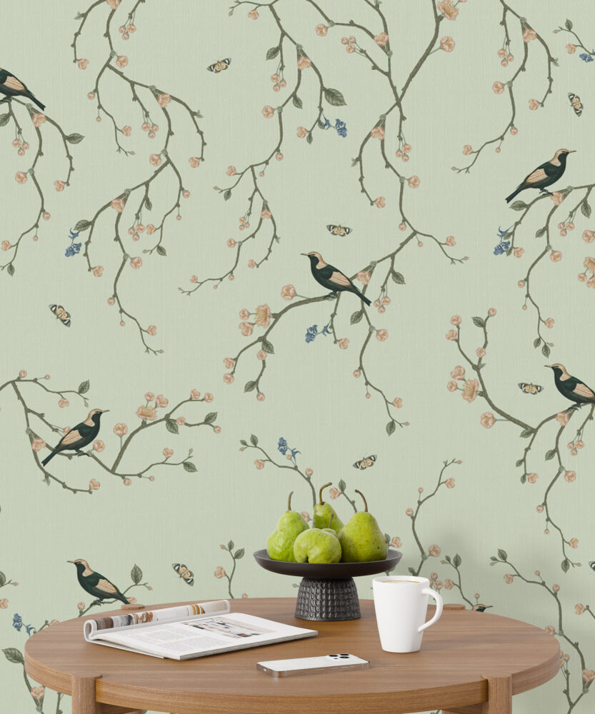 Kiraz Çiçekleri ve Kuşlar Yeşil Duvar Kağıdı Duvar Kağıdı Ürün Bilgisi