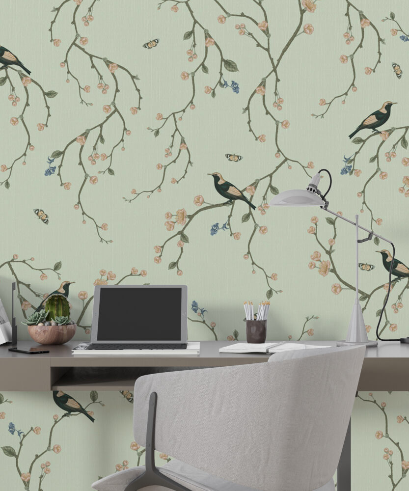 Kiraz Çiçekleri ve Kuşlar Yeşil Duvar Kağıdı üretimi, uygulanmasını isteyeceğiniz boyut ve konumuna uygun olarak talepleriniz doğrultusunda size özel imal edilir.