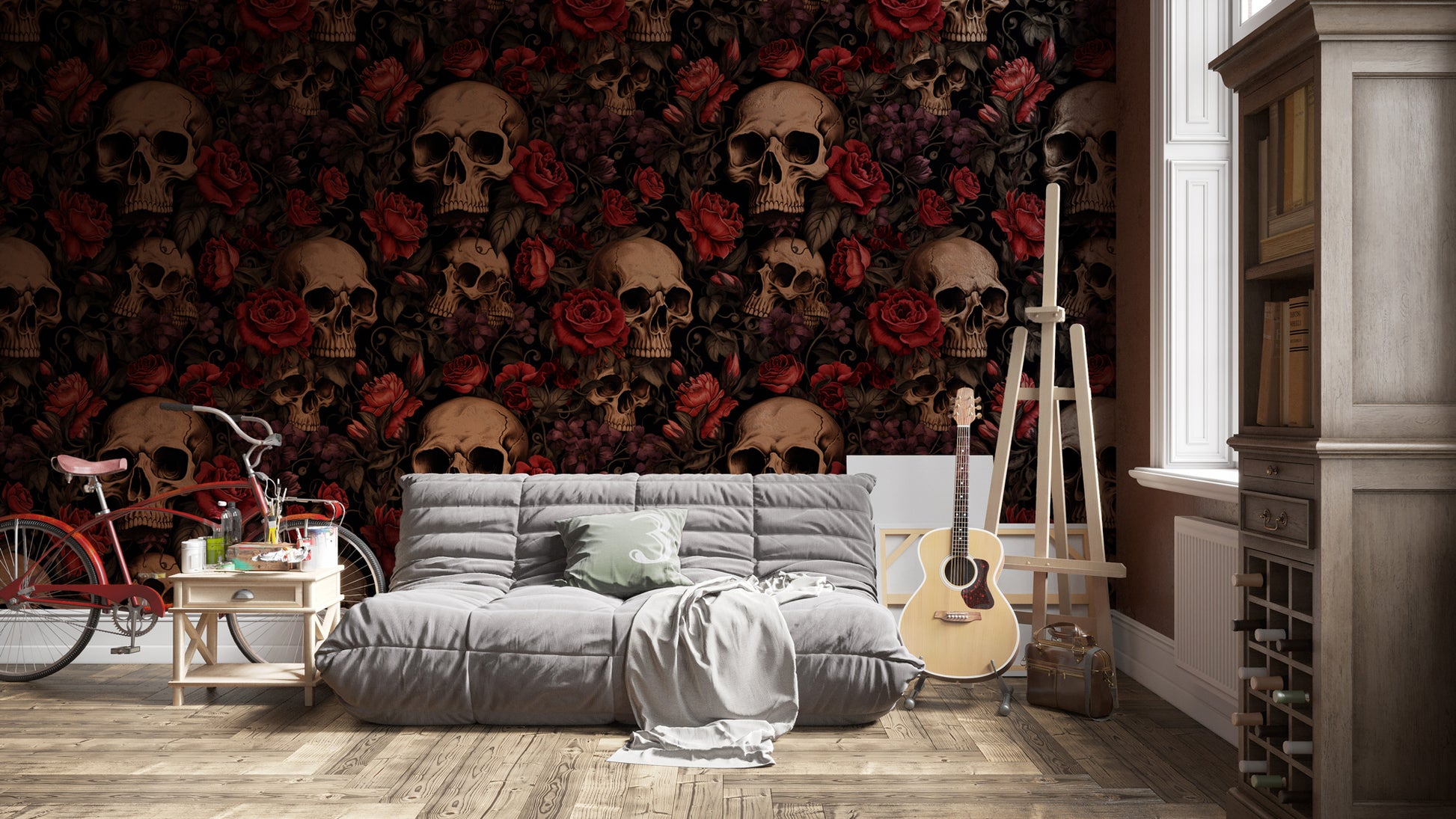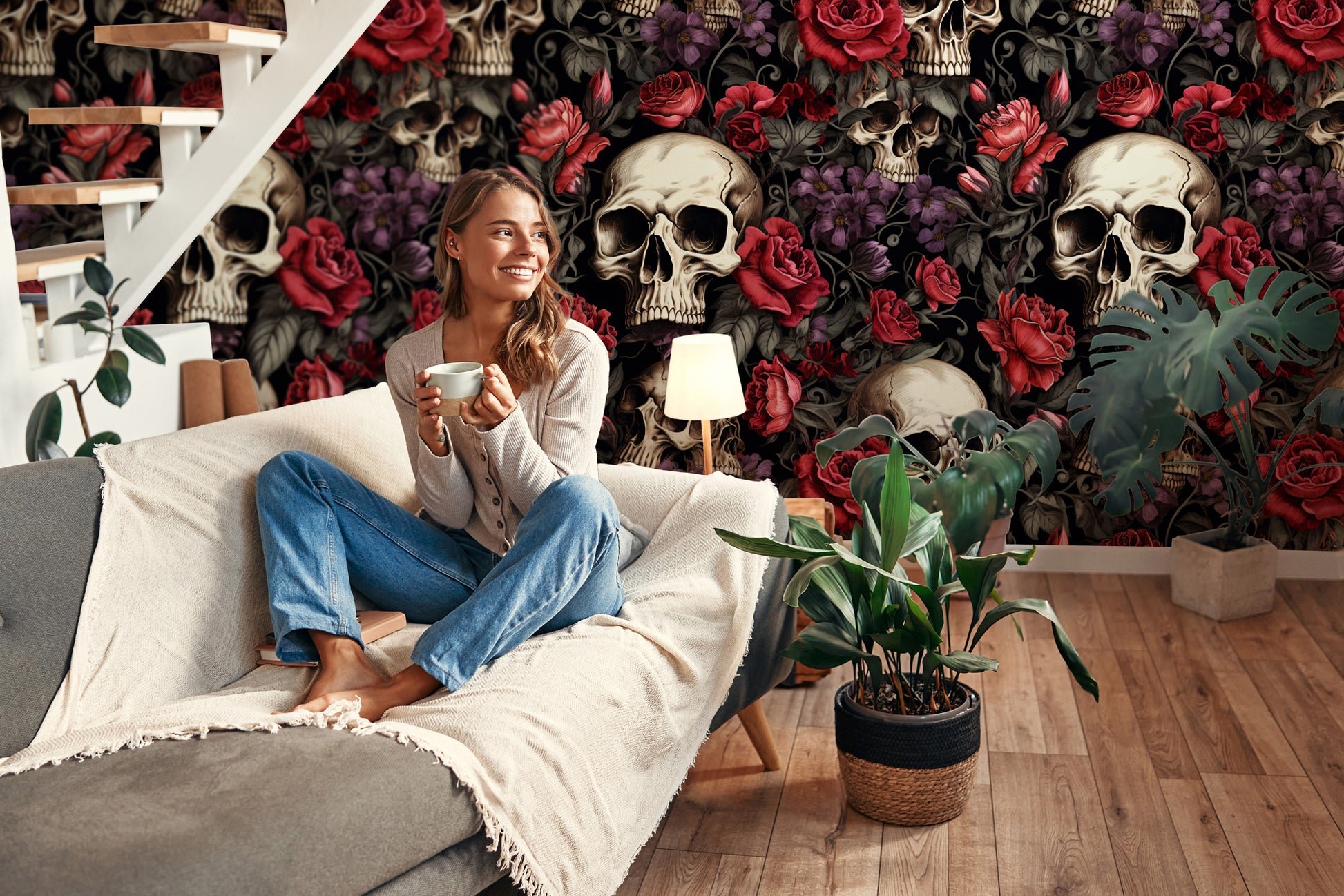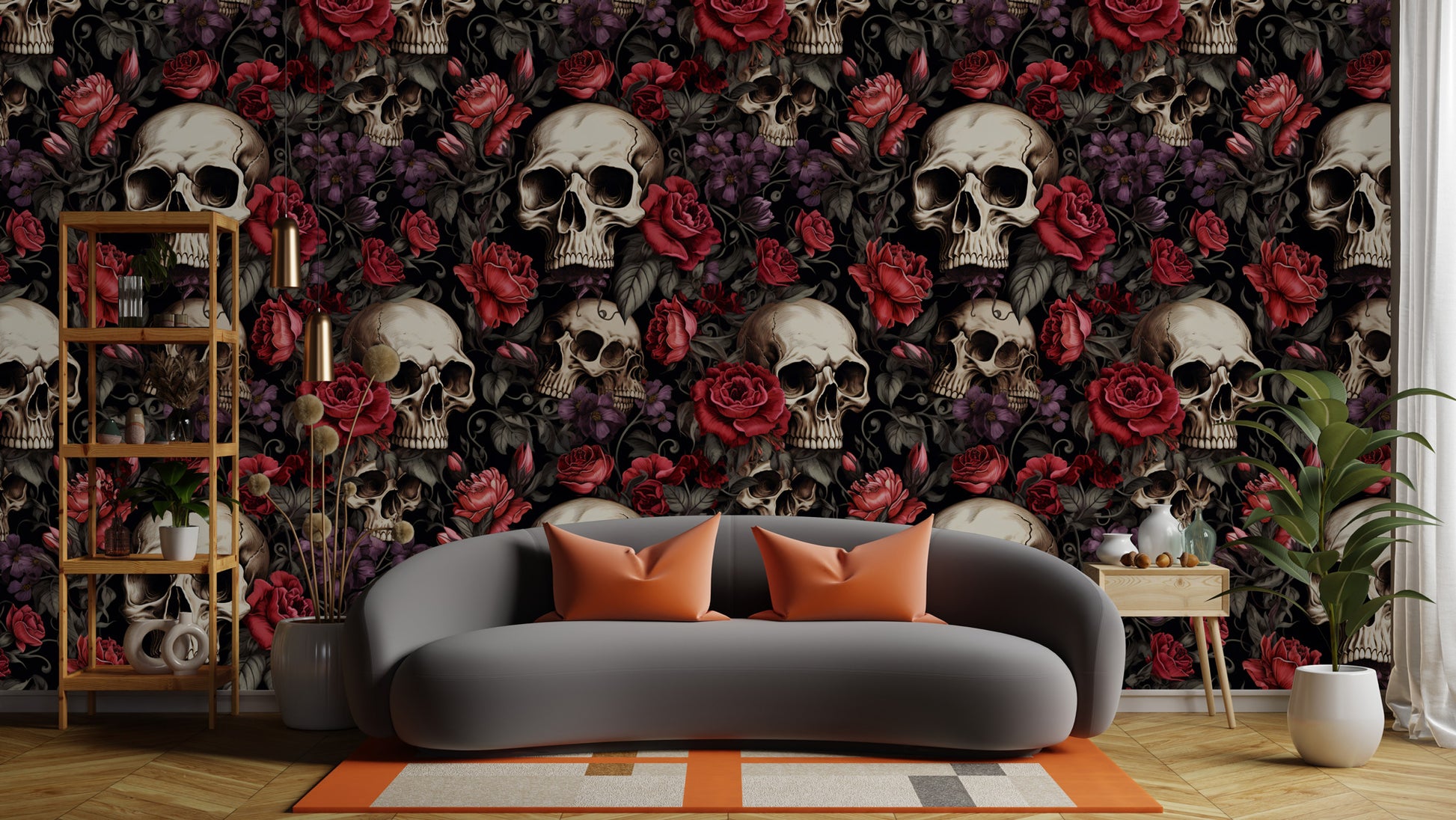 Kırmızı ve Mor Çiçekler Arasında Kafatası Duvar Kağıdı Duvar Kağıdı Ürün Bilgisi