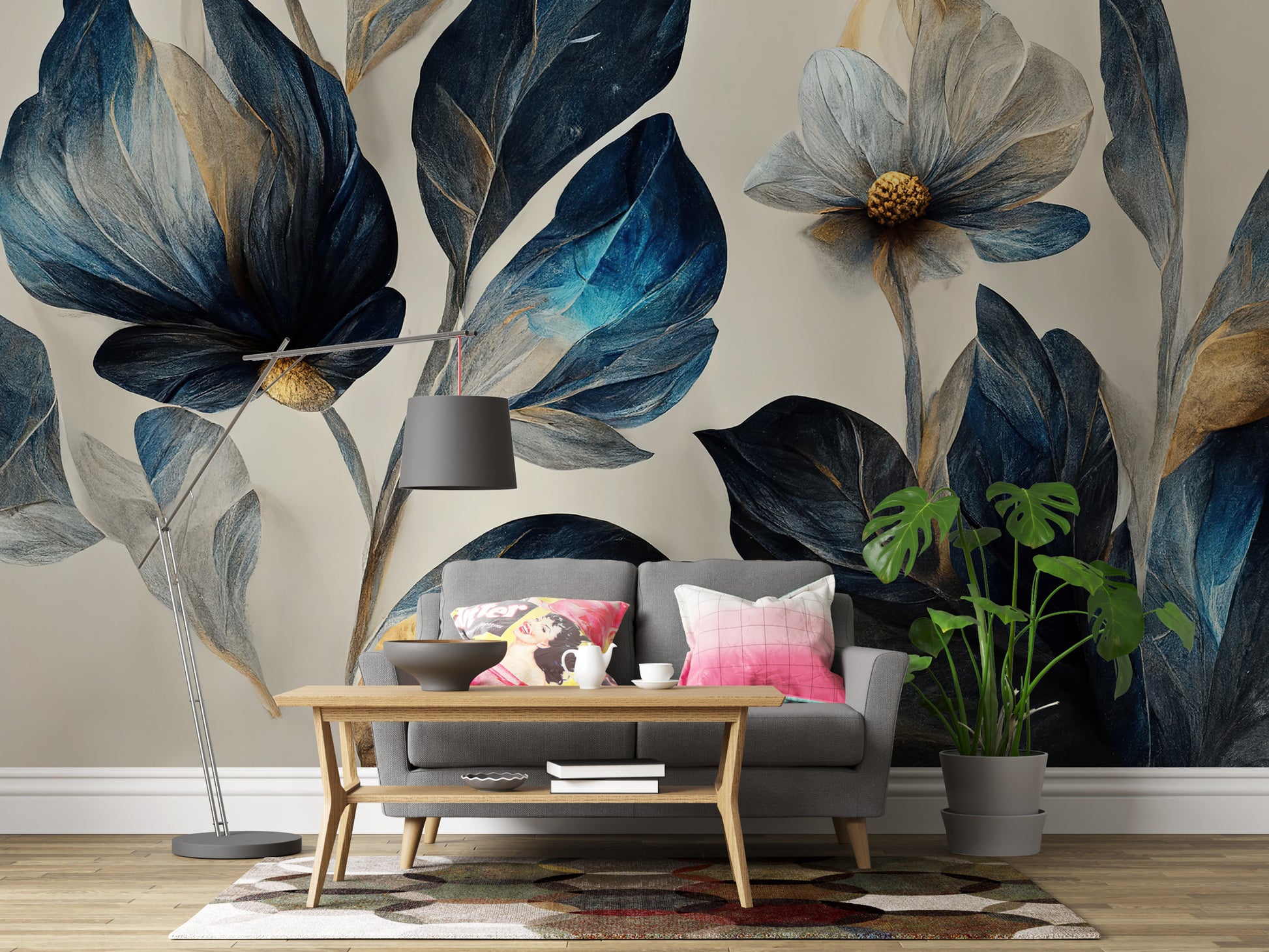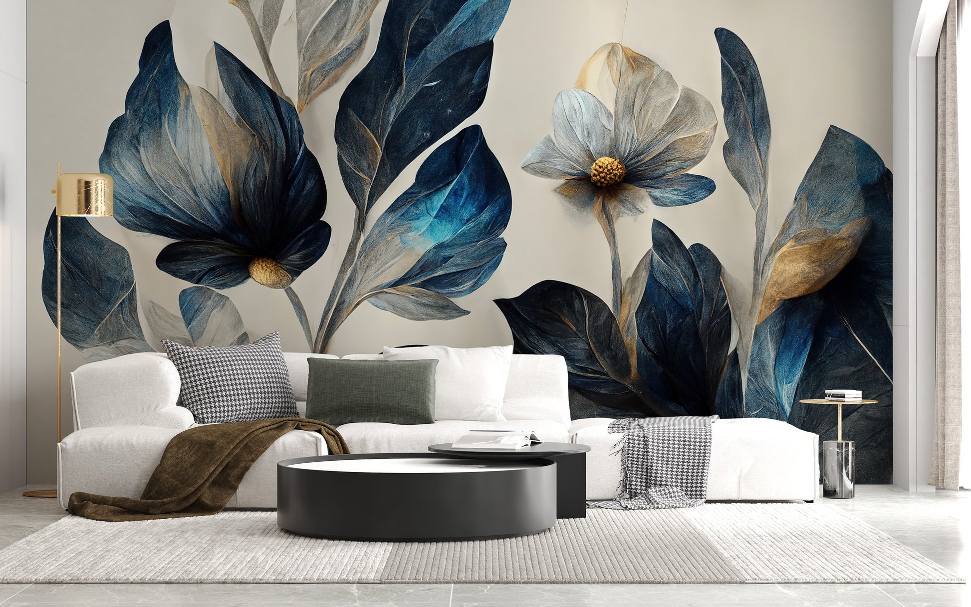Koyu Mavi ve Bej Çiçekler Duvar Kağıdı üretimi, uygulanmasını isteyeceğiniz boyut ve konumuna uygun olarak talepleriniz doğrultusunda size özel imal edilir.