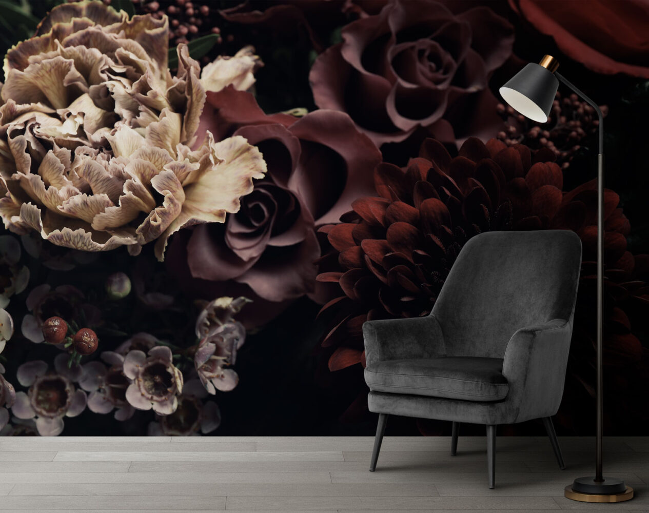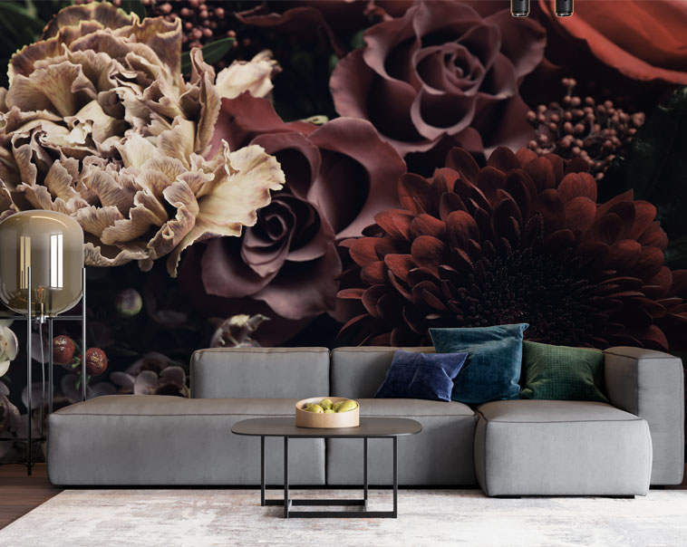 Koyu Renk Çiçekler 3D Duvar Kağıdı üretimi, uygulanmasını isteyeceğiniz boyut ve konumuna uygun olarak talepleriniz doğrultusunda size özel imal edilir.