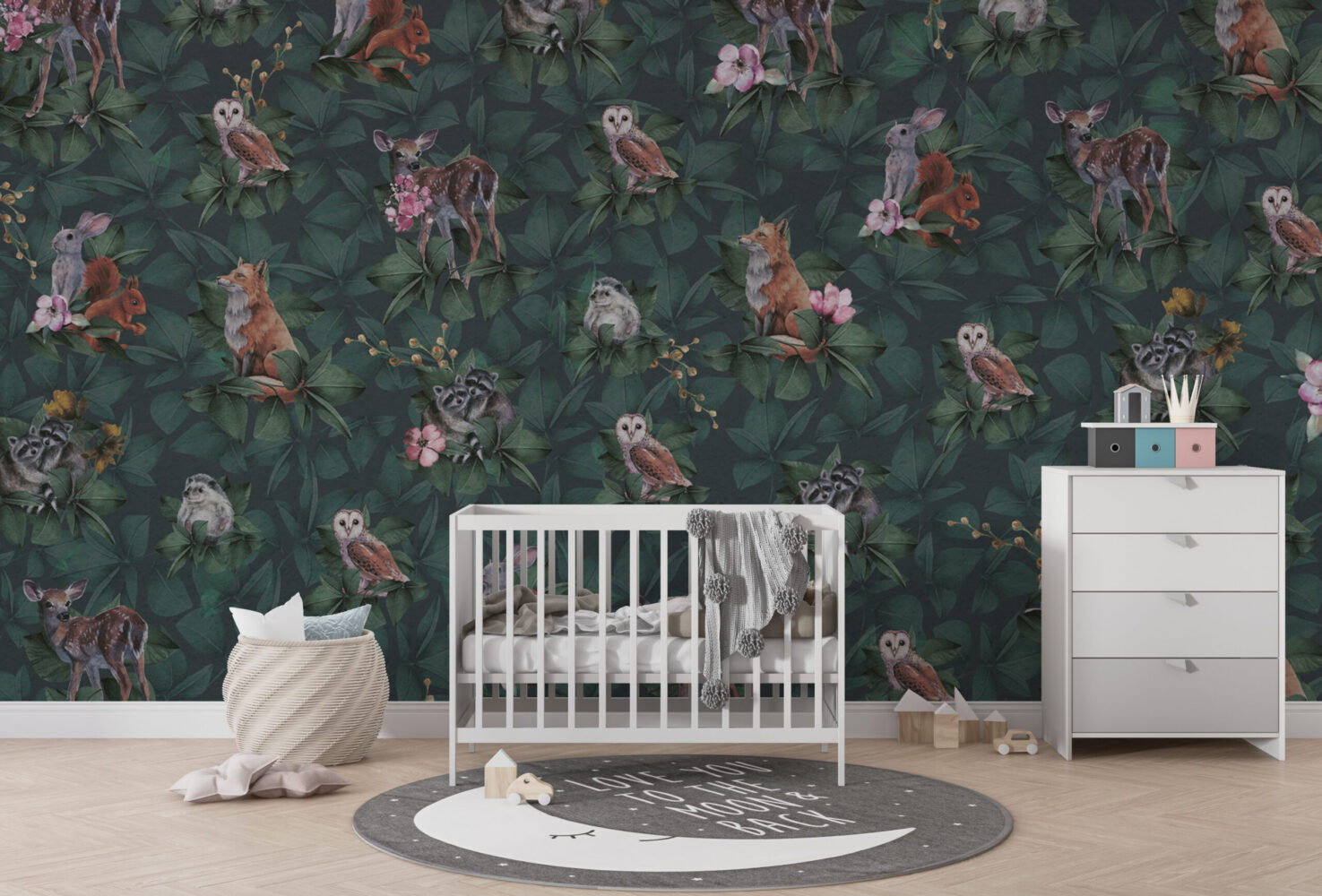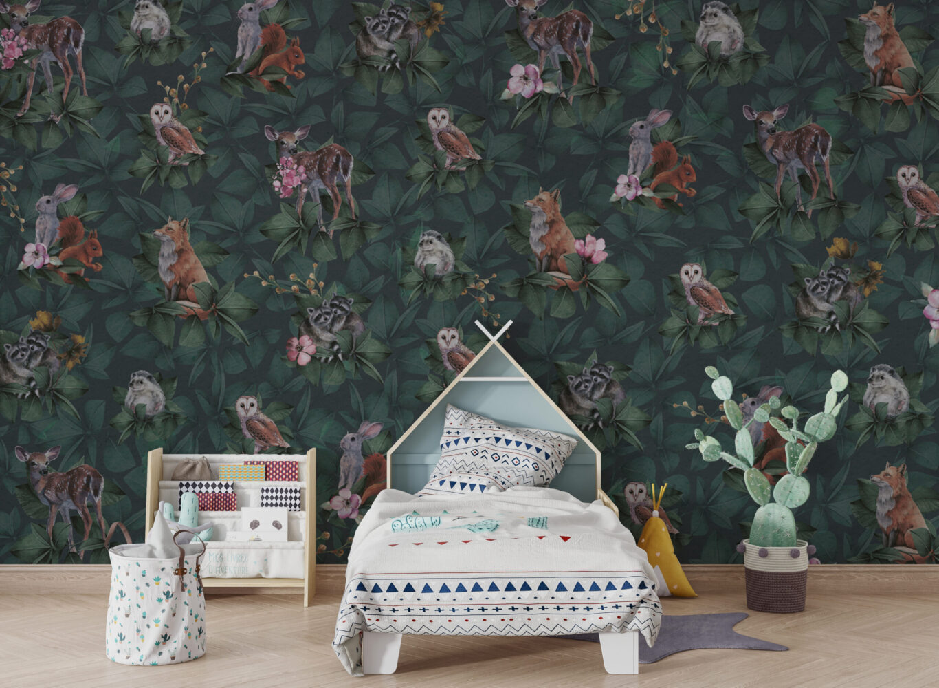 Koyu Tonlar'da Hayvan Ve Yaprak Desenli 3D Duvar Kağıdı