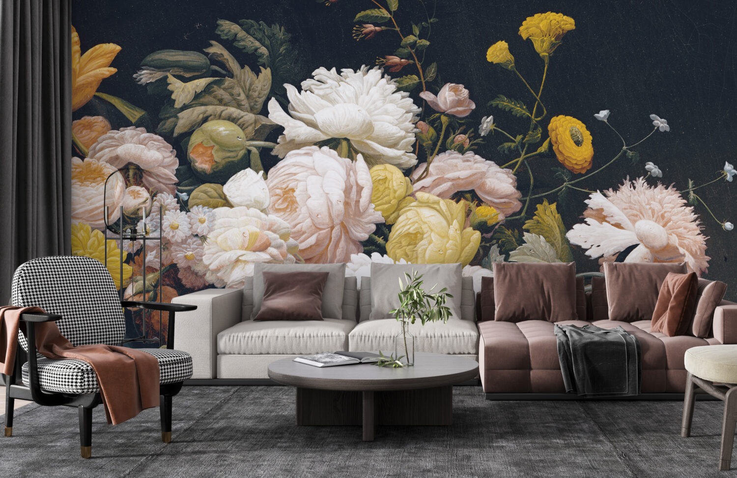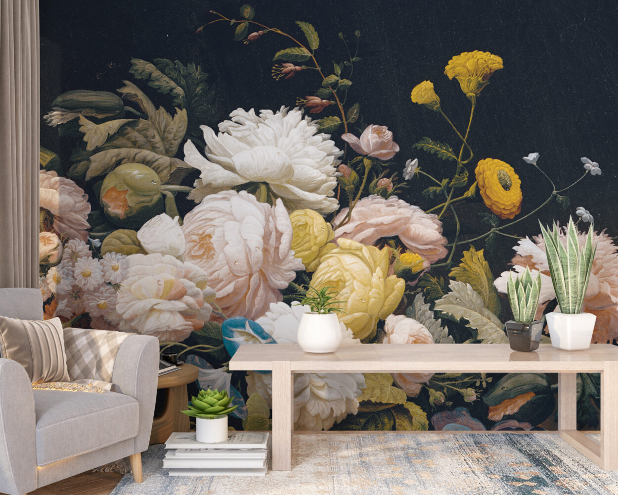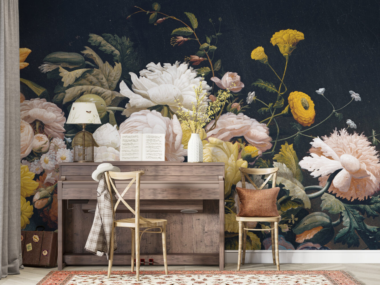 Koyu Zeminli Eskitmeli Çiçekler Duvar Kağıdı