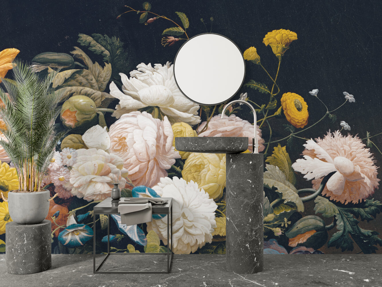 Koyu Zeminli Eskitmeli Çiçekler Duvar Kağıdı üretimi, uygulanmasını isteyeceğiniz boyut ve konumuna uygun olarak talepleriniz doğrultusunda size özel imal edilir.