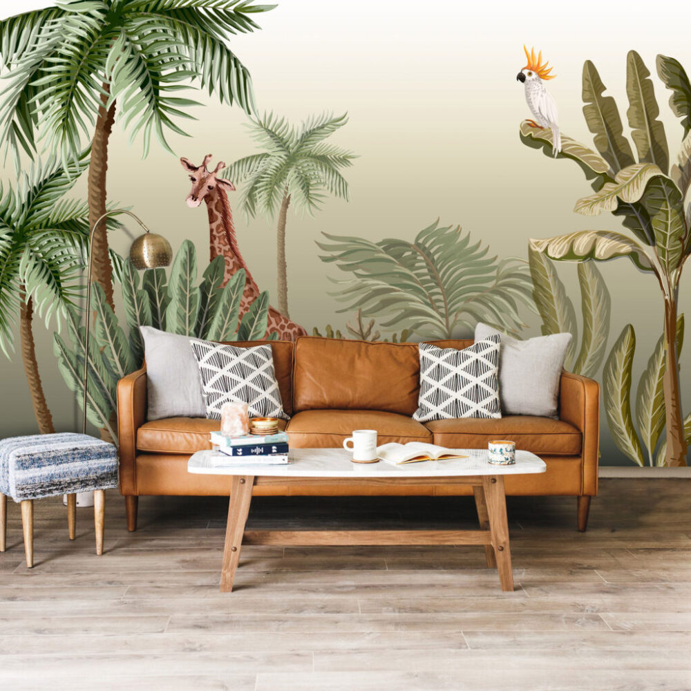 Krem Tonların'da Ağacın Etrafında Duran Papağan ve Zürafa Desenli 3D Duvar Kağıdı | Duvar Kağıdı Marketi üretimi, uygulanmasını isteyeceğiniz boyut ve konumuna uygun olarak talepleriniz doğrultusunda size özel imal edilir.