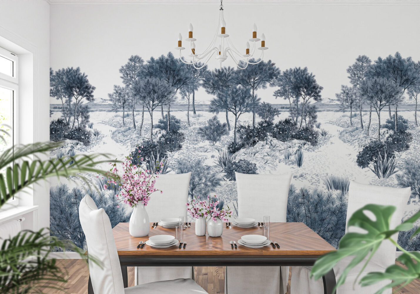 Mavi Ağaçlı Doğal Görünümlü 3D Duvar Kağıdı
