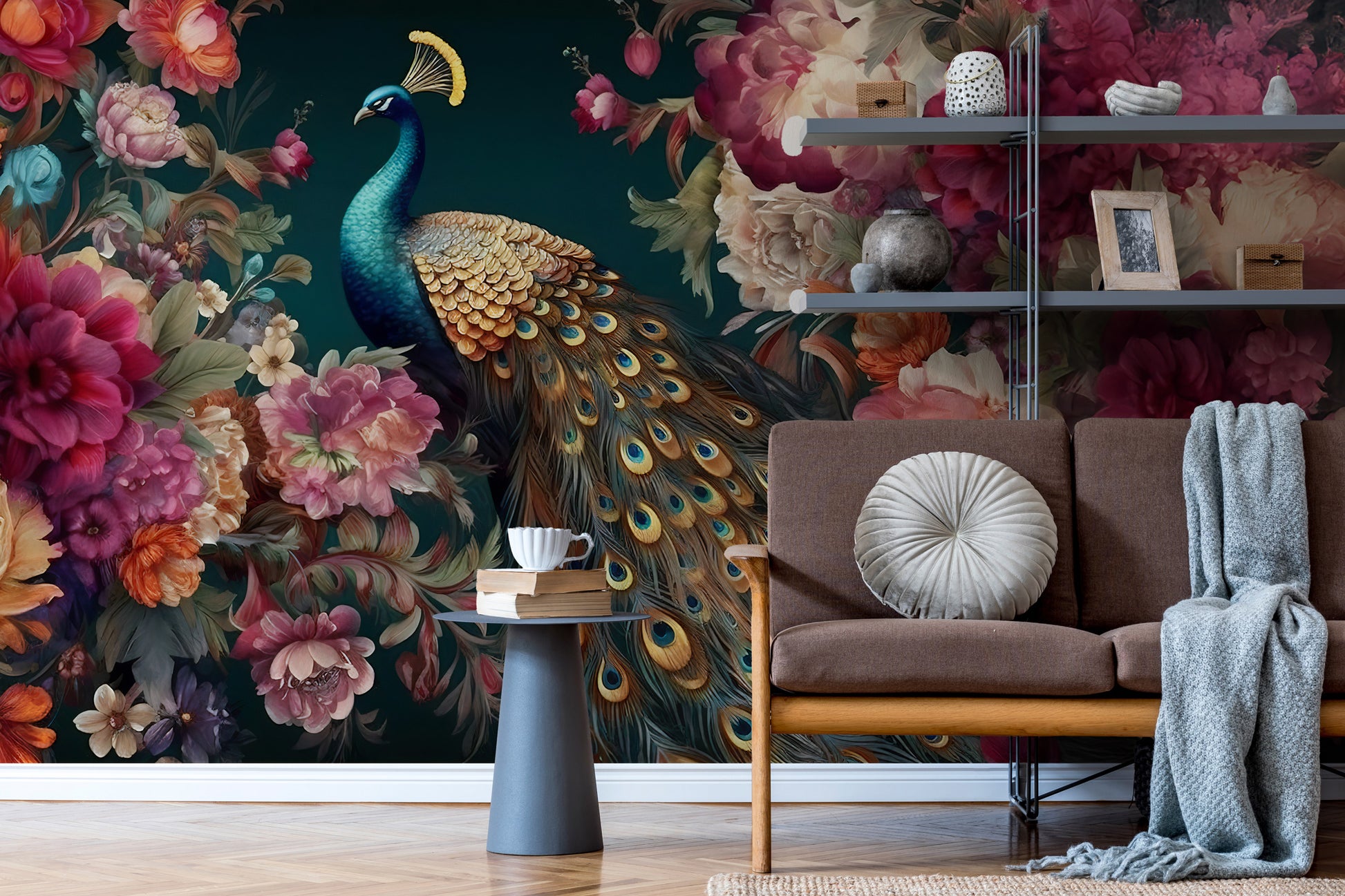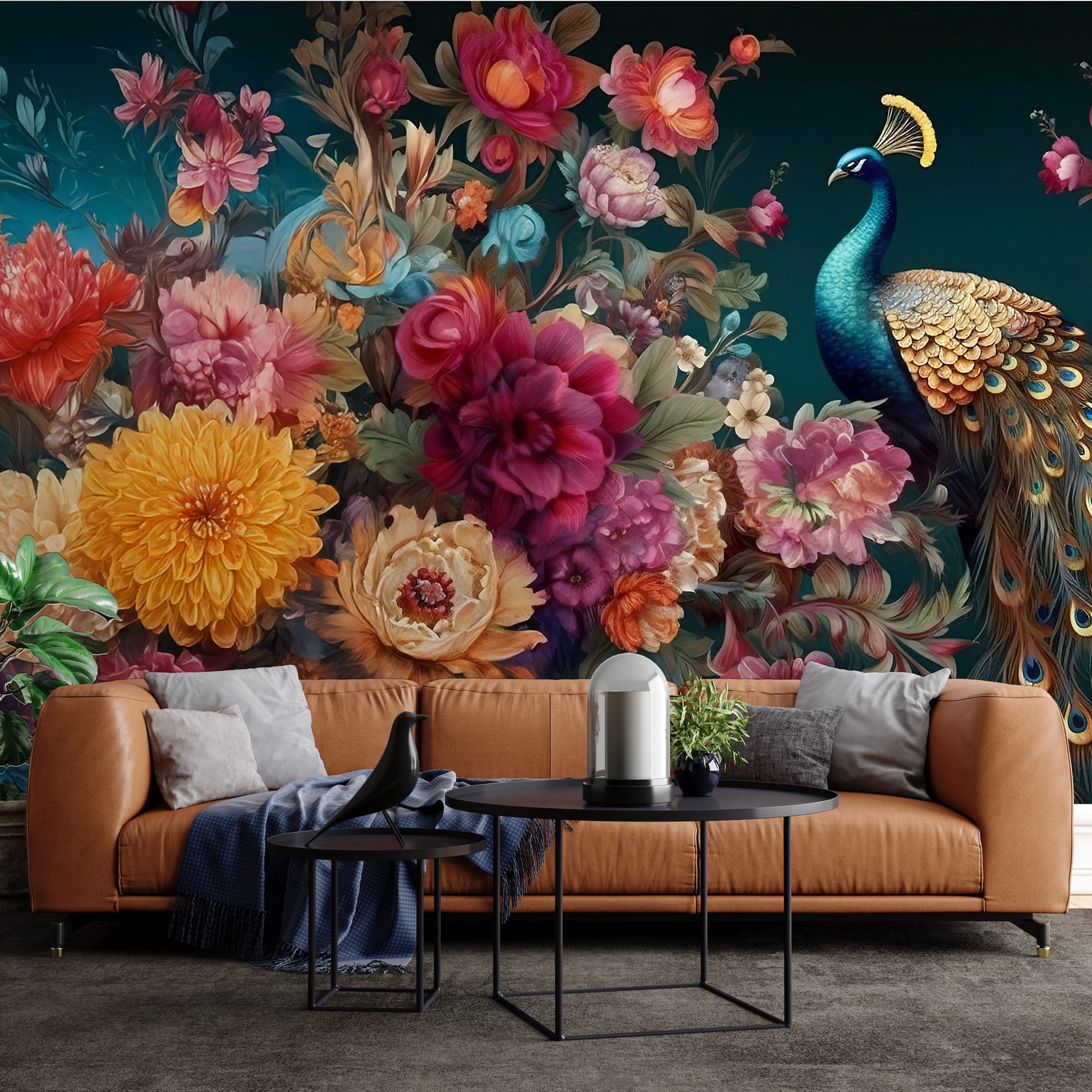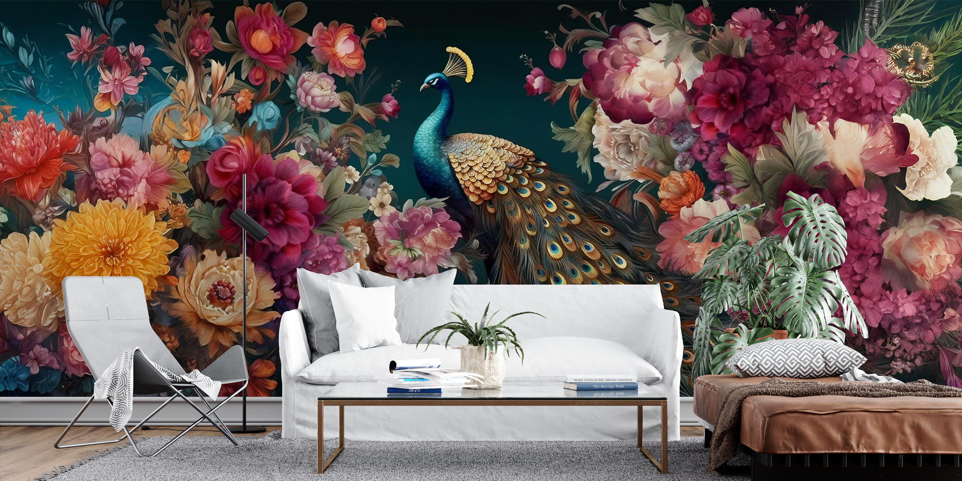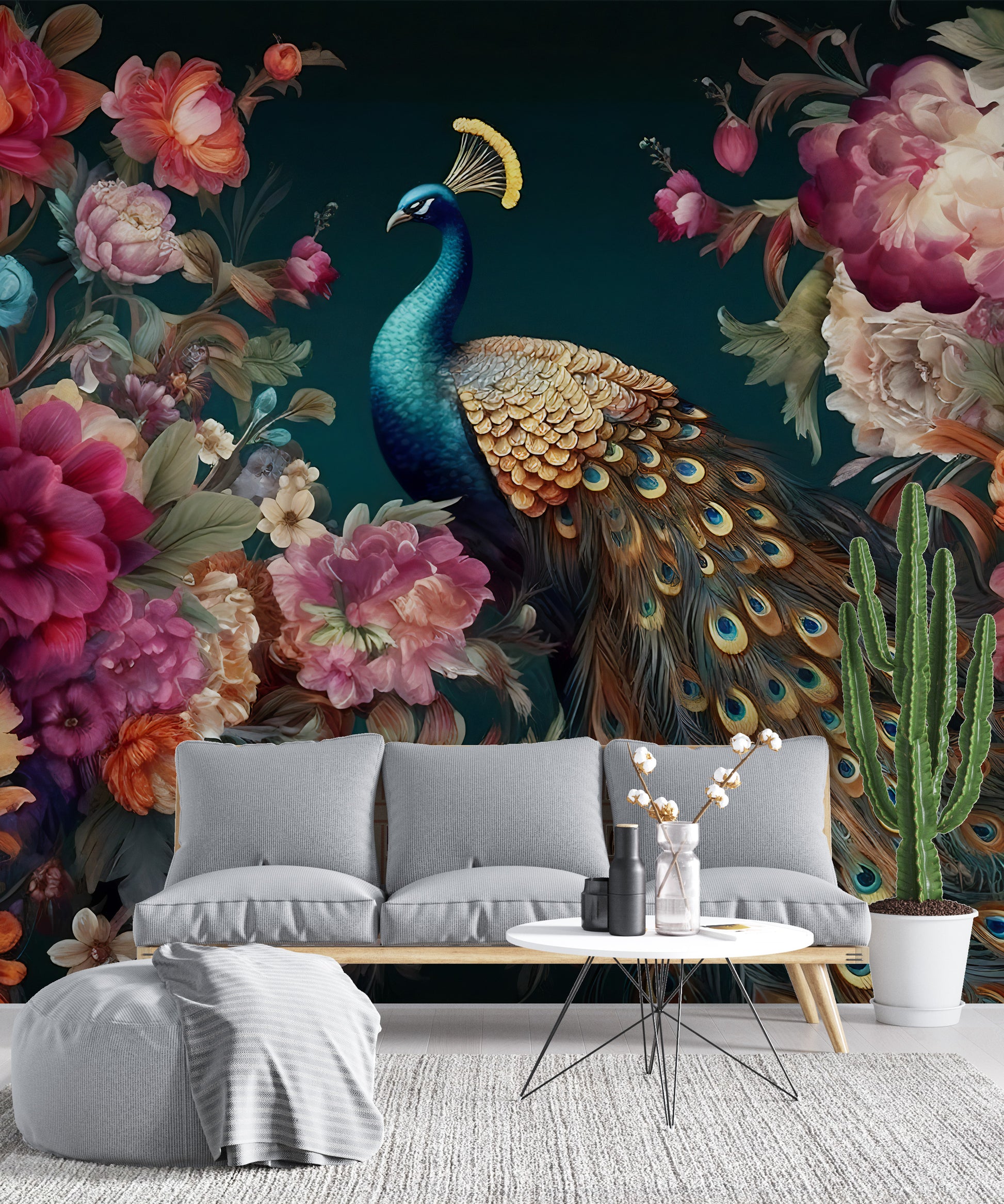 Mavi Tavus Kuşu ve Pembe Çiçekler Duvar Kağıdı üretimi, uygulanmasını isteyeceğiniz boyut ve konumuna uygun olarak talepleriniz doğrultusunda size özel imal edilir.