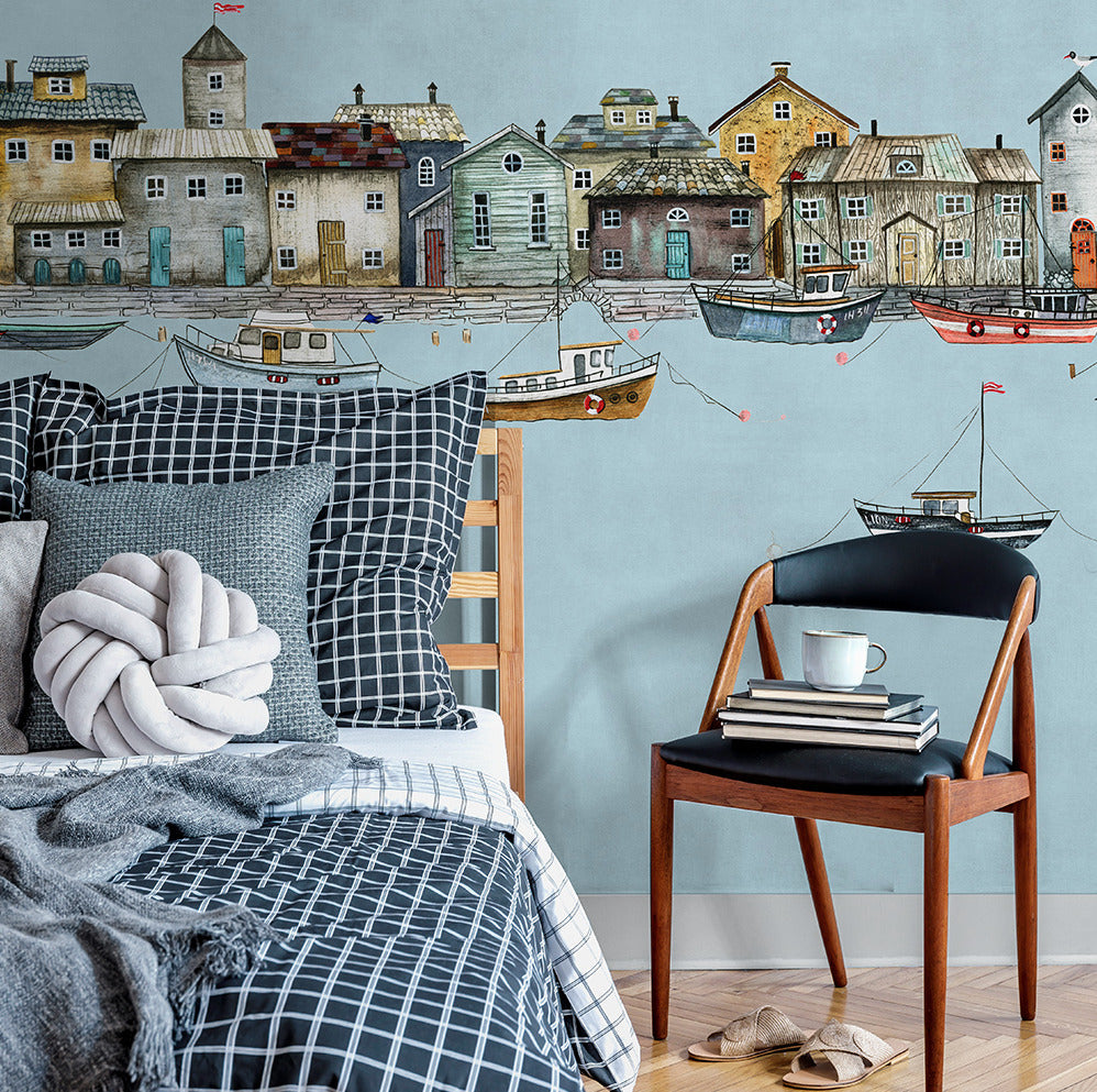 Mavi Tonlar'da Küçük Evler Denizci Konseptinde 3D Duvar Kağıdı Duvar Kağıdı Ürün Bilgisi