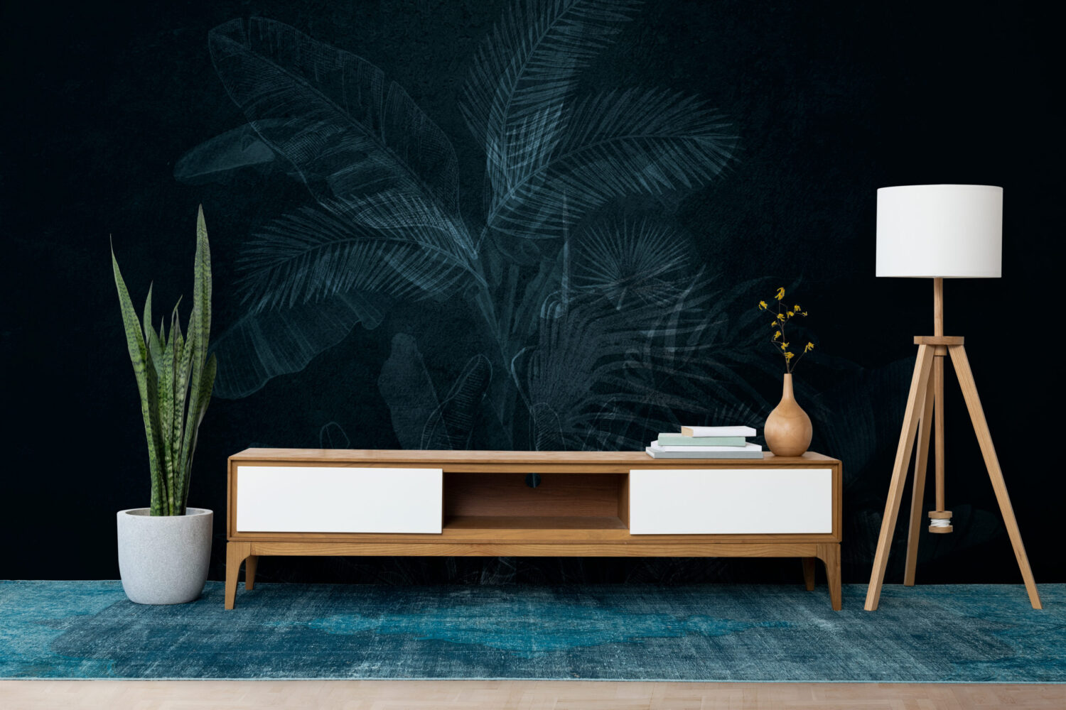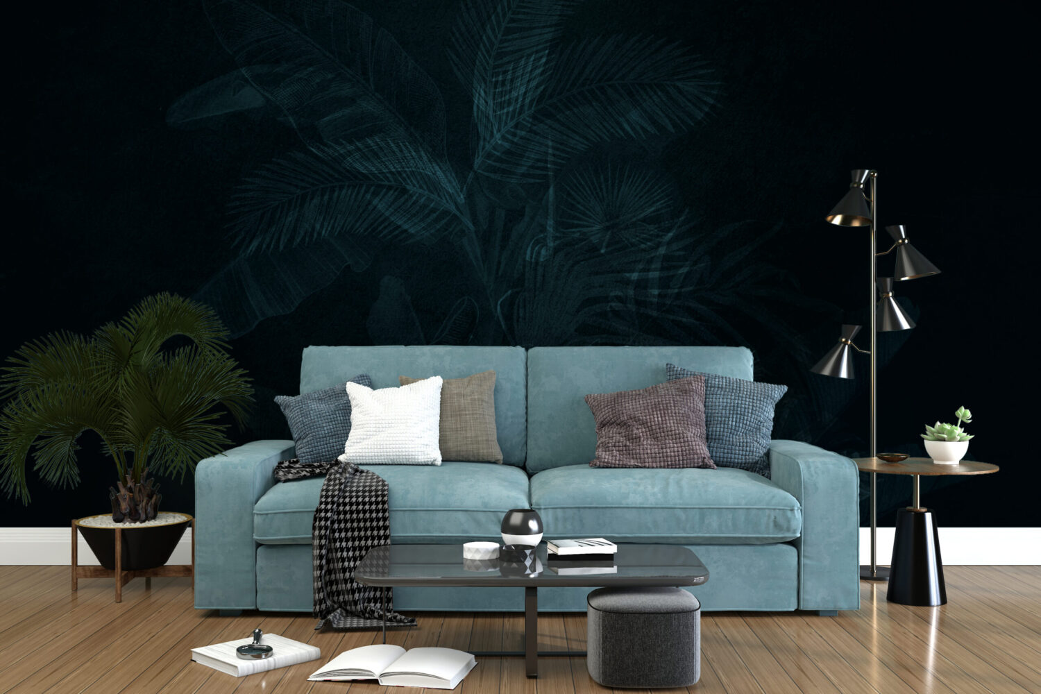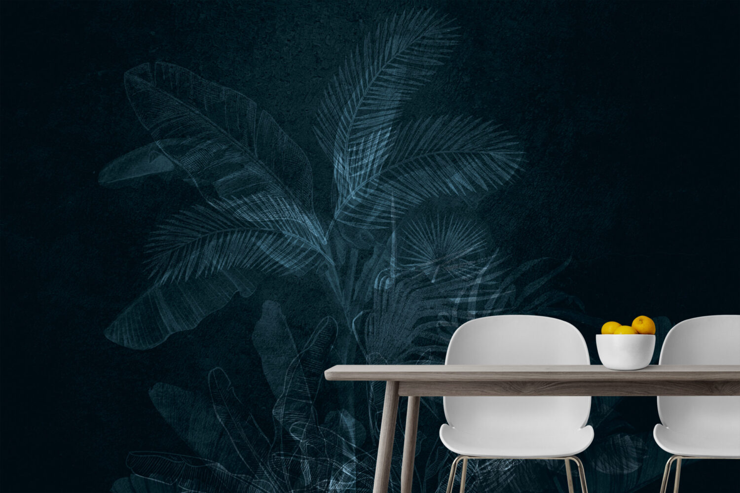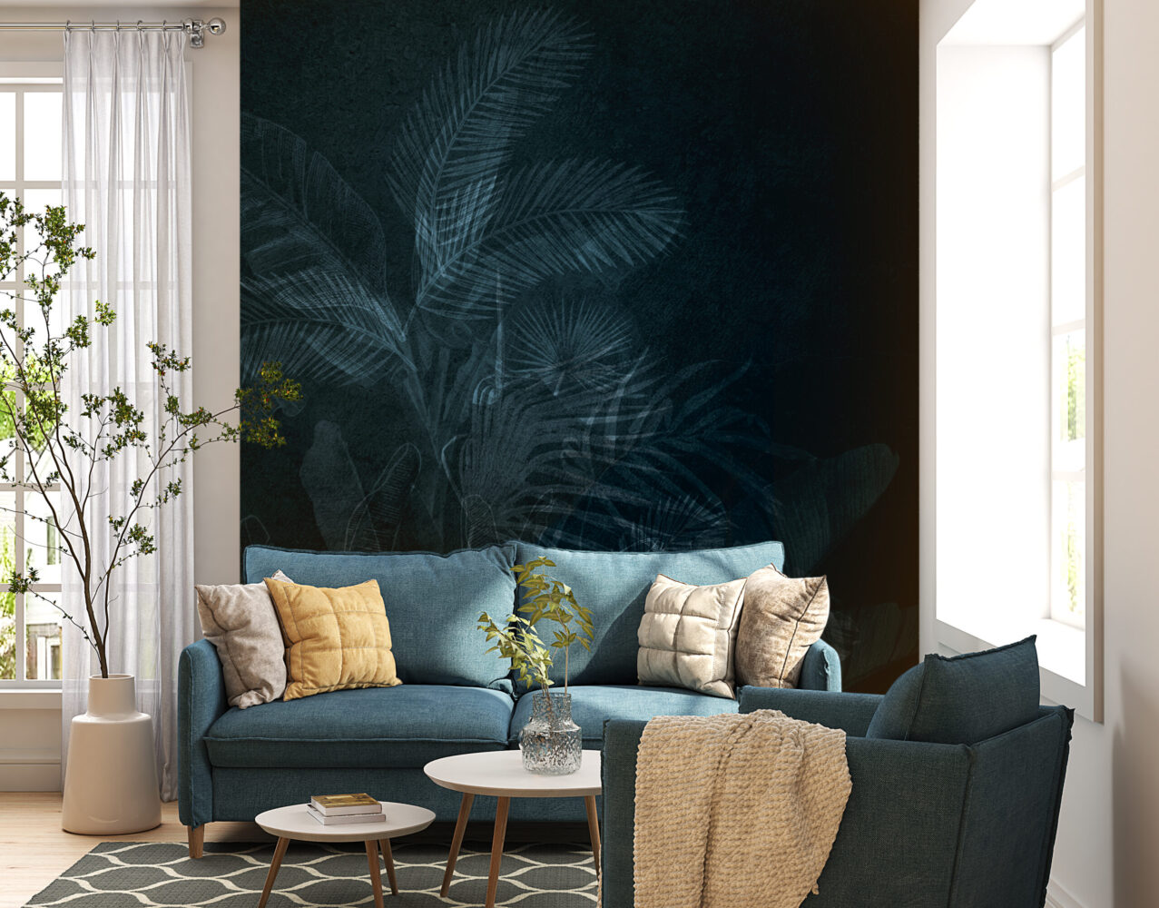 Mavi Tonlar'da Tropikal Yapraklar Duvar Kağıdı üretimi, uygulanmasını isteyeceğiniz boyut ve konumuna uygun olarak talepleriniz doğrultusunda size özel imal edilir.
